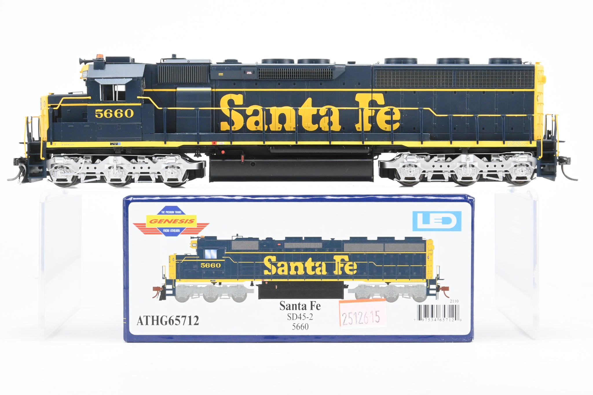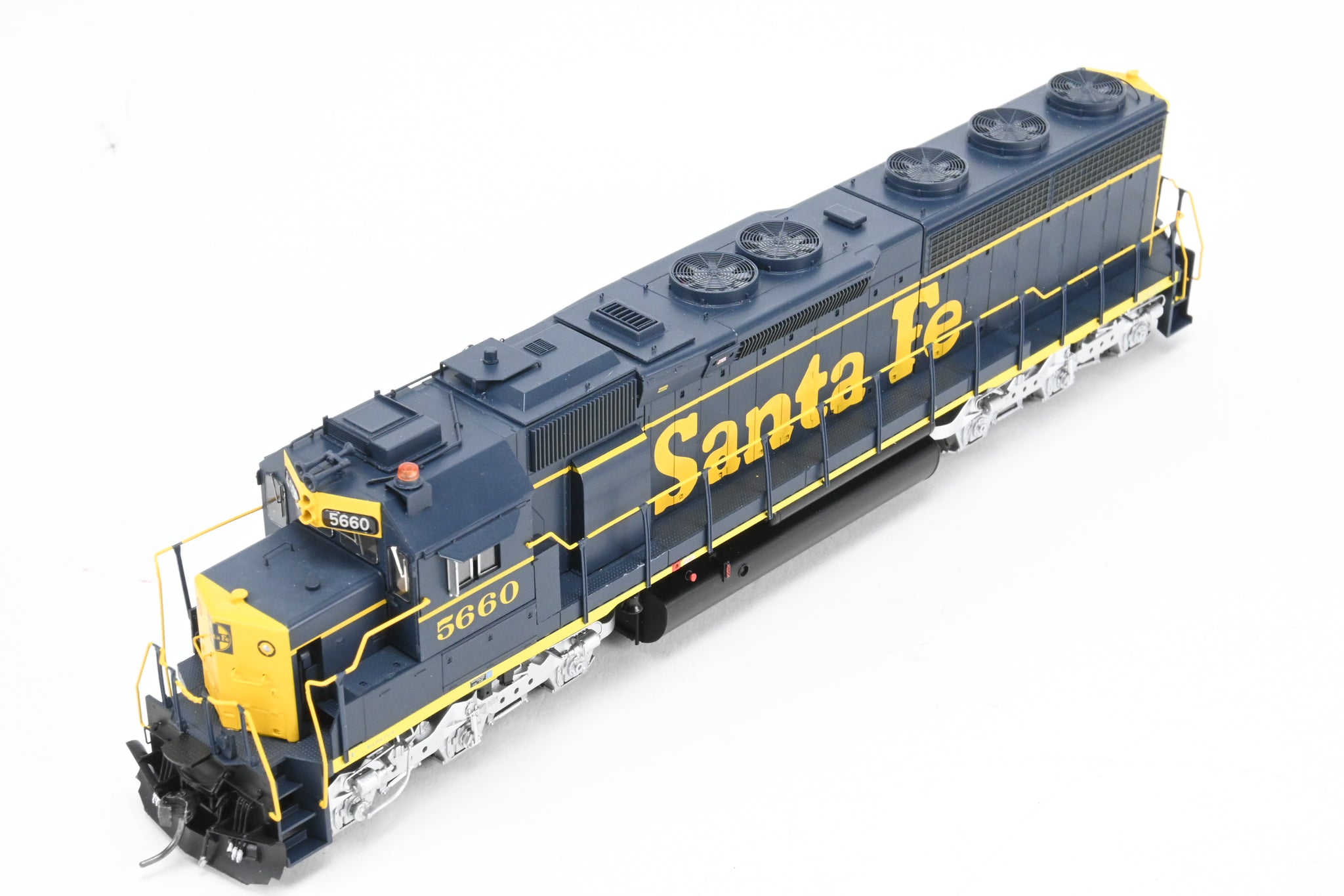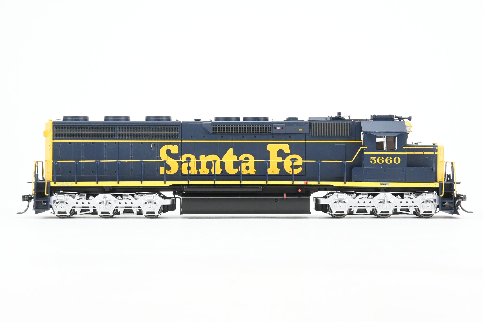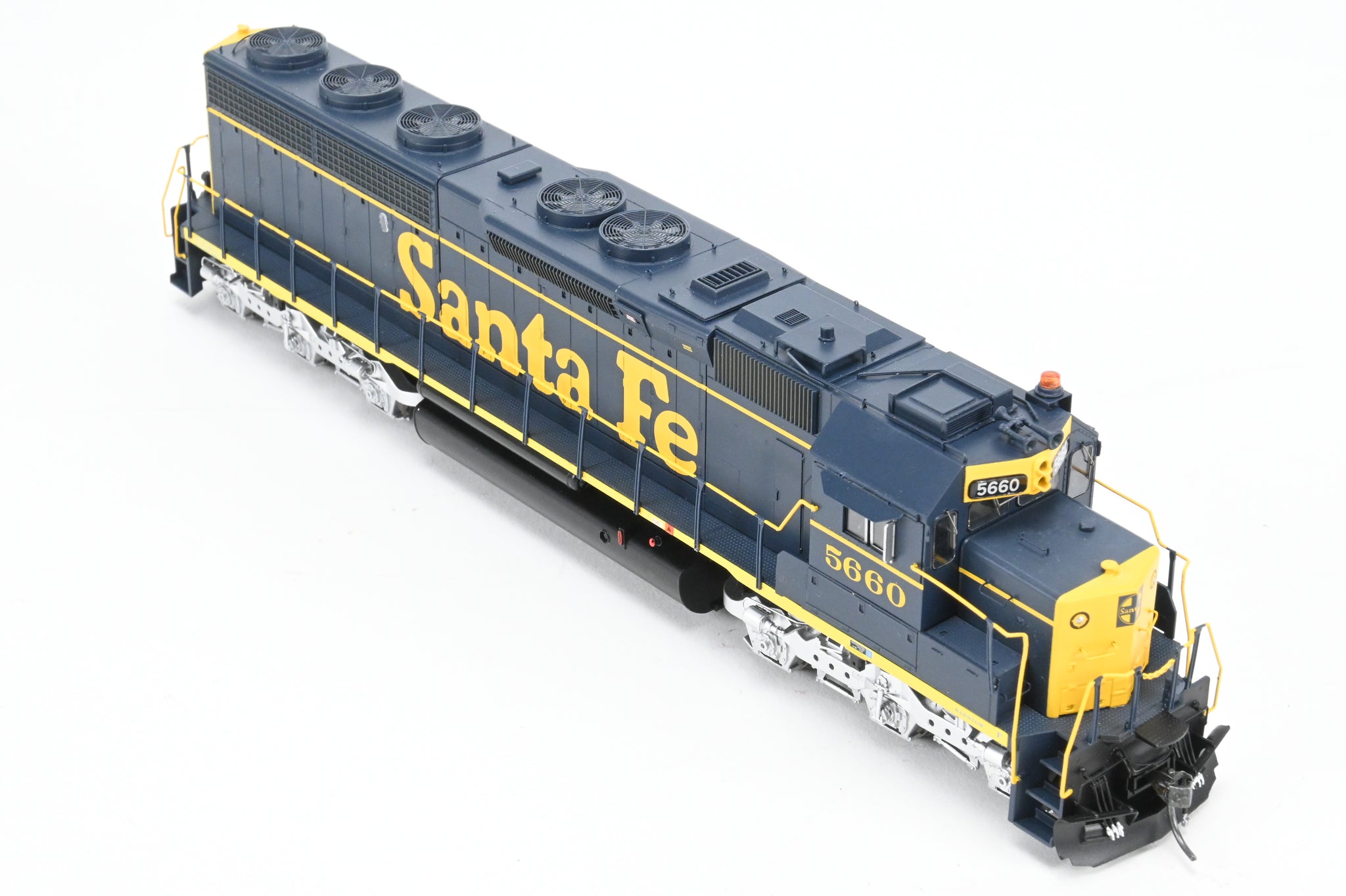 Genesis product line. Boxes shows minimal shelf wear. No spare parts included. This SD45-2 is painted in Santa Fe's Blue Yellow pinstripe. Paintwork is excellent. Model has an ESU LokPilot decoder installed. Address is #5660. A nice model.