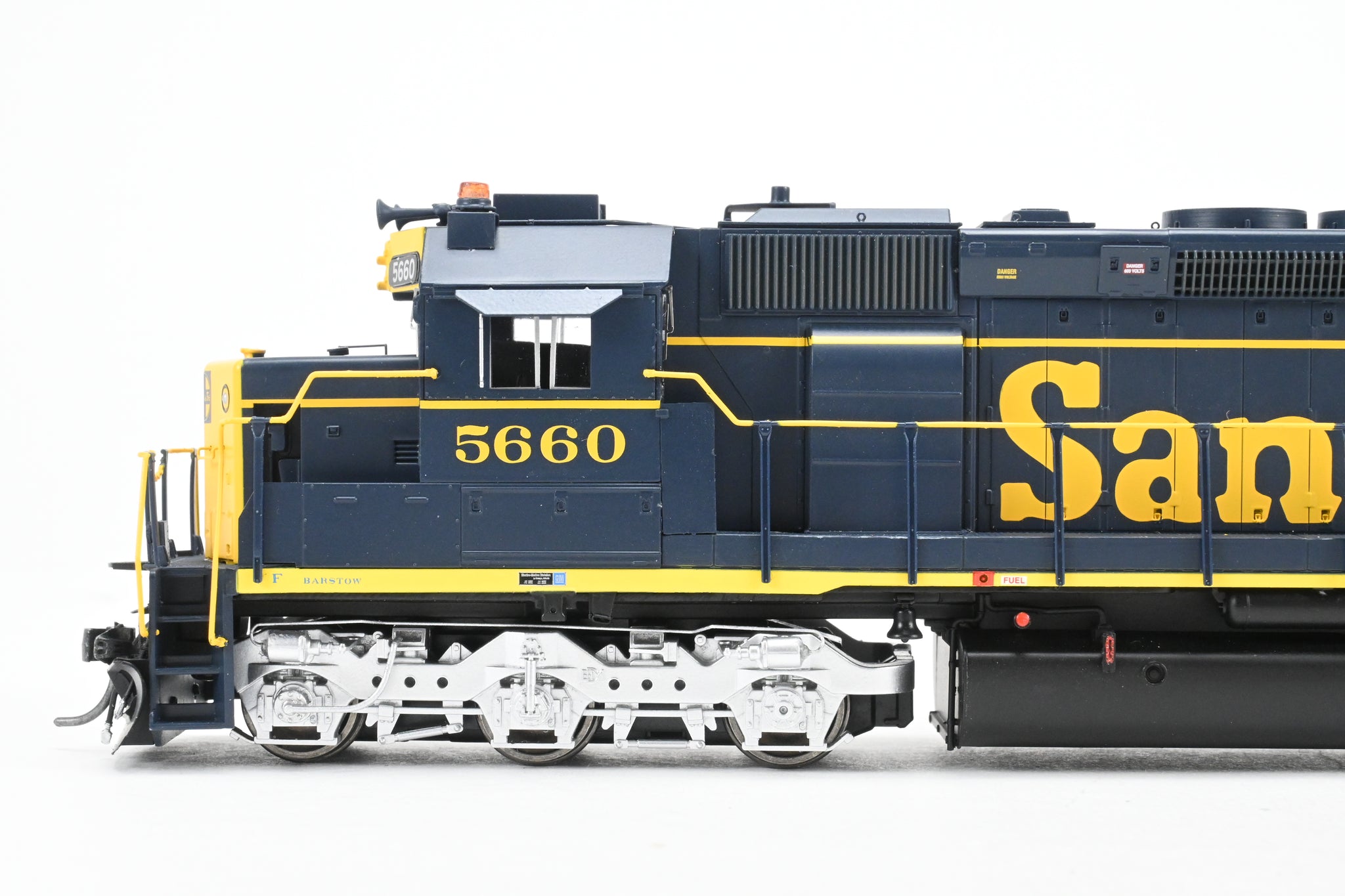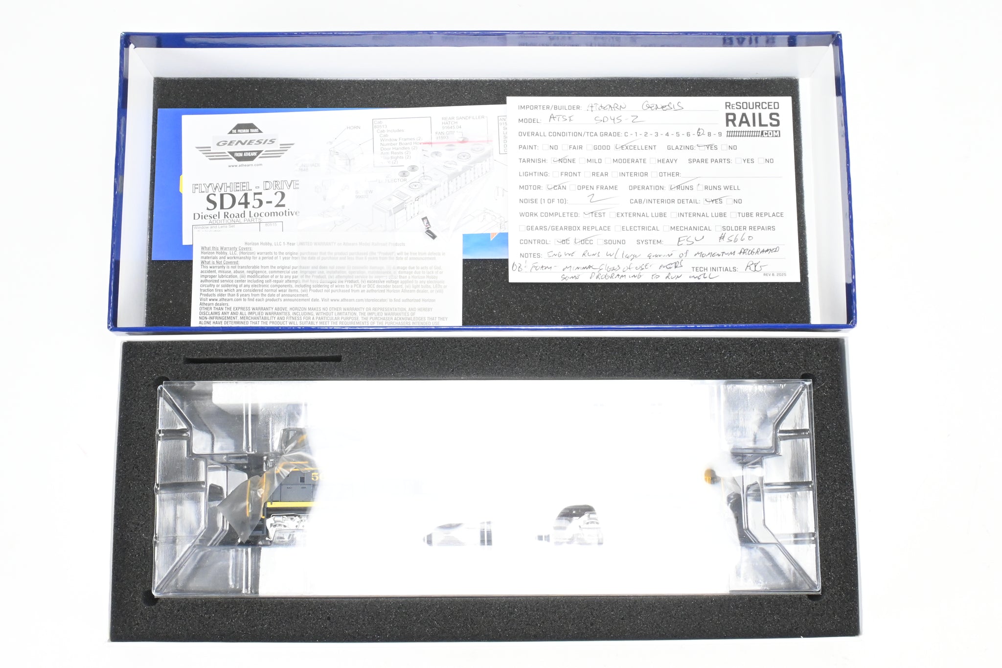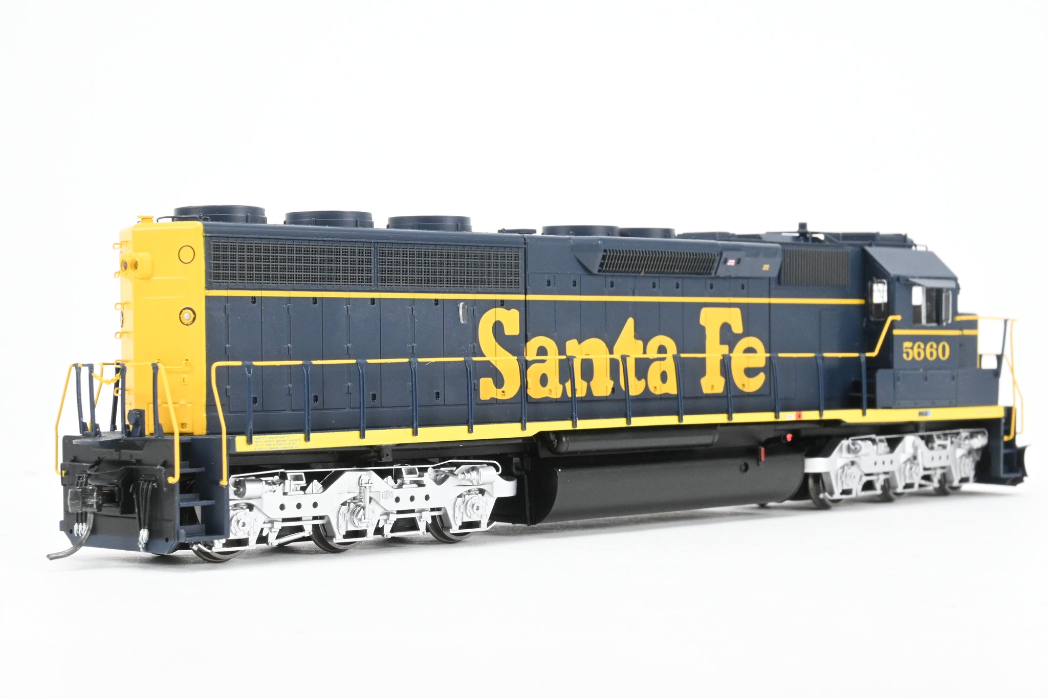 Genesis product line. Boxes shows minimal shelf wear. No spare parts included. This SD45-2 is painted in Santa Fe's Blue Yellow pinstripe. Paintwork is excellent. Model has an ESU LokPilot decoder installed. Address is #5660. A nice model.