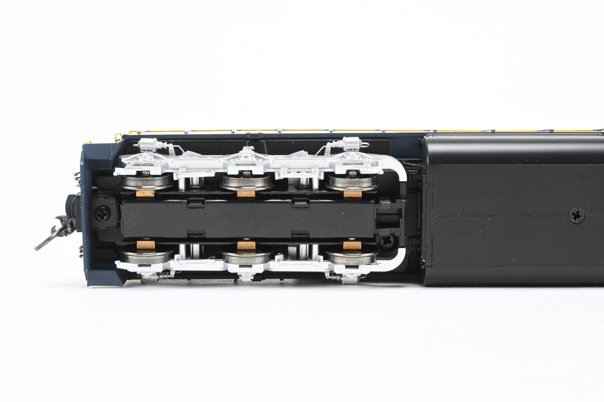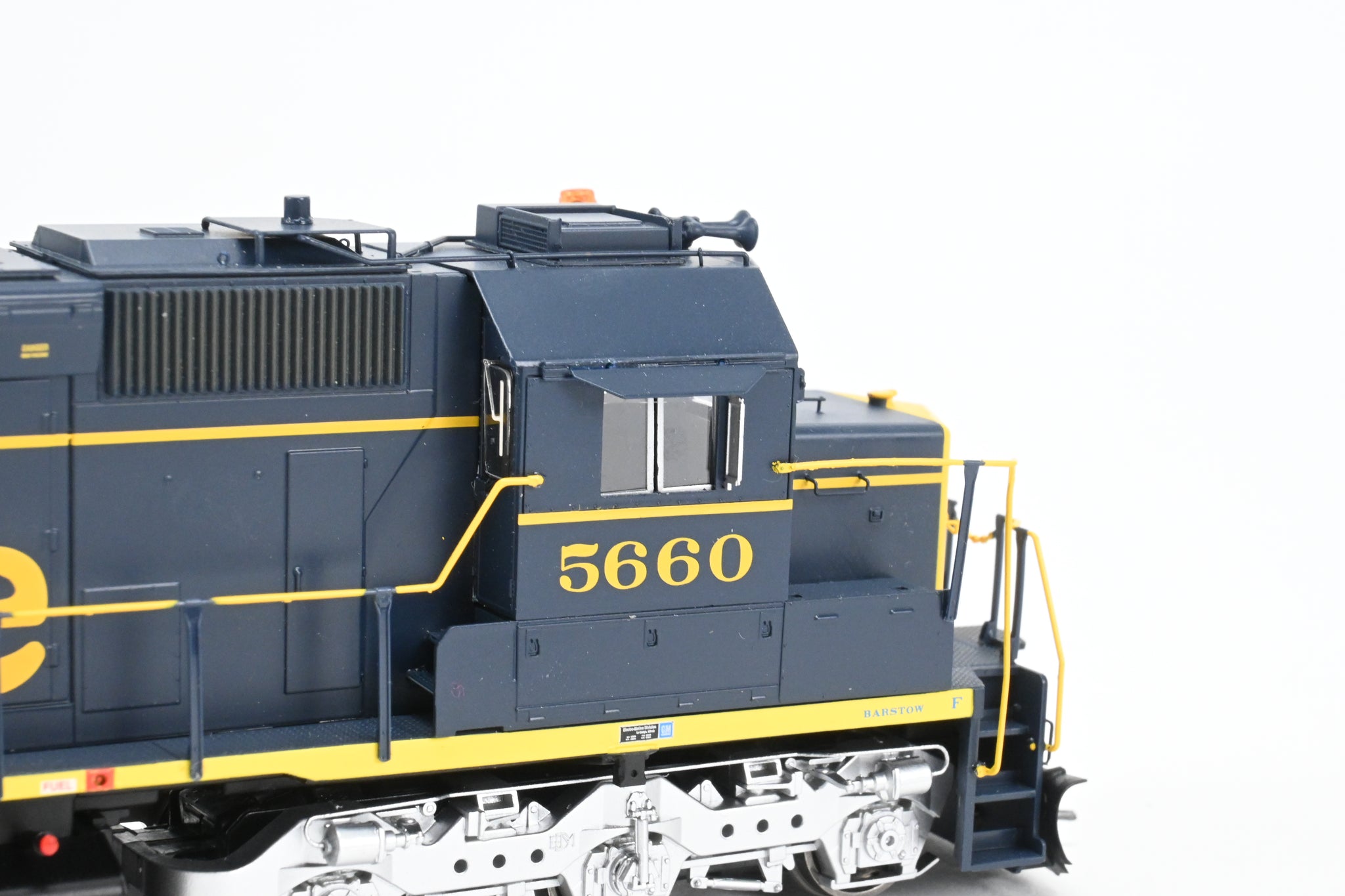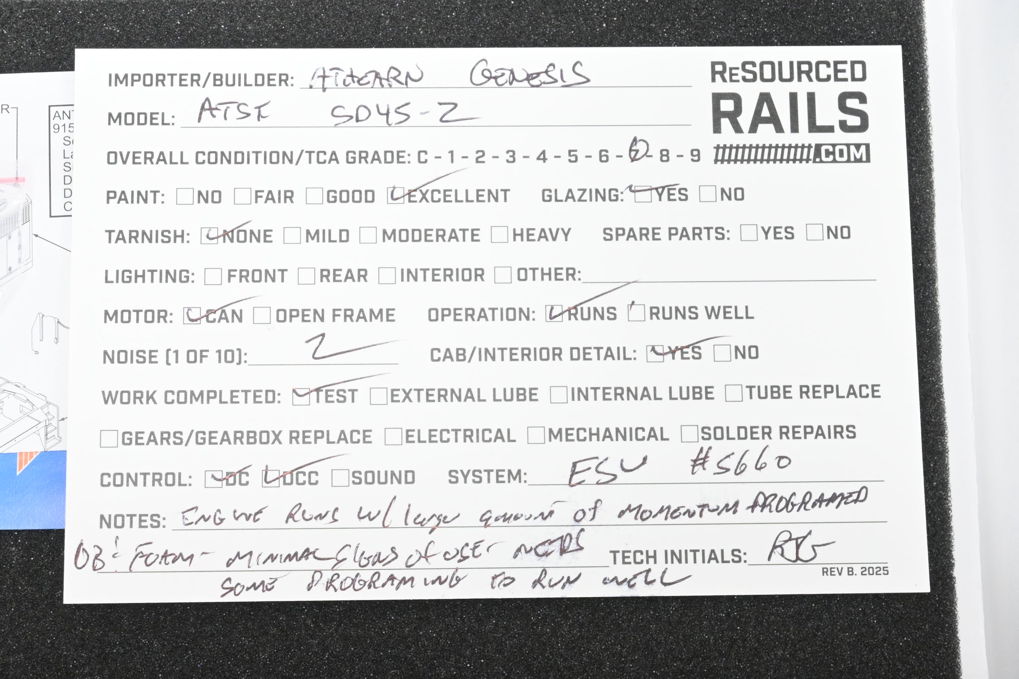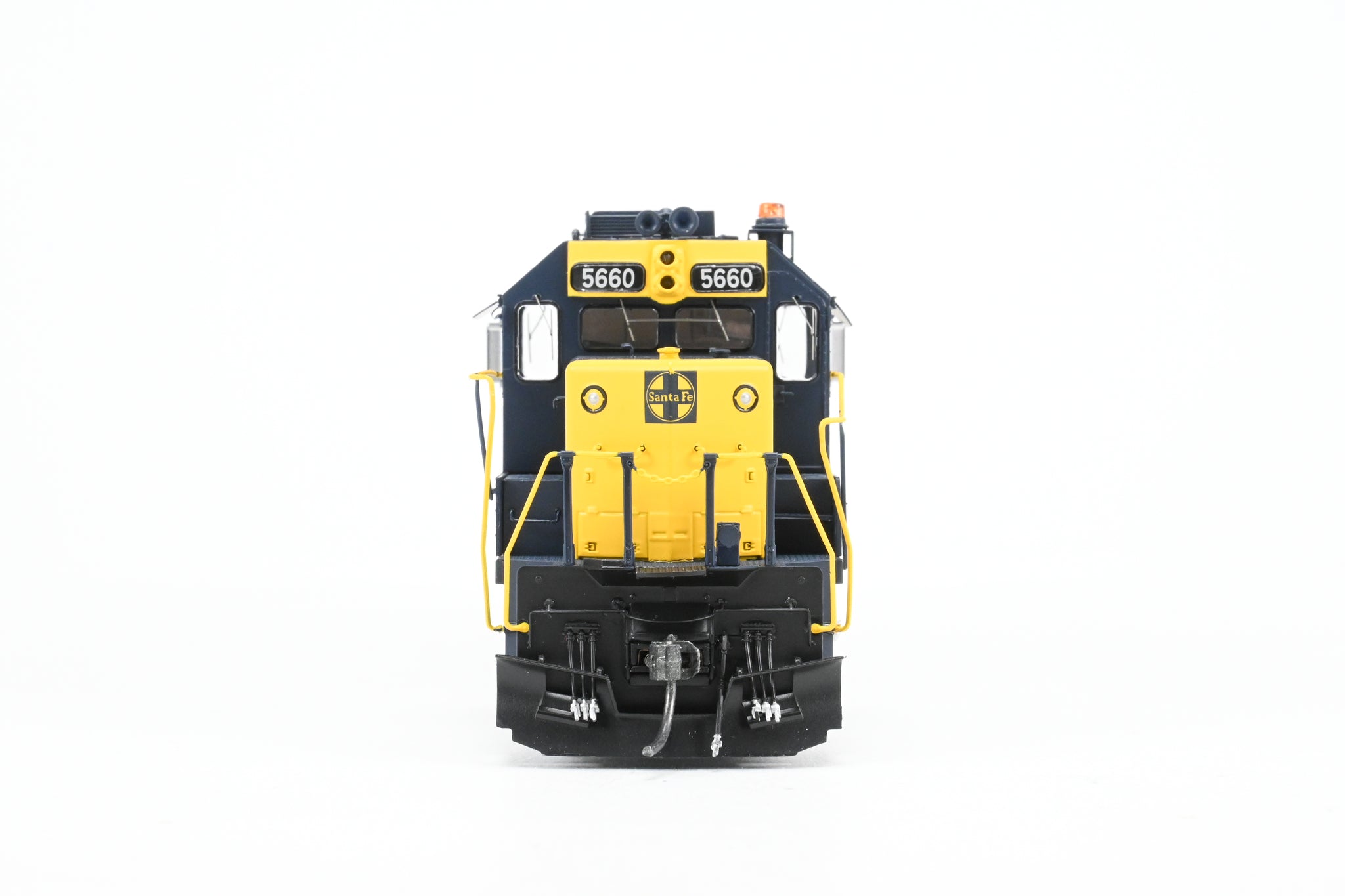 Genesis product line. Boxes shows minimal shelf wear. No spare parts included. This SD45-2 is painted in Santa Fe's Blue Yellow pinstripe. Paintwork is excellent. Model has an ESU LokPilot decoder installed. Address is #5660. A nice model.