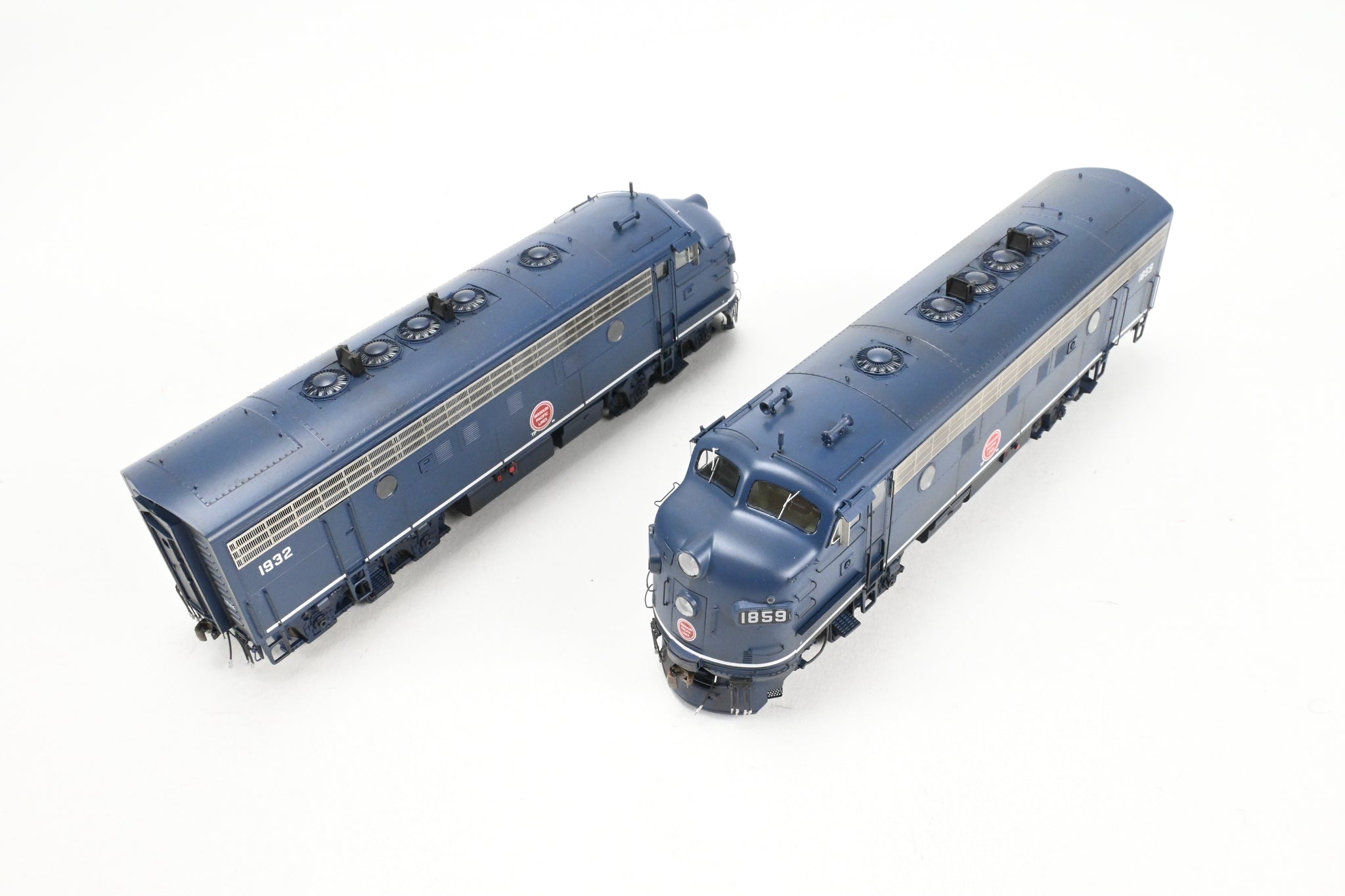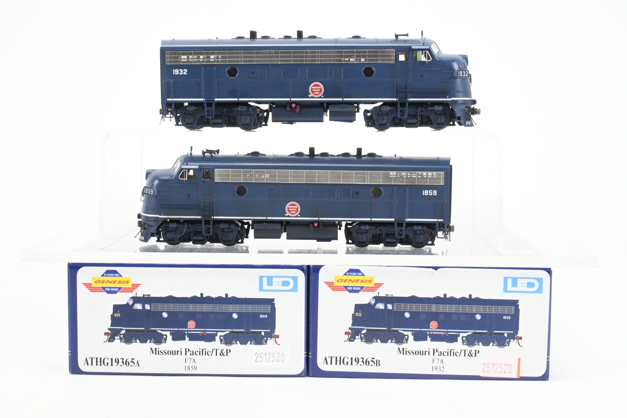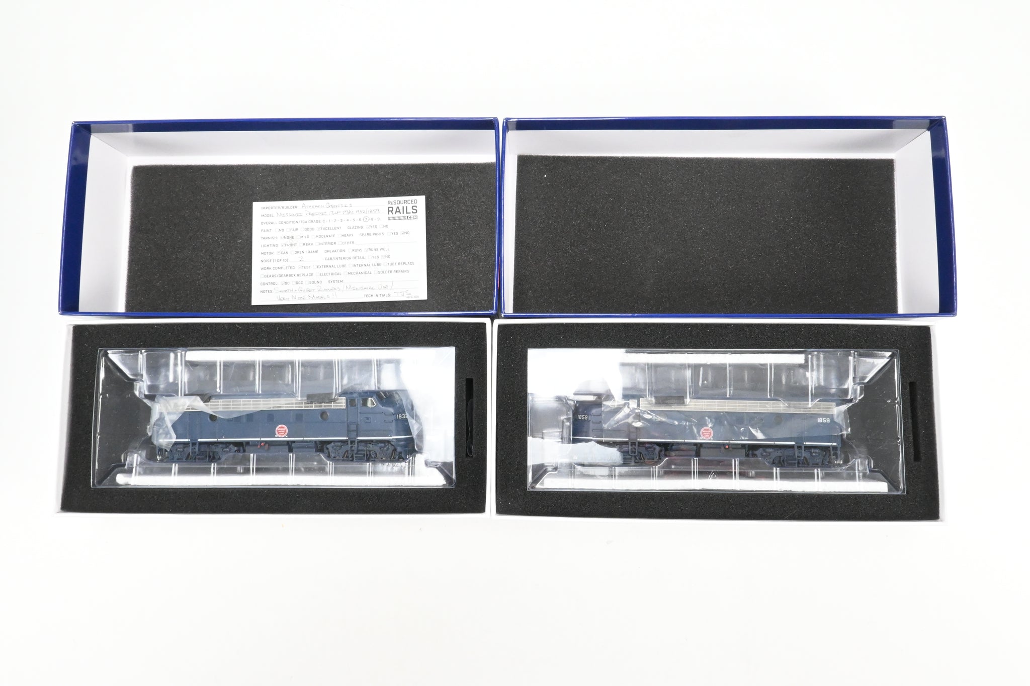 2020's run Athearn Genesis product line made in China. Boxes shows minimal shelf wear. No spare parts or paperwork included. Models have an excellent factory paint scheme in Jenks blue with Buzzsaw herald and sublettered for T&P numbers 1859 and 1932. Both models are smooth and quiet runners. A nice model. NOTE: Models are lightly weathered - see photos.