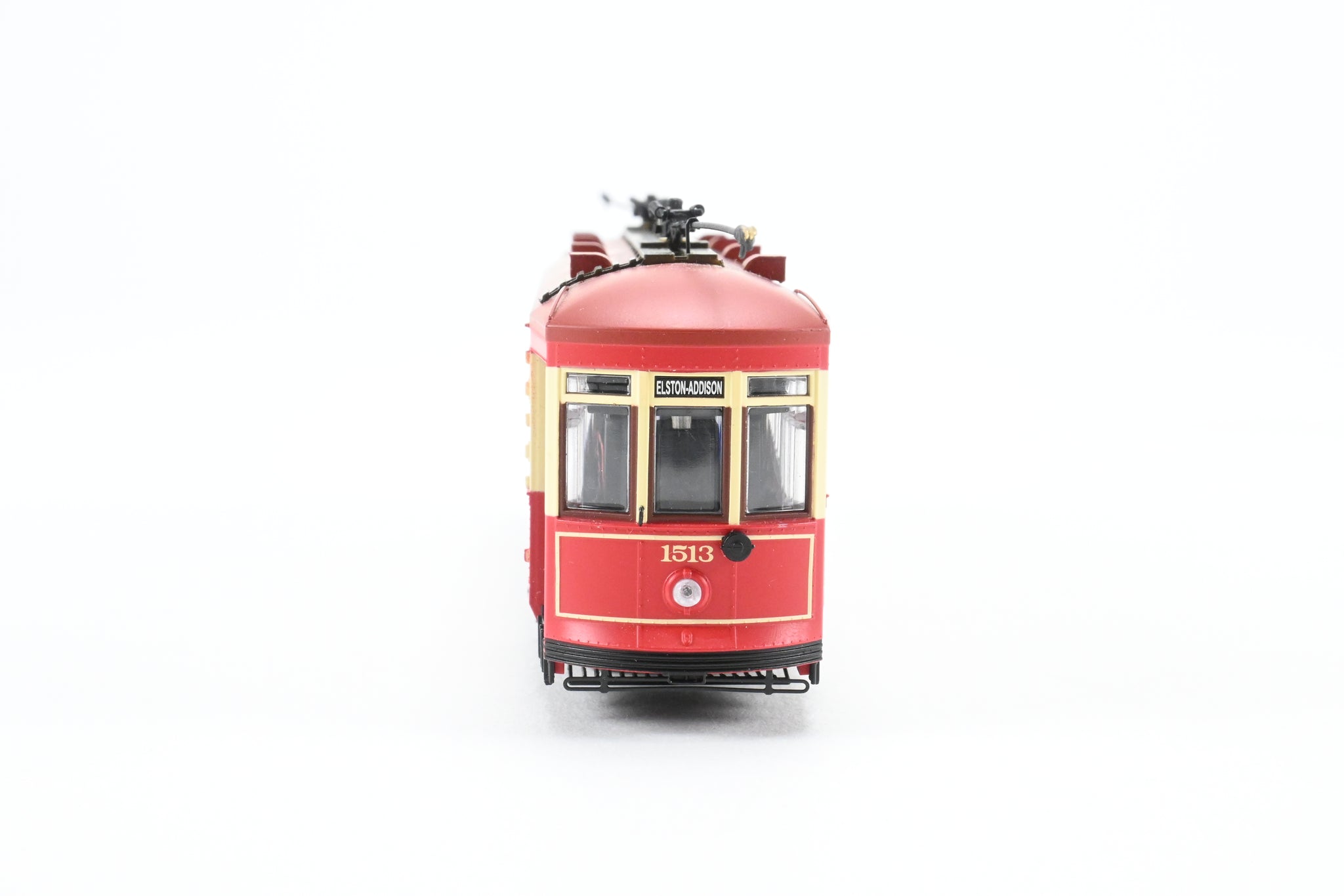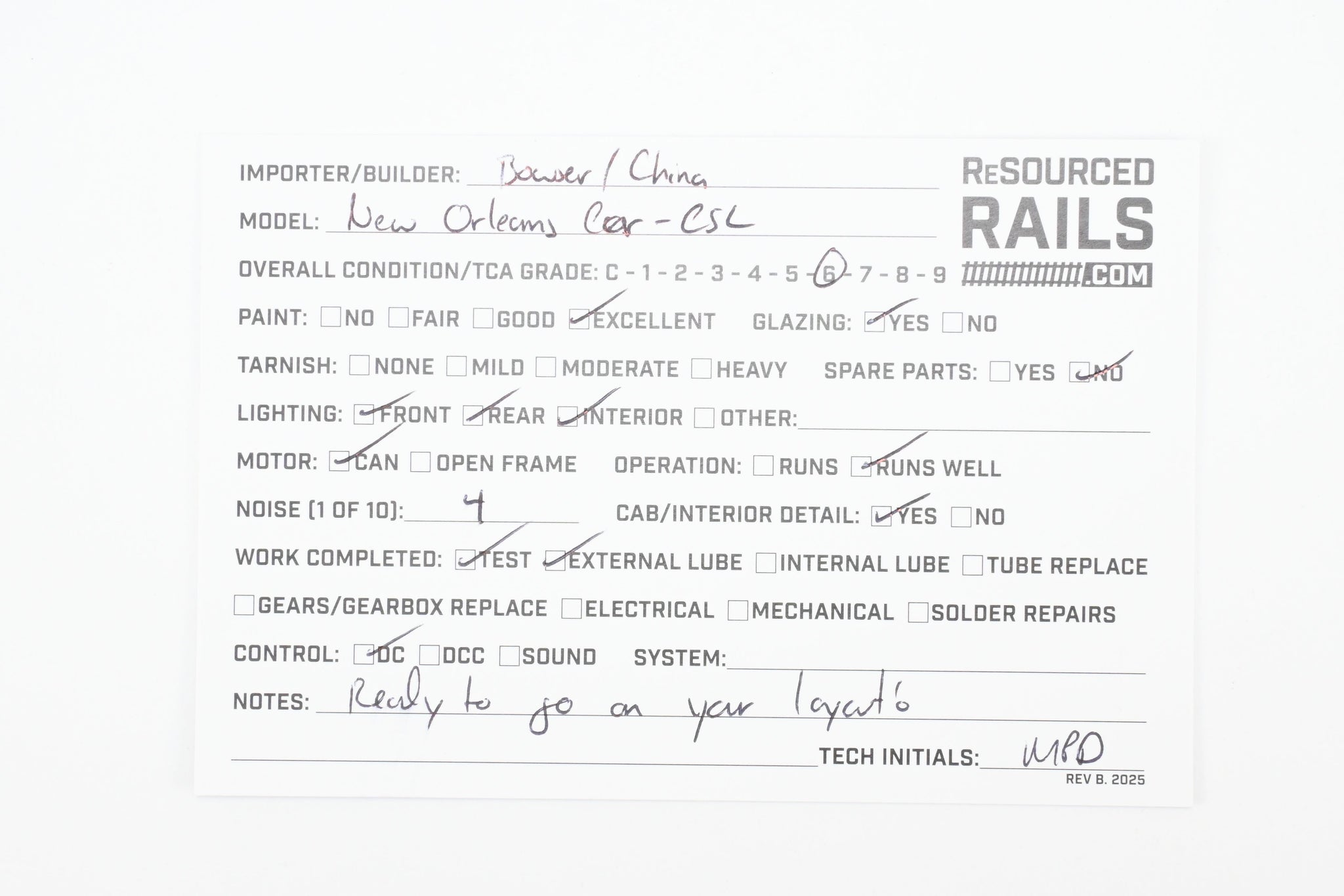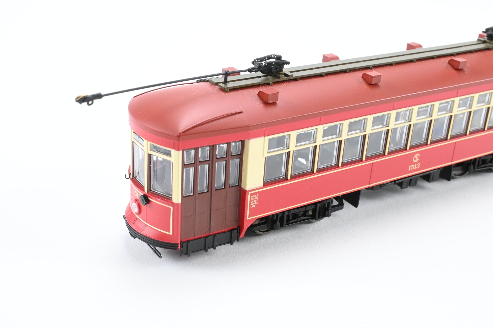 Bowser imported model made in China. Reboxx box shows minimal shelf wear. No spare parts. NOTE: This is a DCC Ready model that runs on conventional DC power. Fully detailed, with an excellent factory paint job in CSL Red and creme, numbered 1513. This model is based on the prototype used on the New Orleans Public Service lines. A fun little piece.