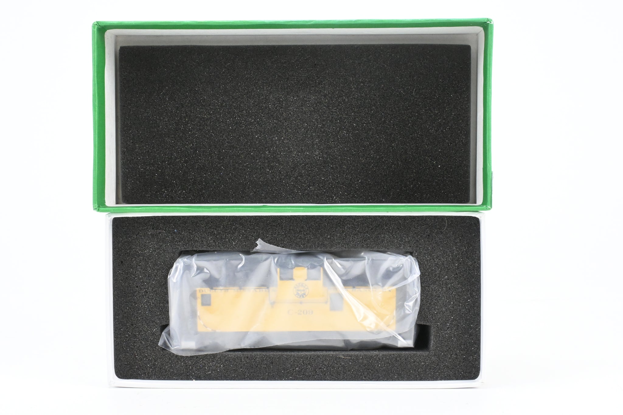 1998 run Overland Models, Inc. imported model built by Ajin Precision Mfg. in Korea. Box shows minimal shelf wear but with a blue stain on one side - see photo. Spare parts are not included. Factory installed glazing. A full length radio antenna is on the roof. A nice example of this caboose that will compliment any DM&IR collection.