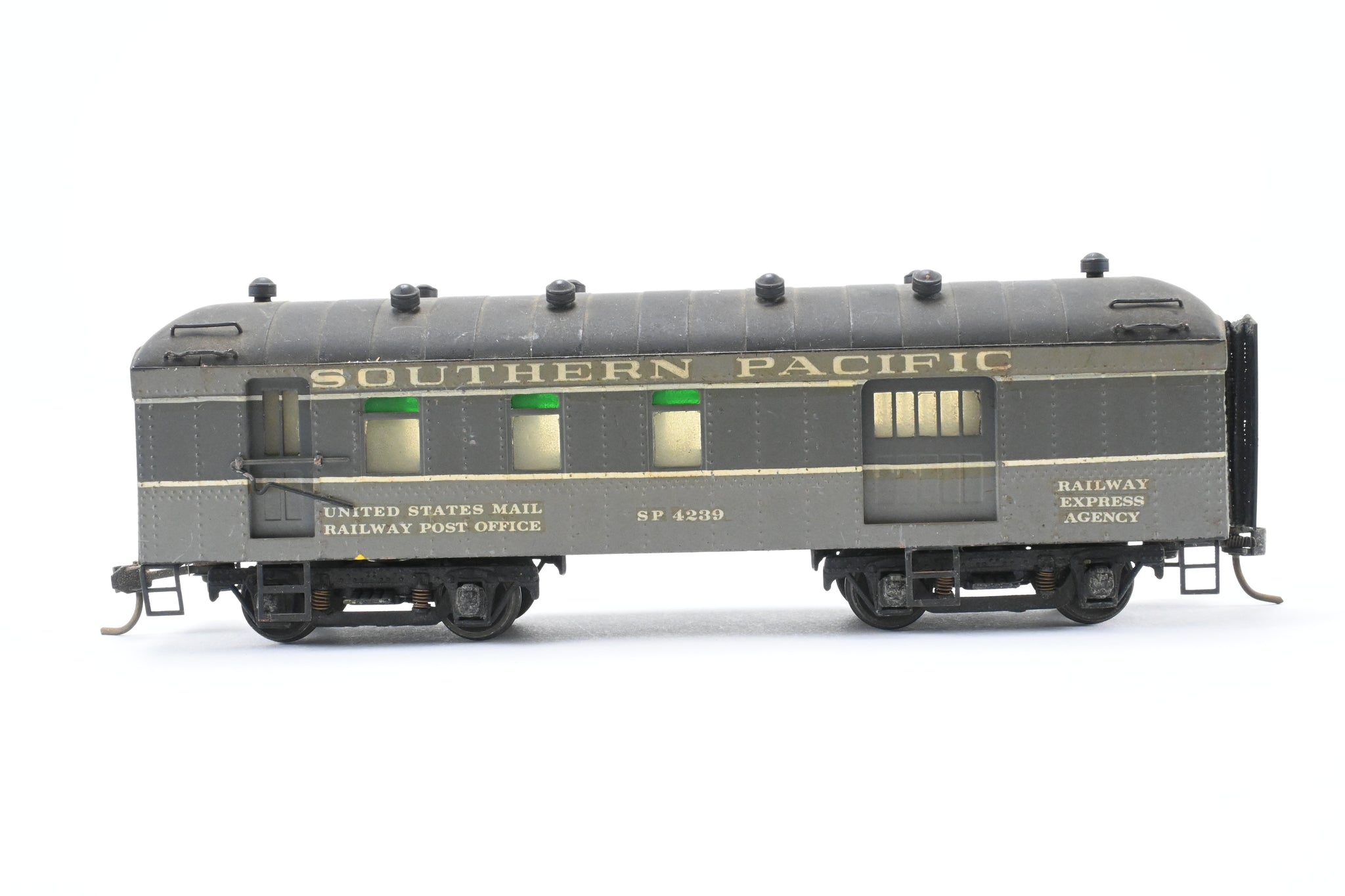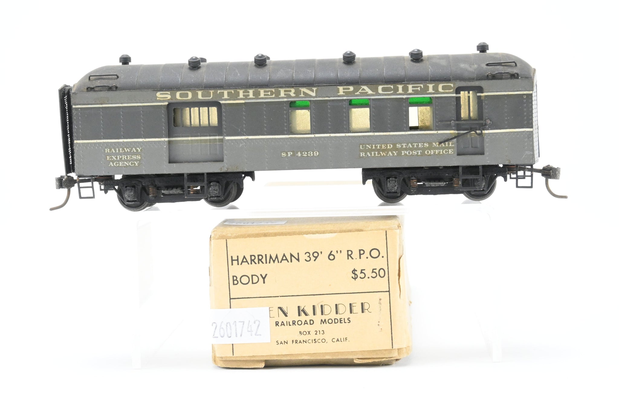 1960's run built in Japan. Original box included. No spare parts included. Harriman style 39' 6" RPO. Model has a fair custom paint job in two-tone gray - see photos. Wood floor with Central Valley Metal trucks. No underbody details have been added.