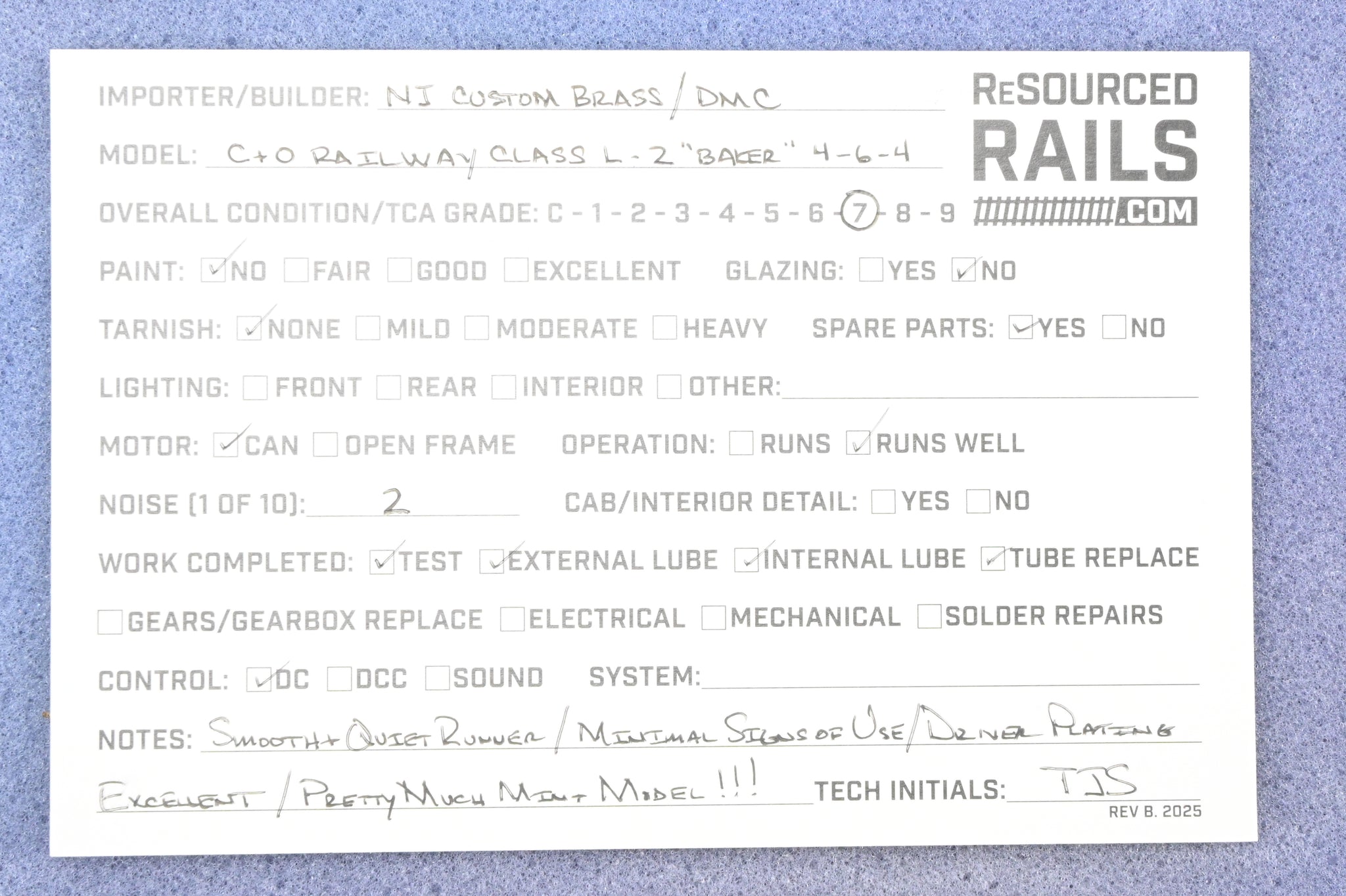 1977 run NJ Custom Brass imported model built by Dong Jin in Korea. Box shows minimal shelf wear with some peeling in the paper wrapper. Includes spare parts and boiler weight. Represents locomotive Nos. 300 - 307. Recently serviced by one of our technicians - old gearbox grease cleaned out and replaced. A new drive tube has been installed. A smooth and very quiet runner with minimal signs of use. Very nice example of this model.