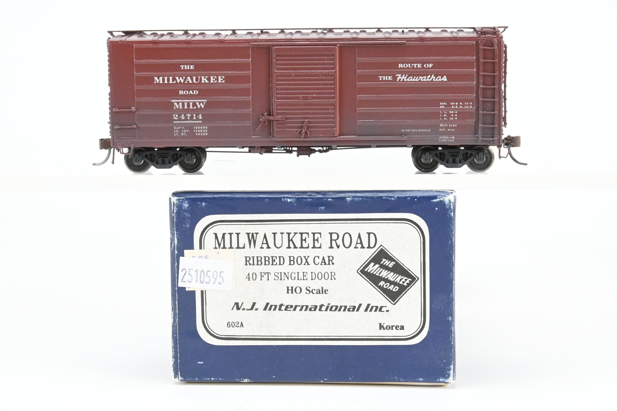 Korean built model, imported by NJ international Inc. Box shows moderate shelf wear. No spare parts included. Aftermarket foam included. Custom painted and weathered with minimal decal film showing. A nice model of a rib sided 40 foot boxcar that was used by the Milwaukee Road.