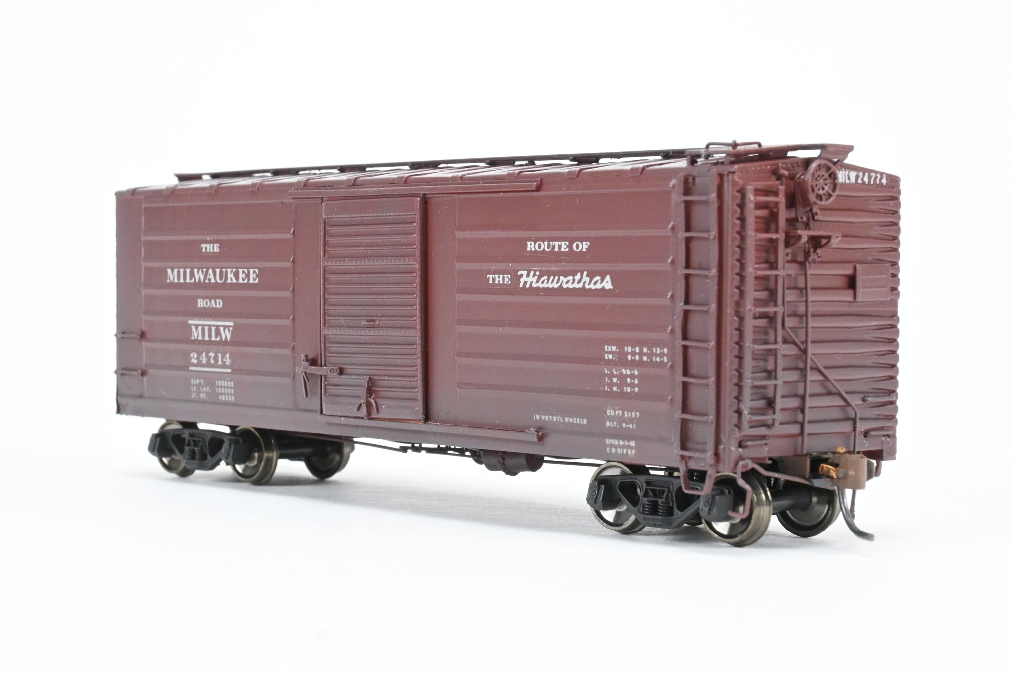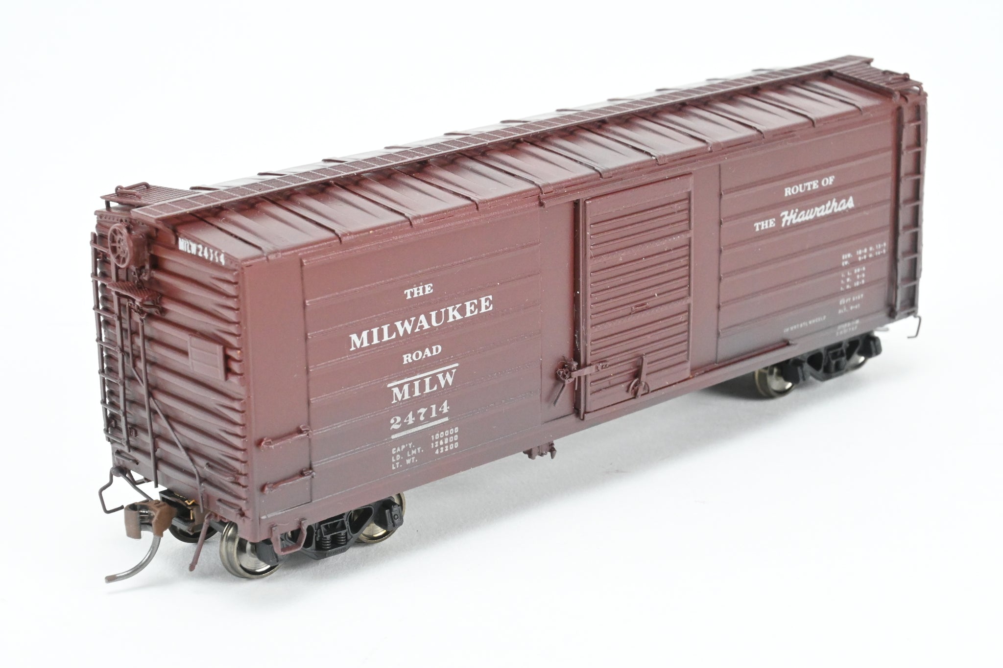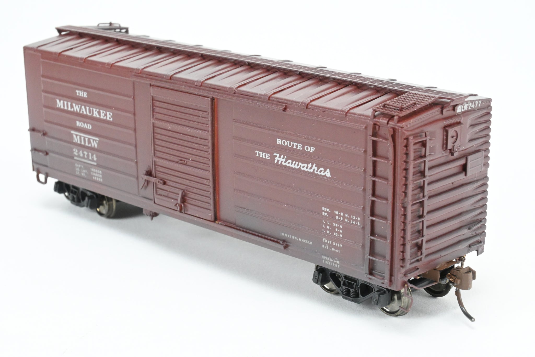 Decorated: Custom painted in boxcar brown, lettered "The Milwaukee Road" and "Route of the Hiawathas" Numbered 24714
