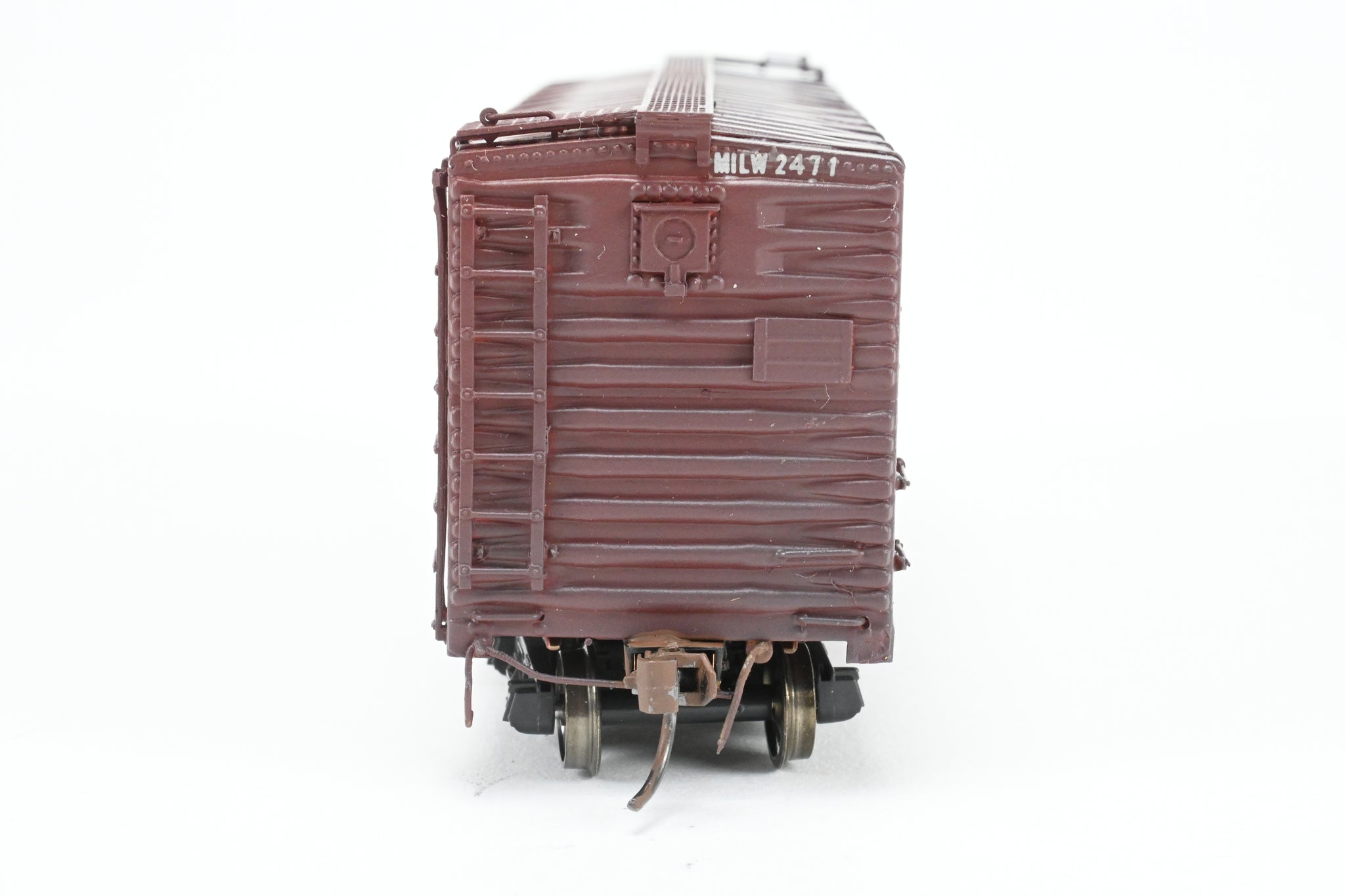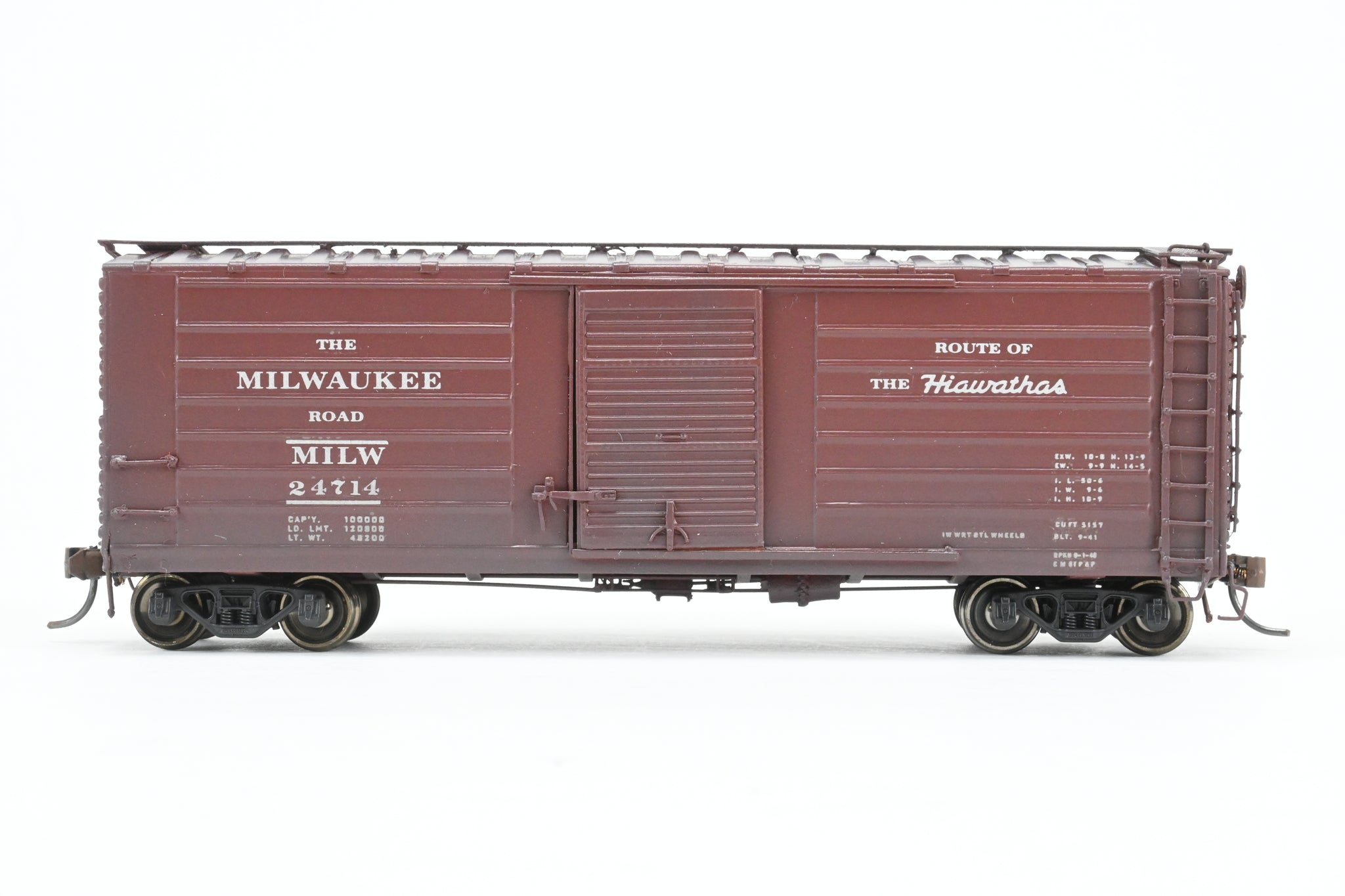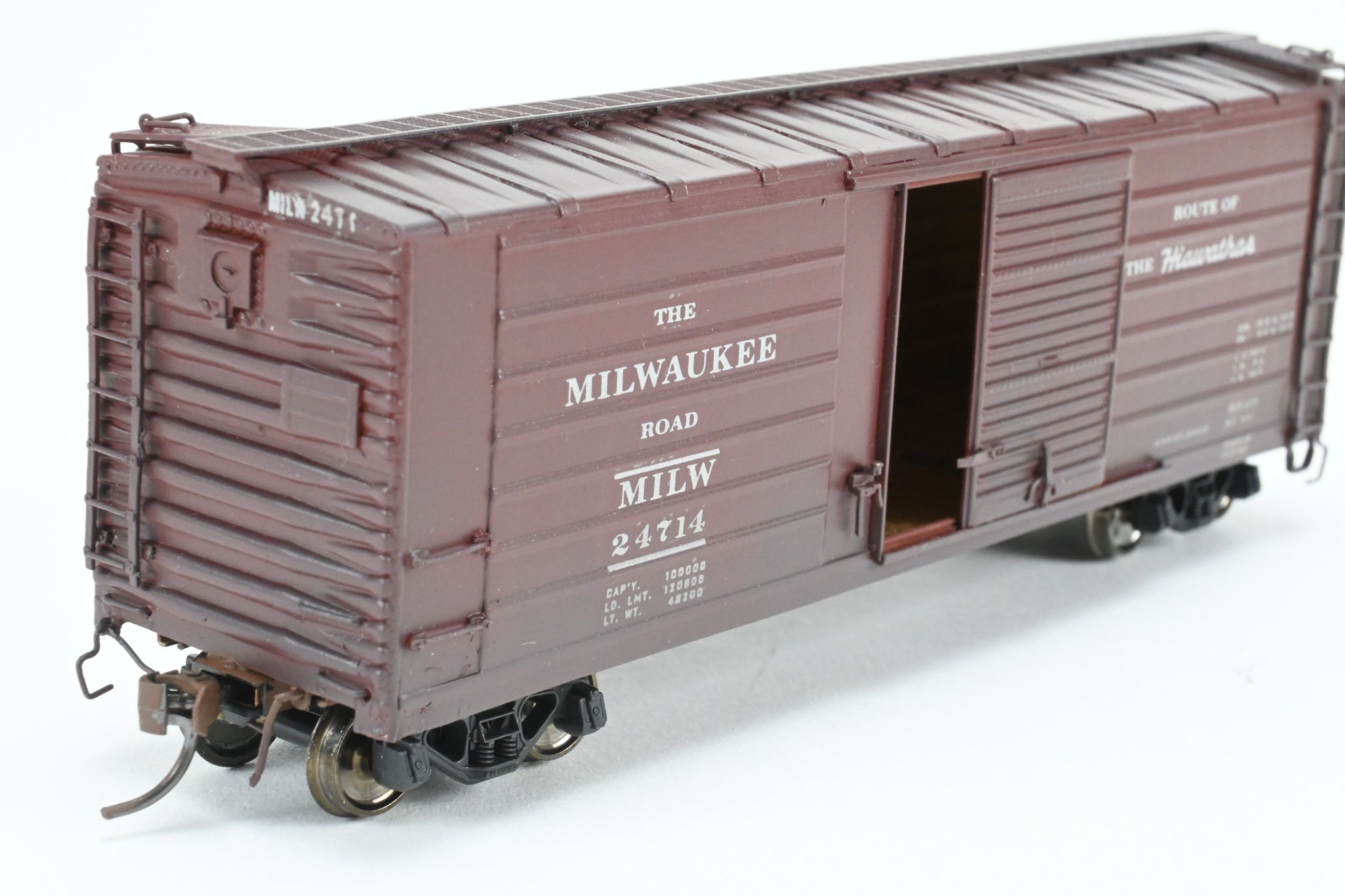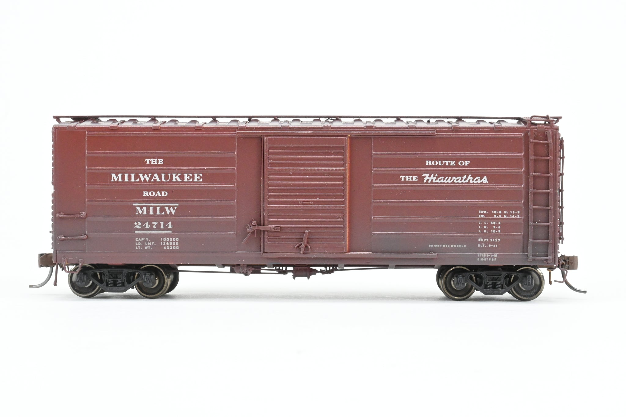 Decorated: Custom painted in boxcar brown, lettered "The Milwaukee Road" and "Route of the Hiawathas" Numbered 24714
