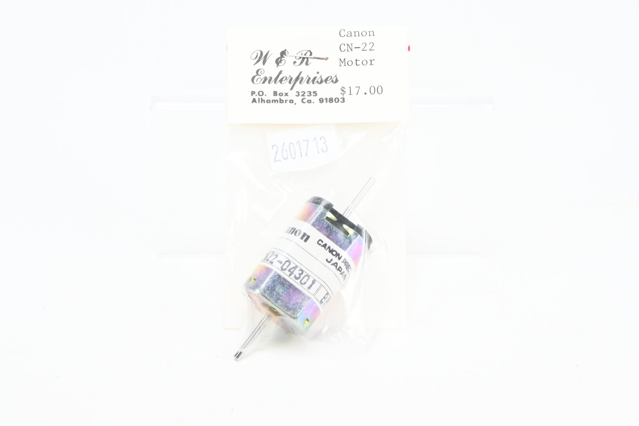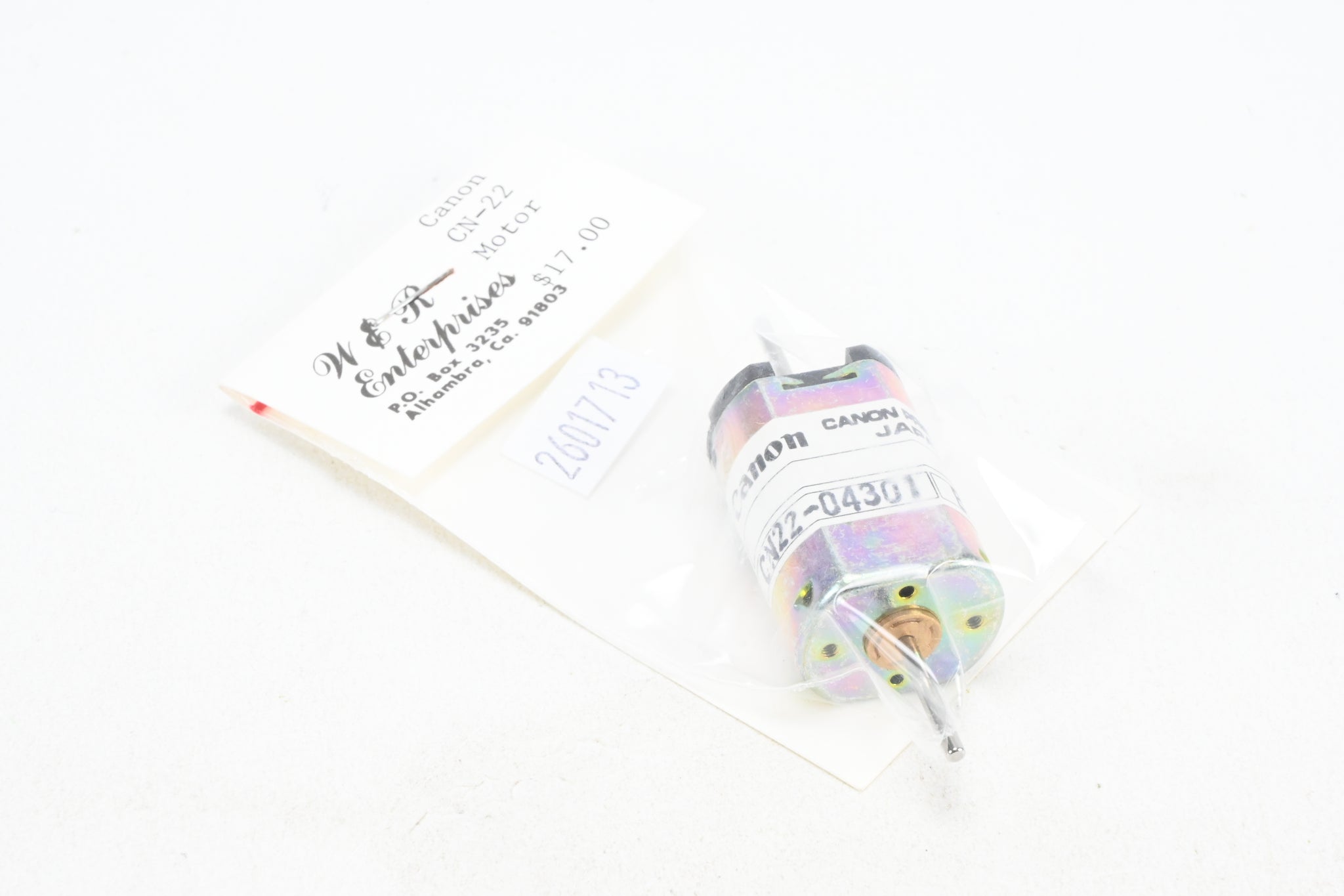 Canon Coreless CN-22 motor made in Japan. Original plastic bag shows almost no shelf wear. Label says W&R Enterprises but made by Canon. C-8 Like New condition. We have 10!