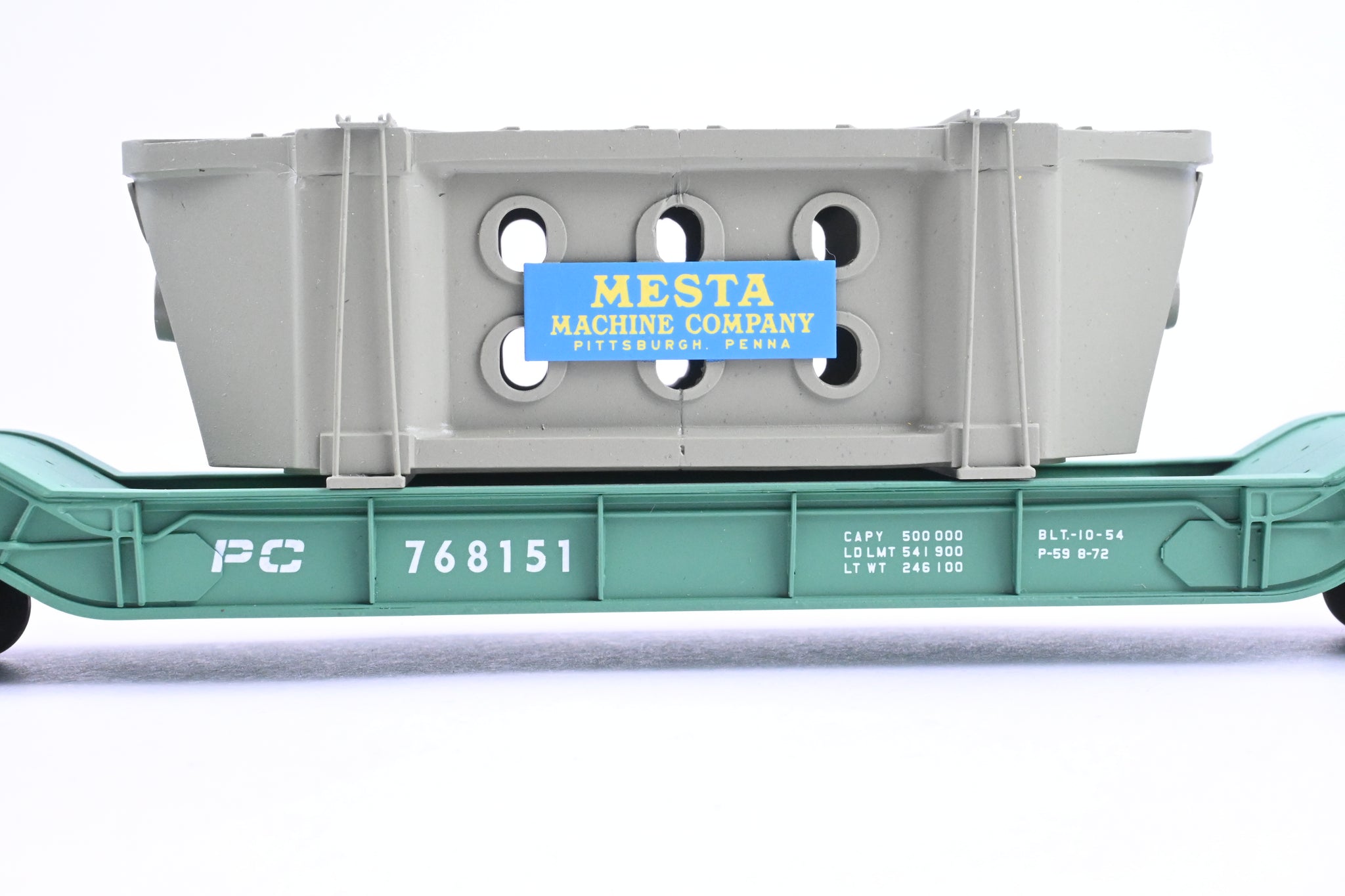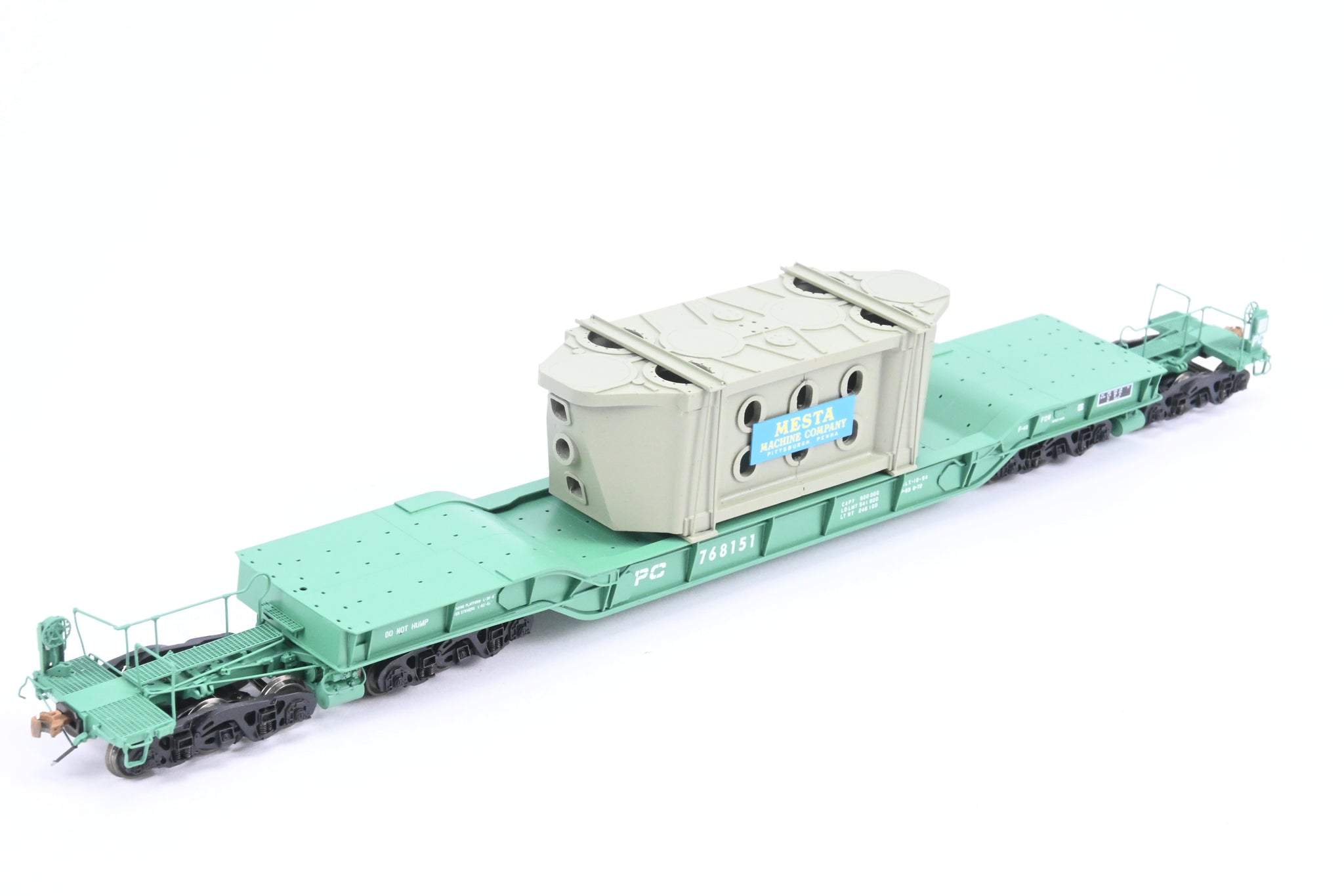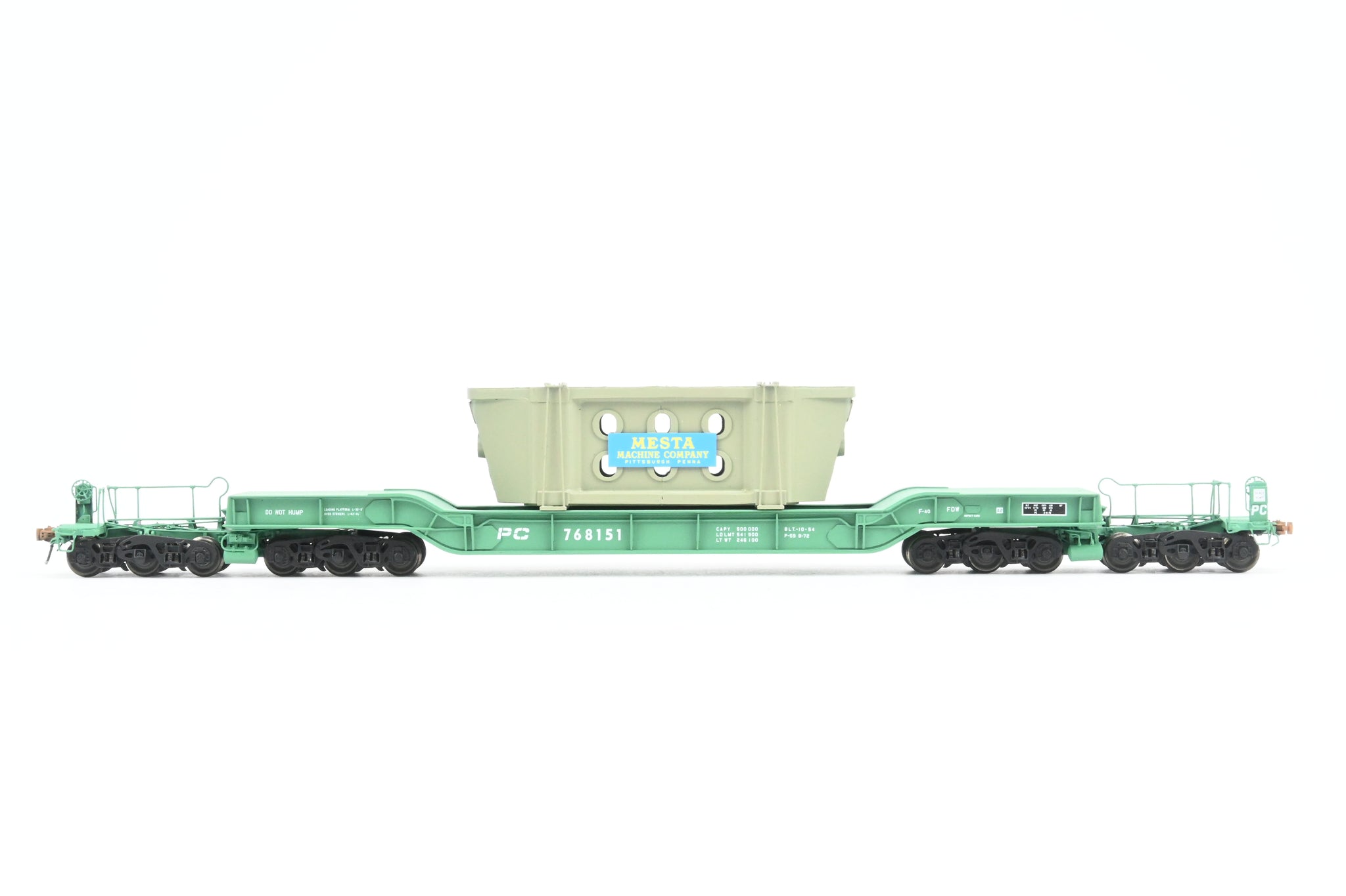 Decorated: Excellent factory paint in Penn Central green with white lettering. Gray painted Mesta Machine Company load. Road number 768151.