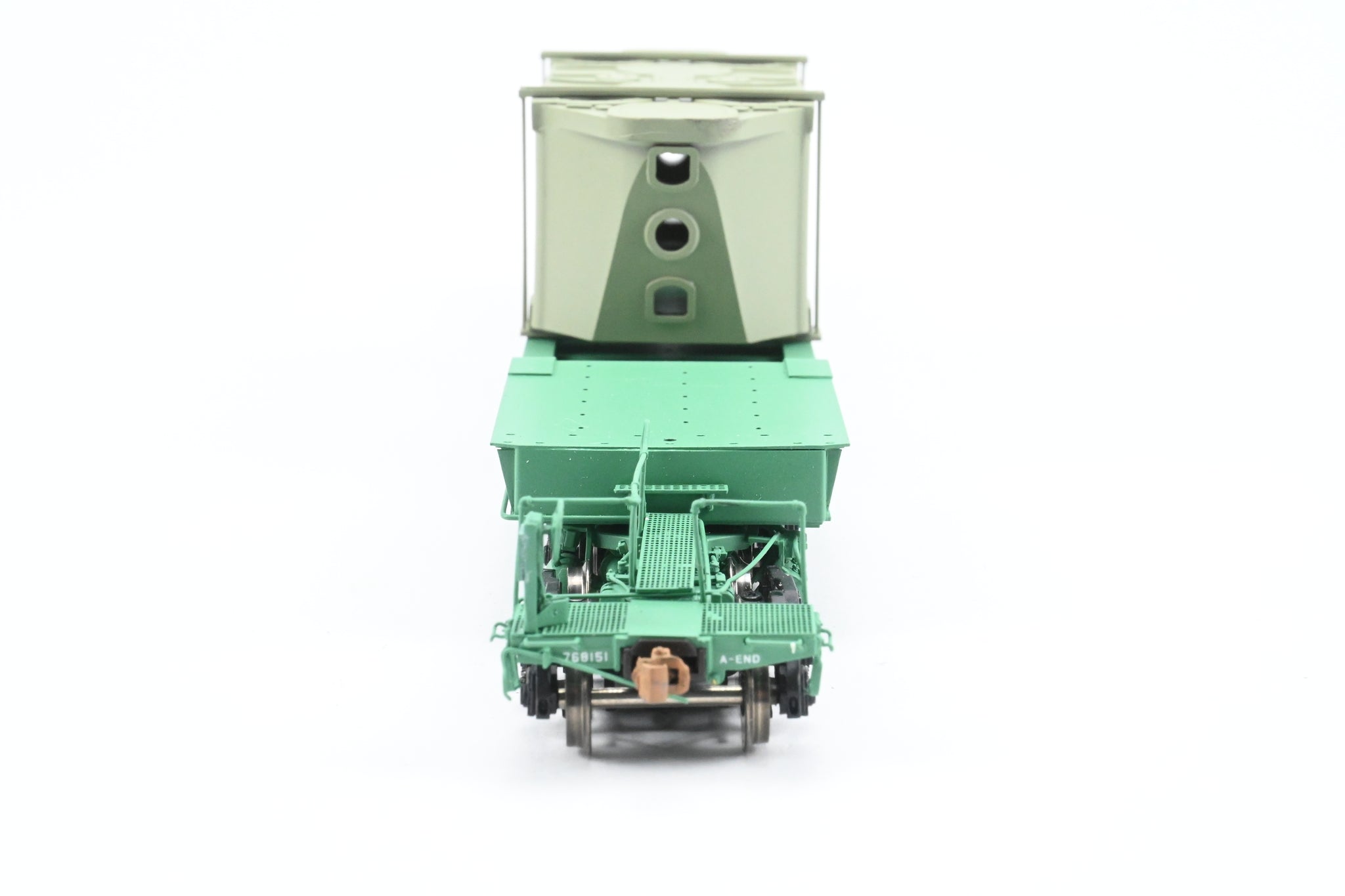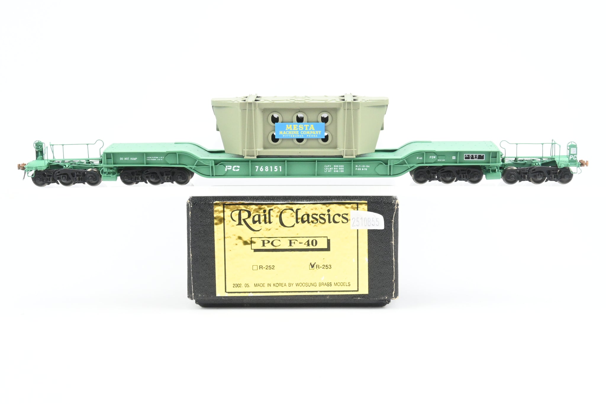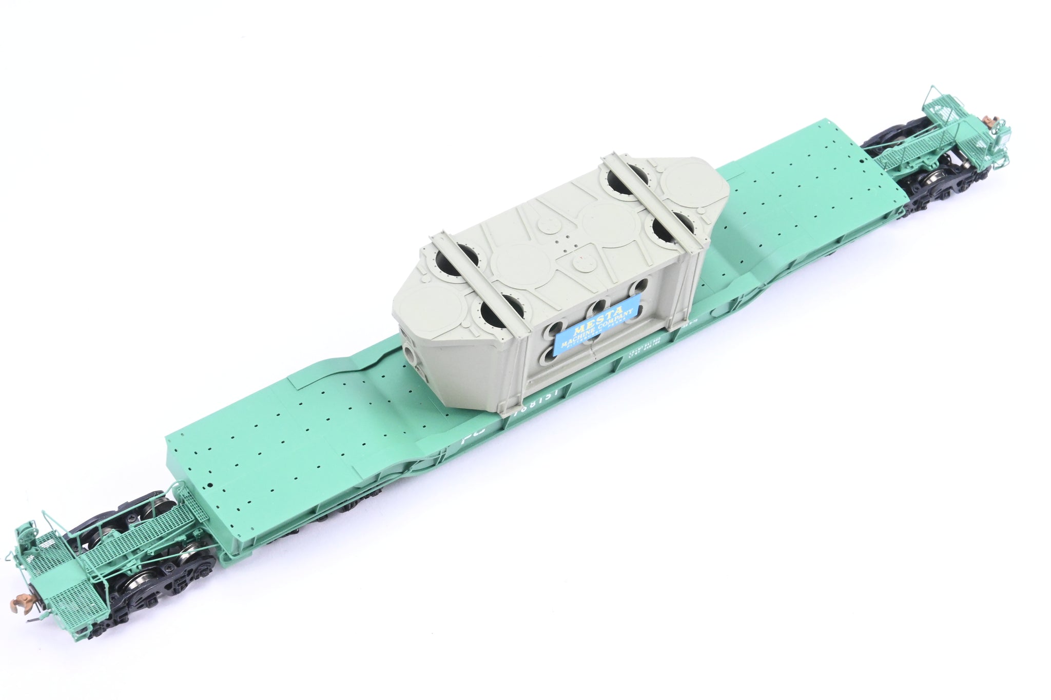 Decorated: Excellent factory paint in Penn Central green with white lettering. Gray painted Mesta Machine Company load. Road number 768151.