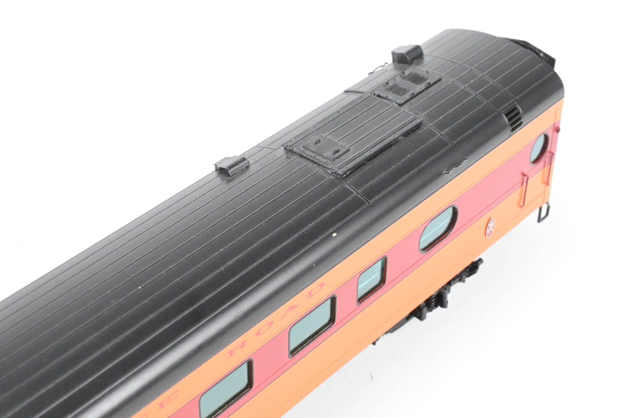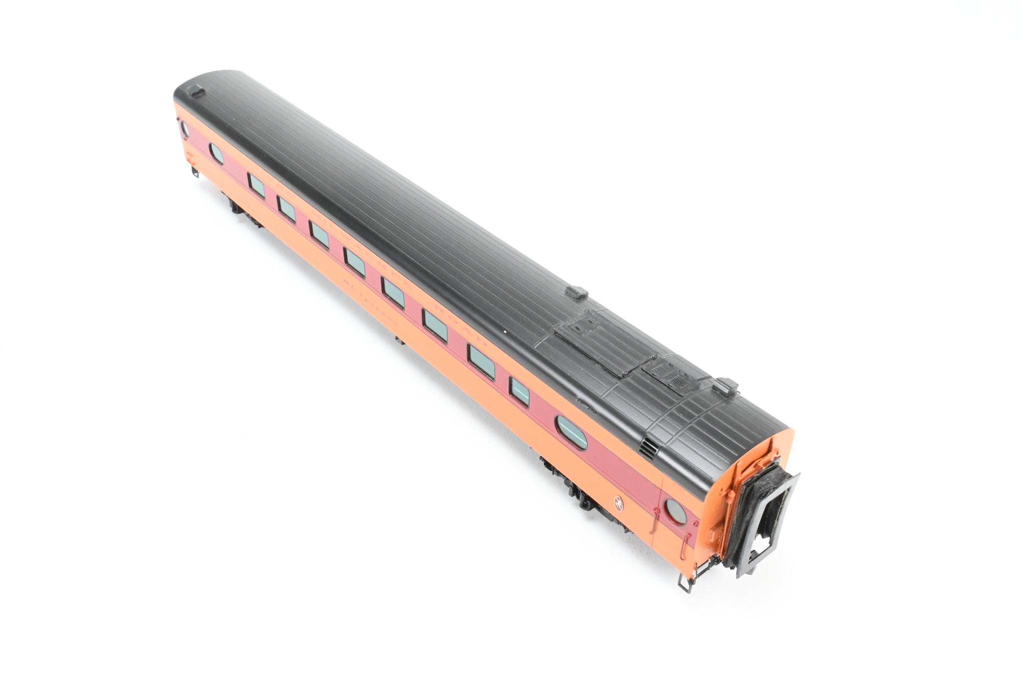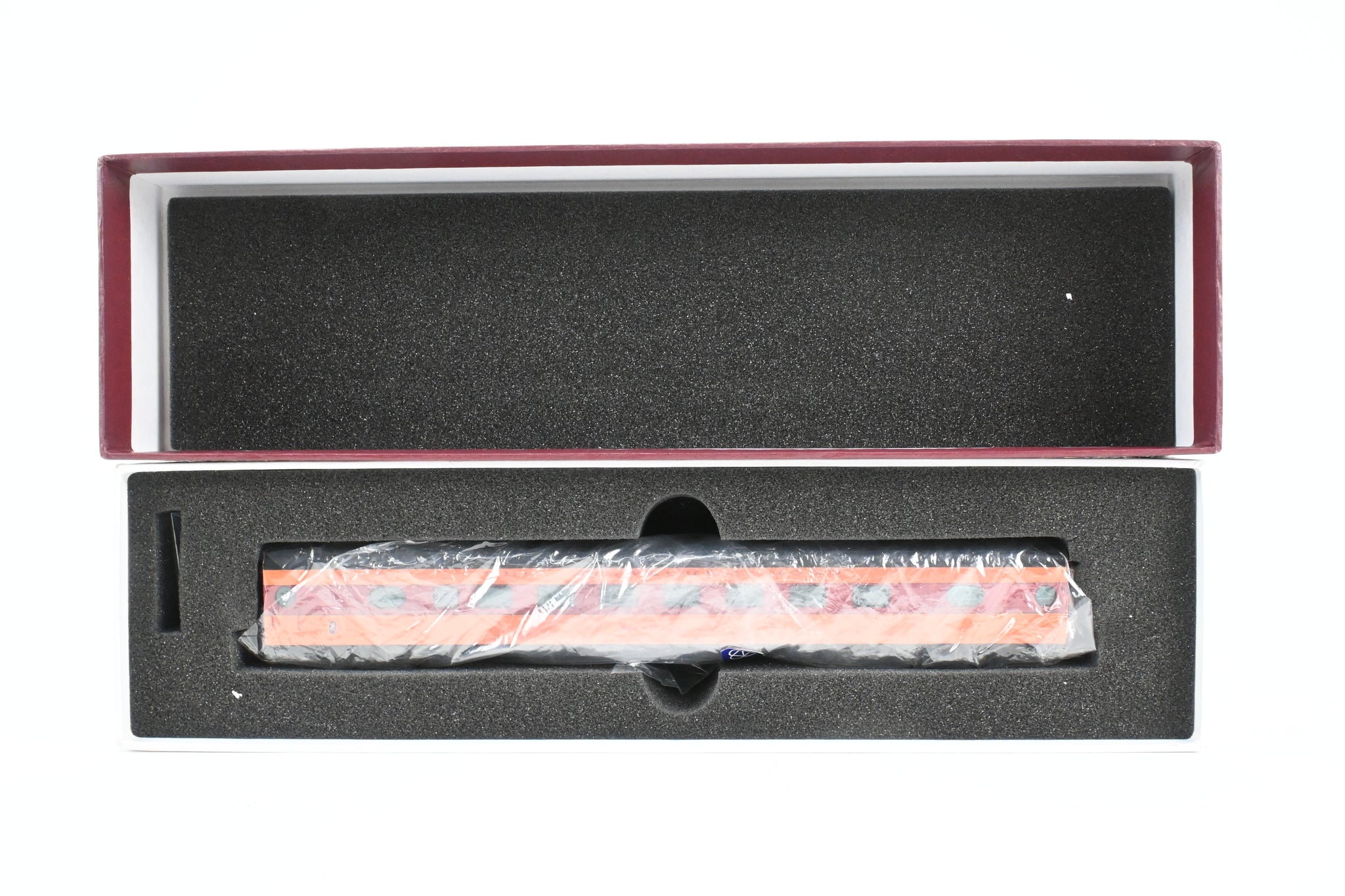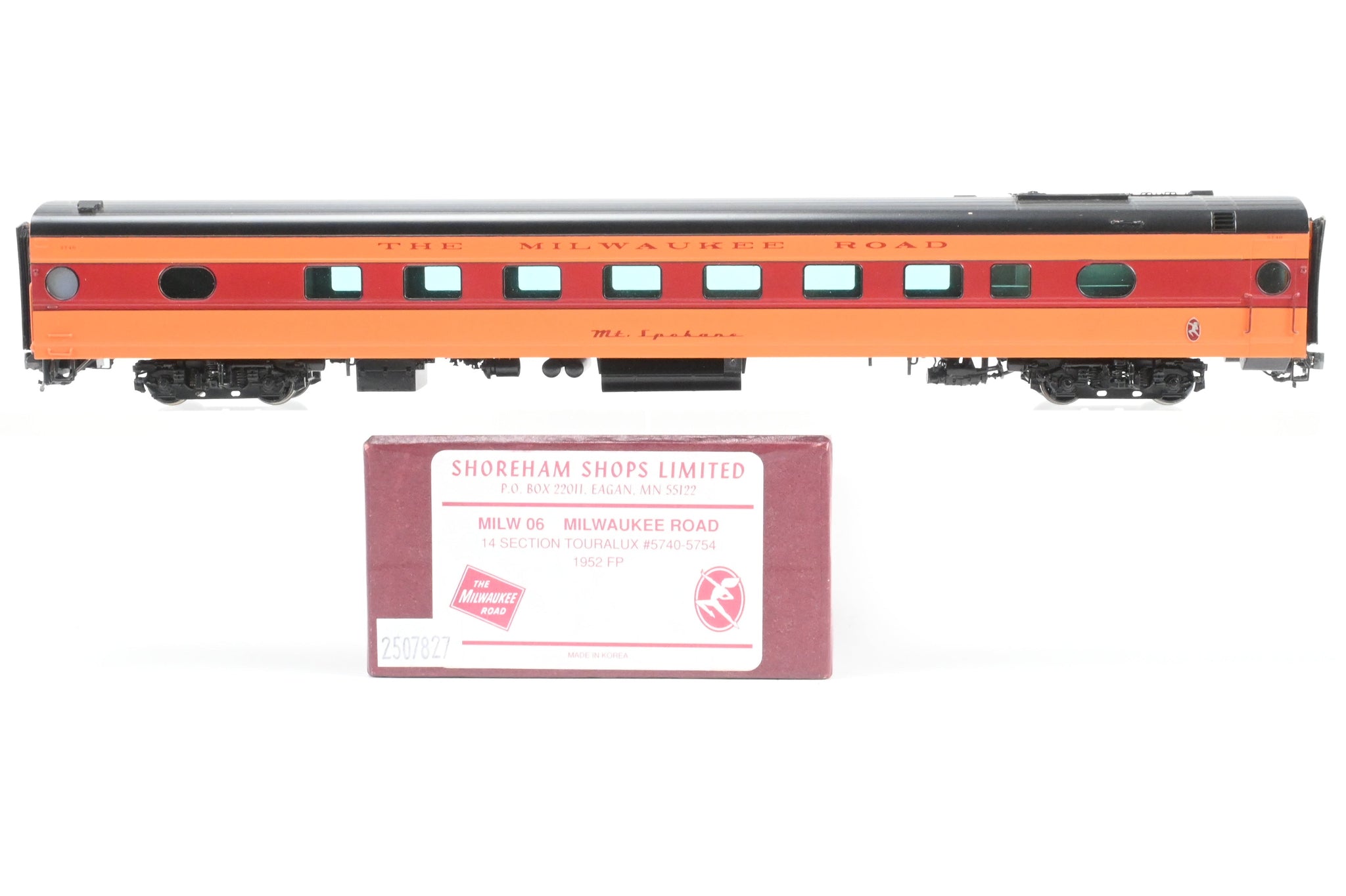 Shoreham Shops imported model built by Ajin Precision in Korea. Original box shows minimal wear. No spare parts included. Factory painted in the 1952 Hiawatha scheme and car number 5740, lettered "Mt Spokane". Car has window glazing and aftermarket diaphragms installed. The Milwaukee Road's 14-section Touralux sleeping cars numbered 5740 through 5754 (known as the "Mountain" series) were built in the railroad's own shops during 1947 and 1948 for service on the Olympian Hiawatha. A beautifully decorated car that shows minor use.