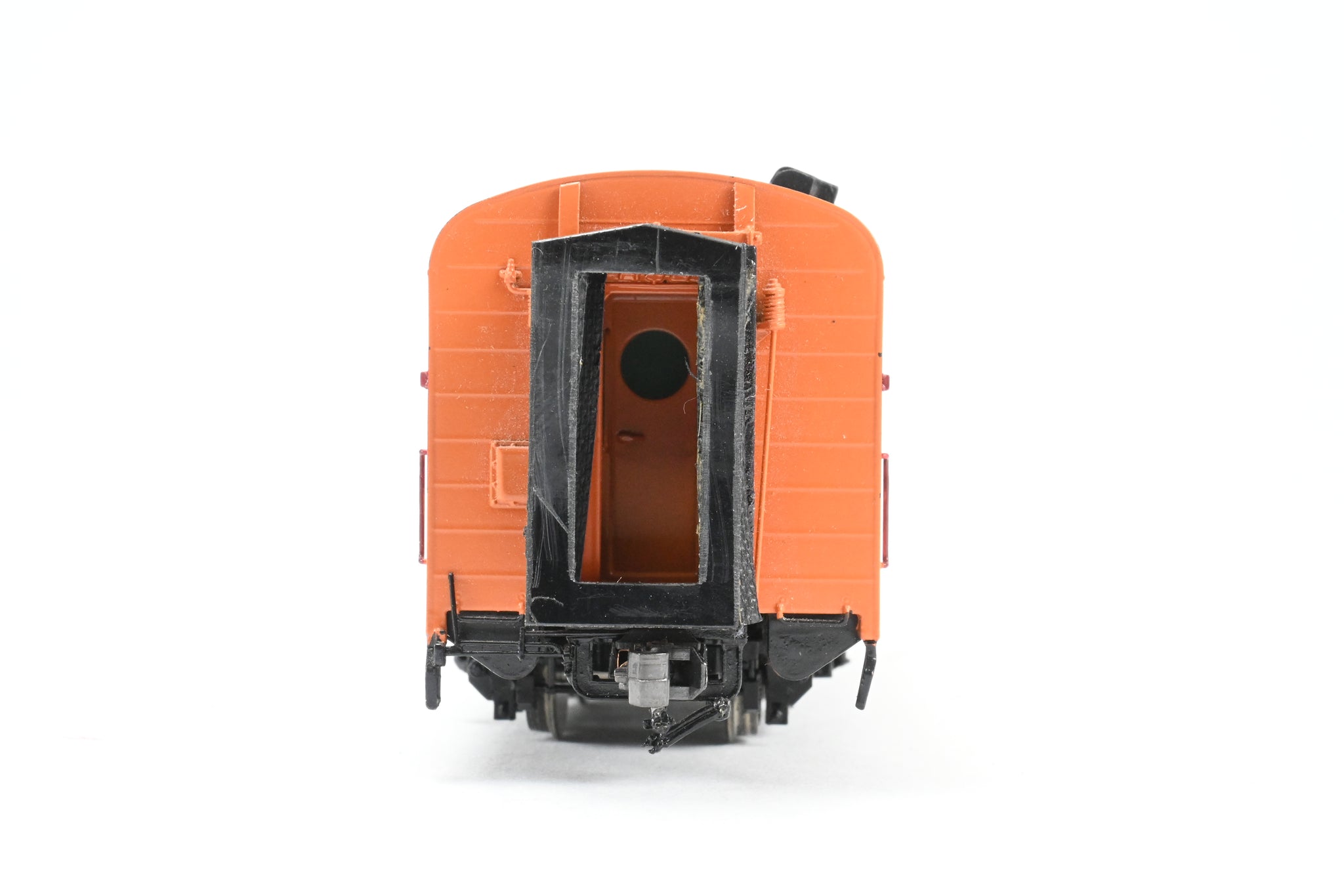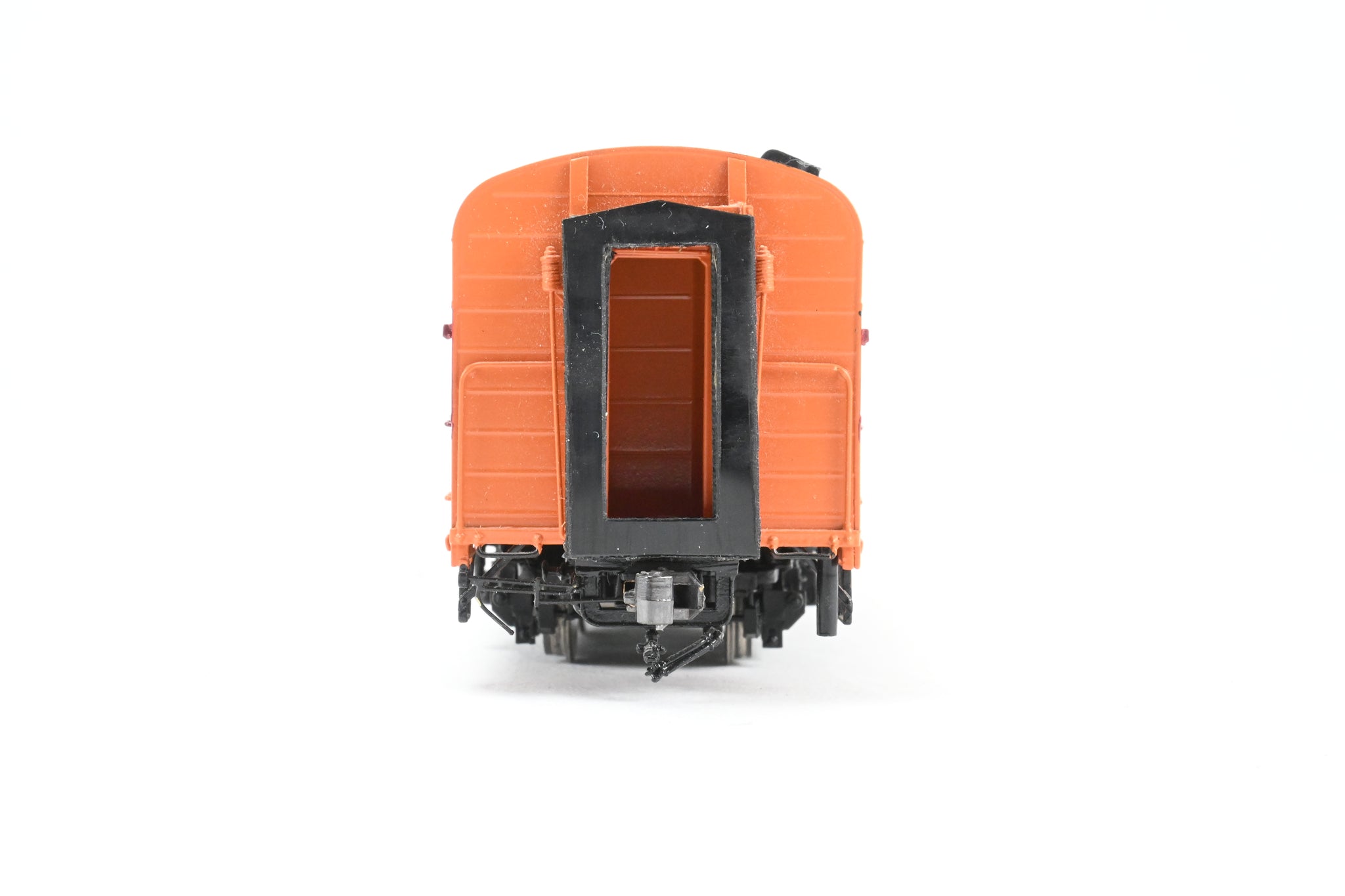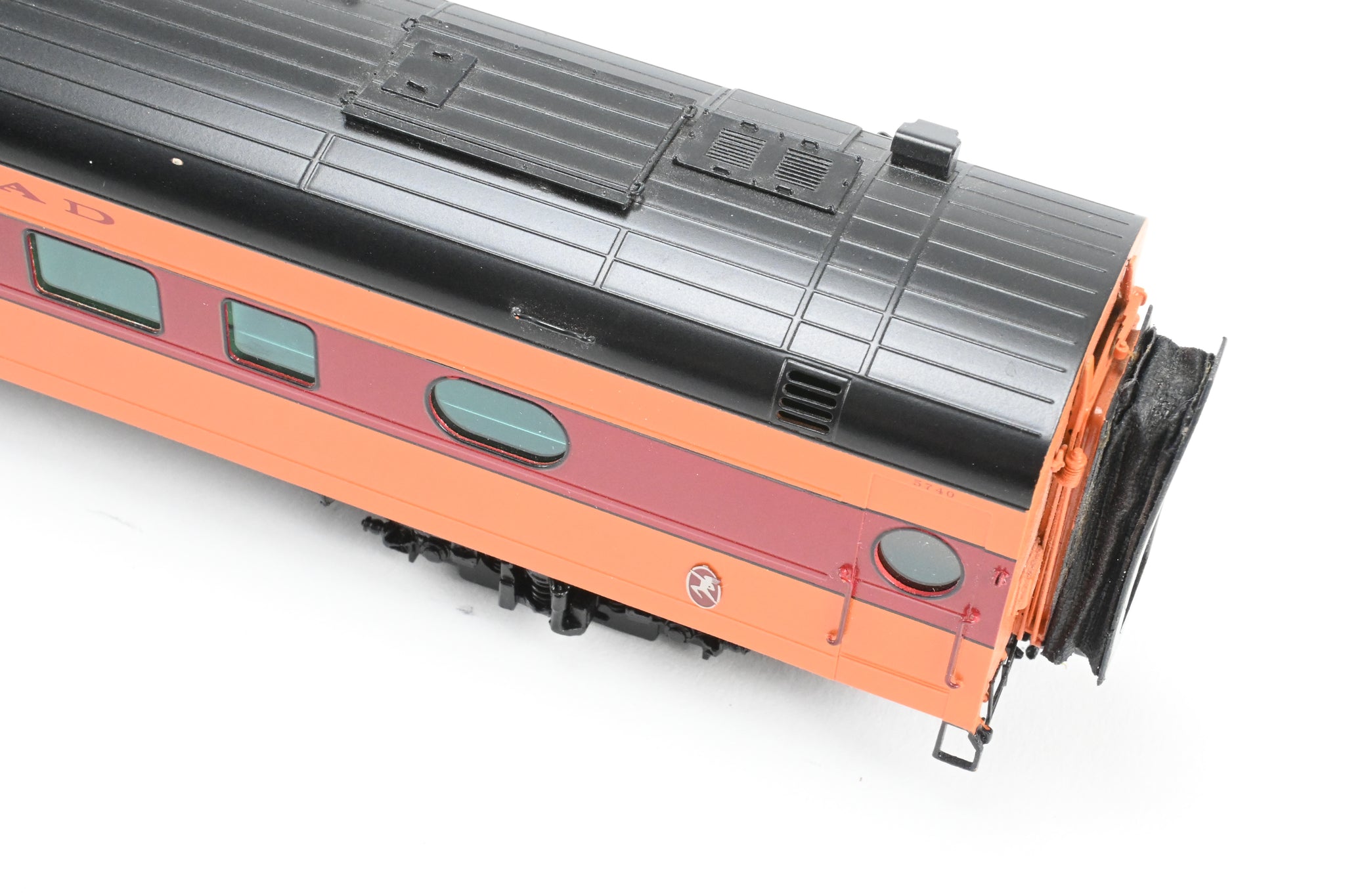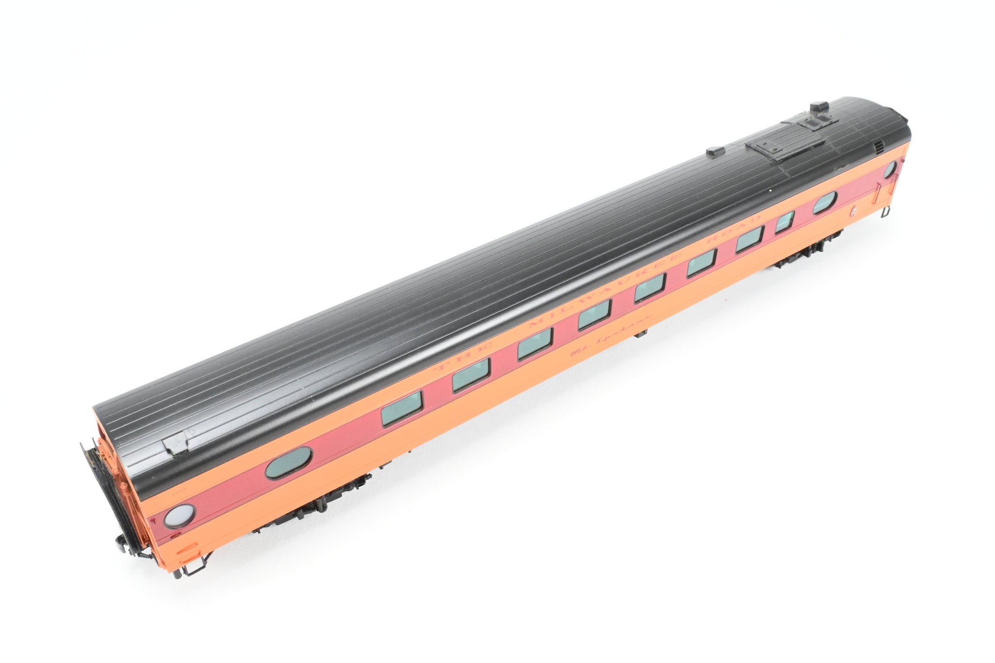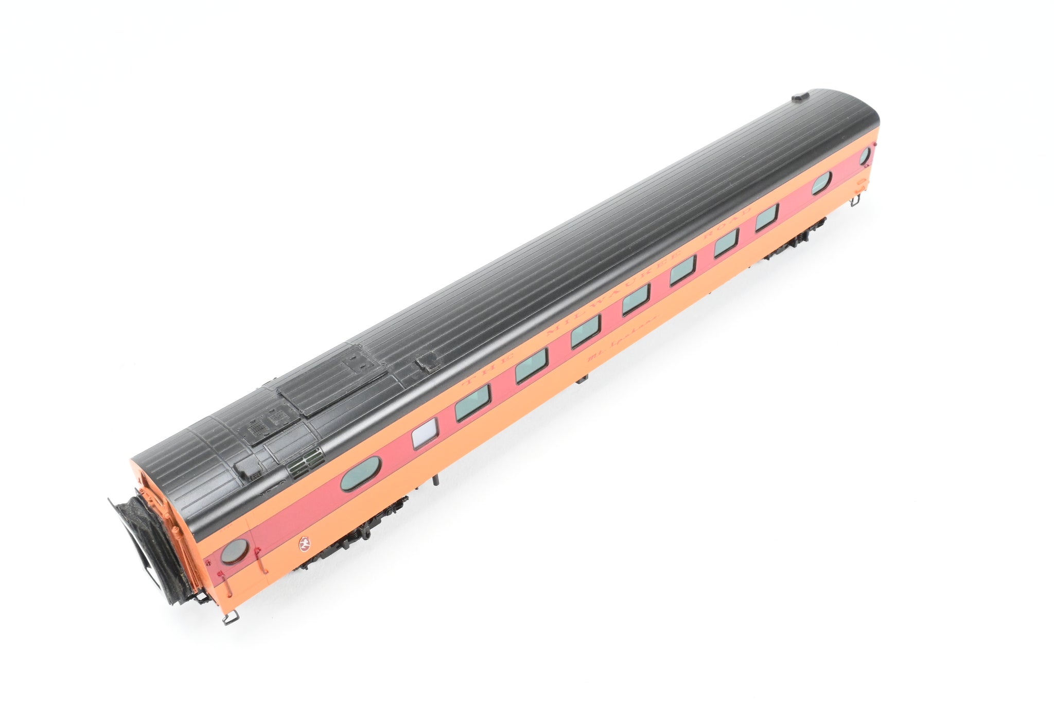 Shoreham Shops imported model built by Ajin Precision in Korea. Original box shows minimal wear. No spare parts included. Factory painted in the 1952 Hiawatha scheme and car number 5740, lettered "Mt Spokane". Car has window glazing and aftermarket diaphragms installed. The Milwaukee Road's 14-section Touralux sleeping cars numbered 5740 through 5754 (known as the "Mountain" series) were built in the railroad's own shops during 1947 and 1948 for service on the Olympian Hiawatha. A beautifully decorated car that shows minor use.