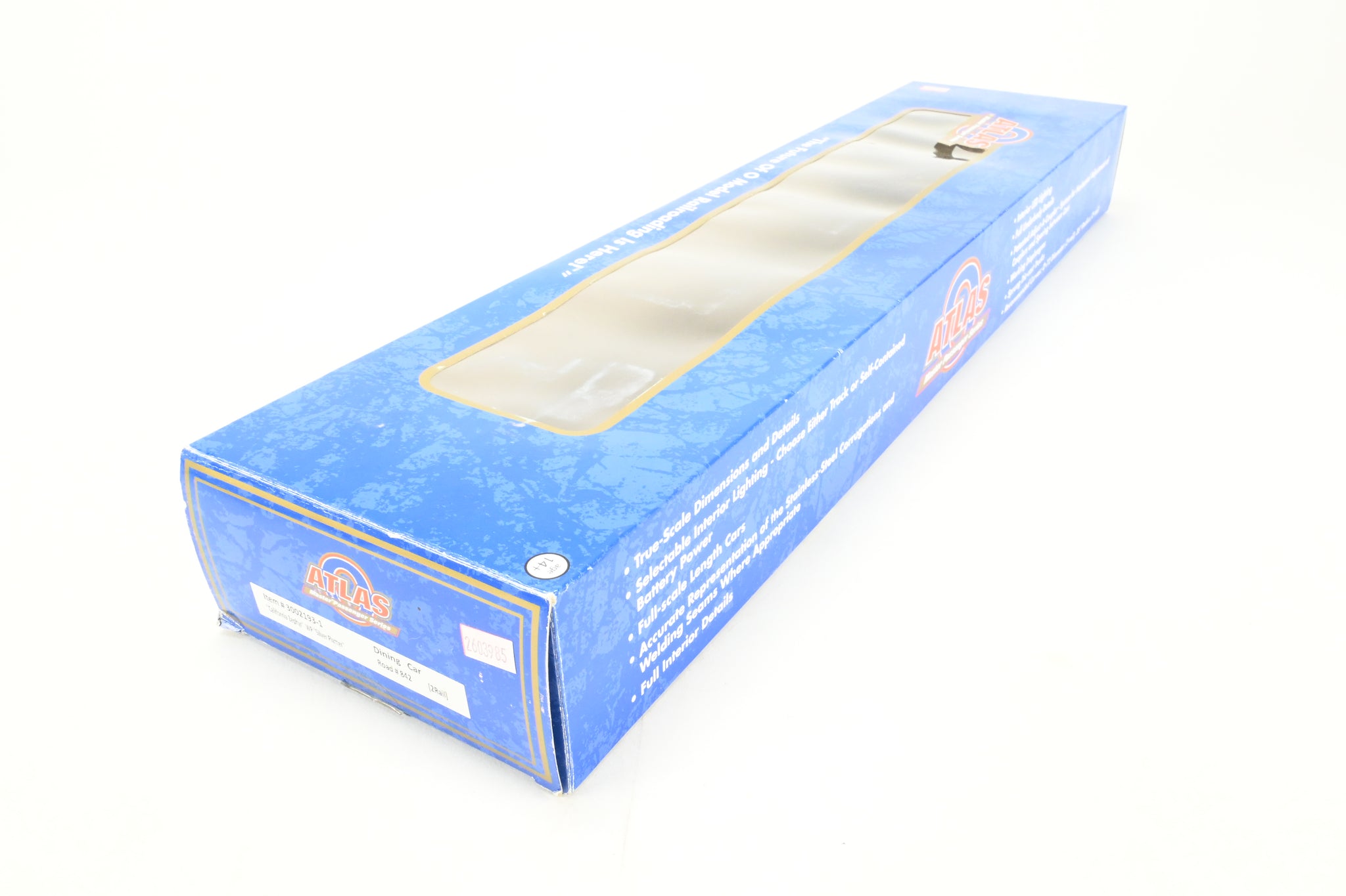 "O" Gauge 2-Rail made in China for Atlas. Original box shows very minimal shelf wear. This is a model of a California Zephyr Budd Dining car. Car has factory lighting and passenger figures in the car - see photos. Model is equipped with proper Kadee couplers.