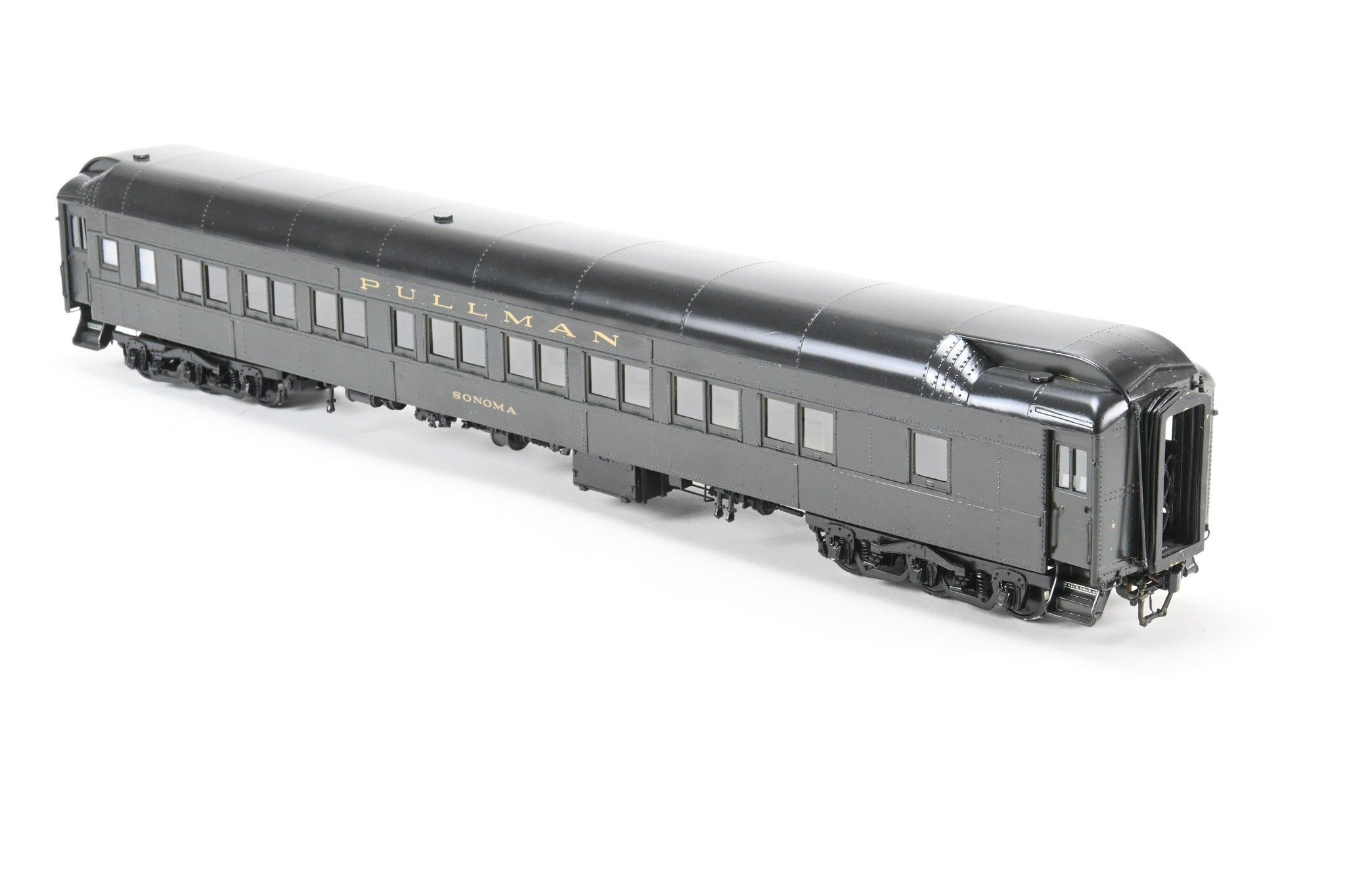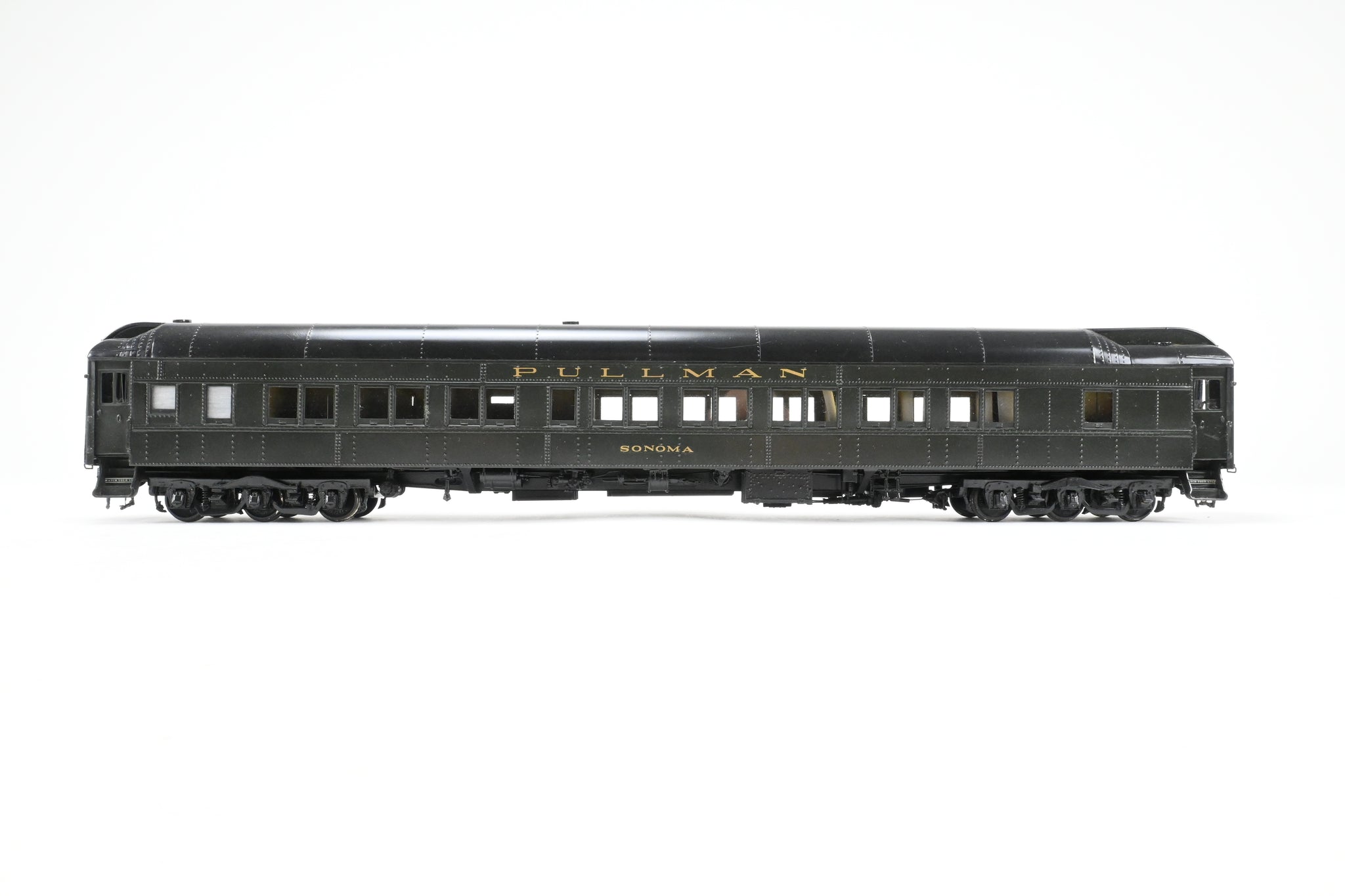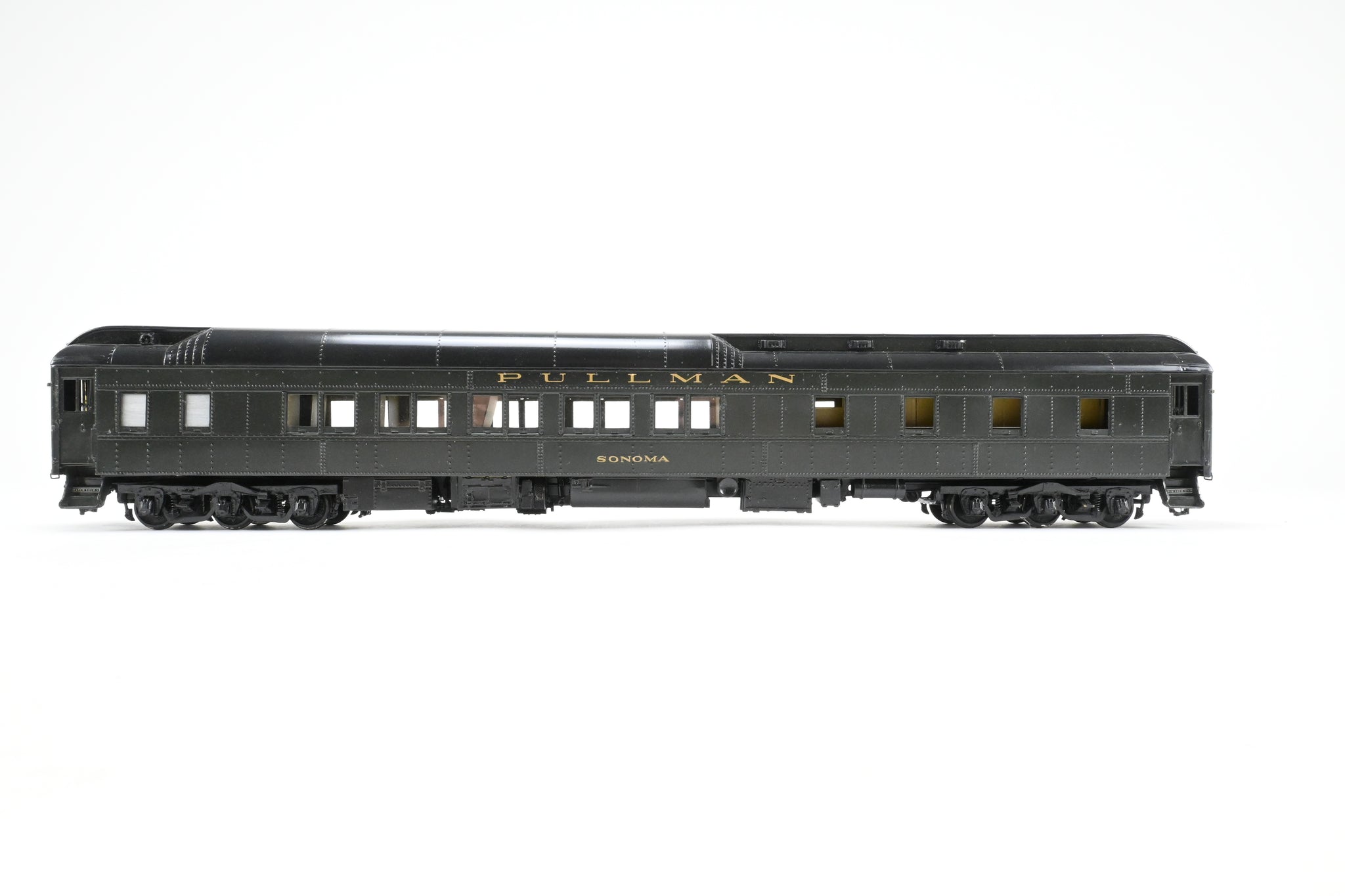 O scale PSC - Precision Scale Co. imported model built by Dae Ha in Korea. Box shows some wear, and fading. Diaphragms included. Various railroads owned these cars. Factory painted in Pullman Green with black roof. Lettered "Sonoma" This is a 10-Section 1 DR-2 Comp HW sleeper with A/C. Model is in excellent condition.