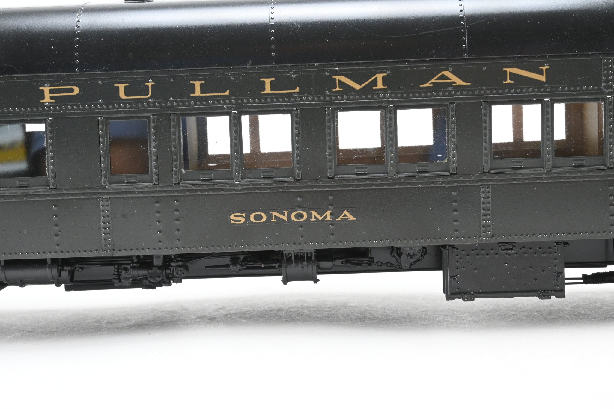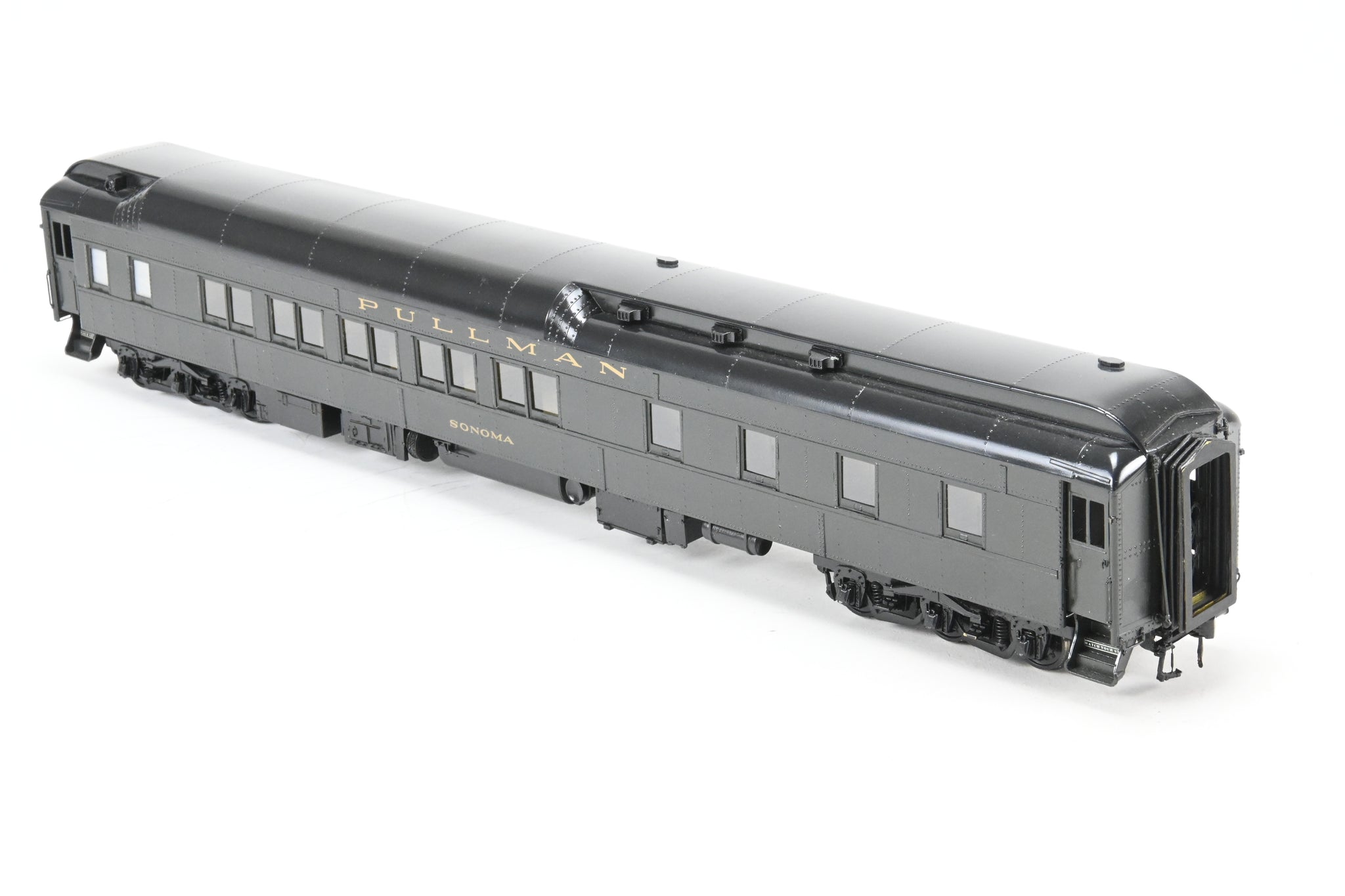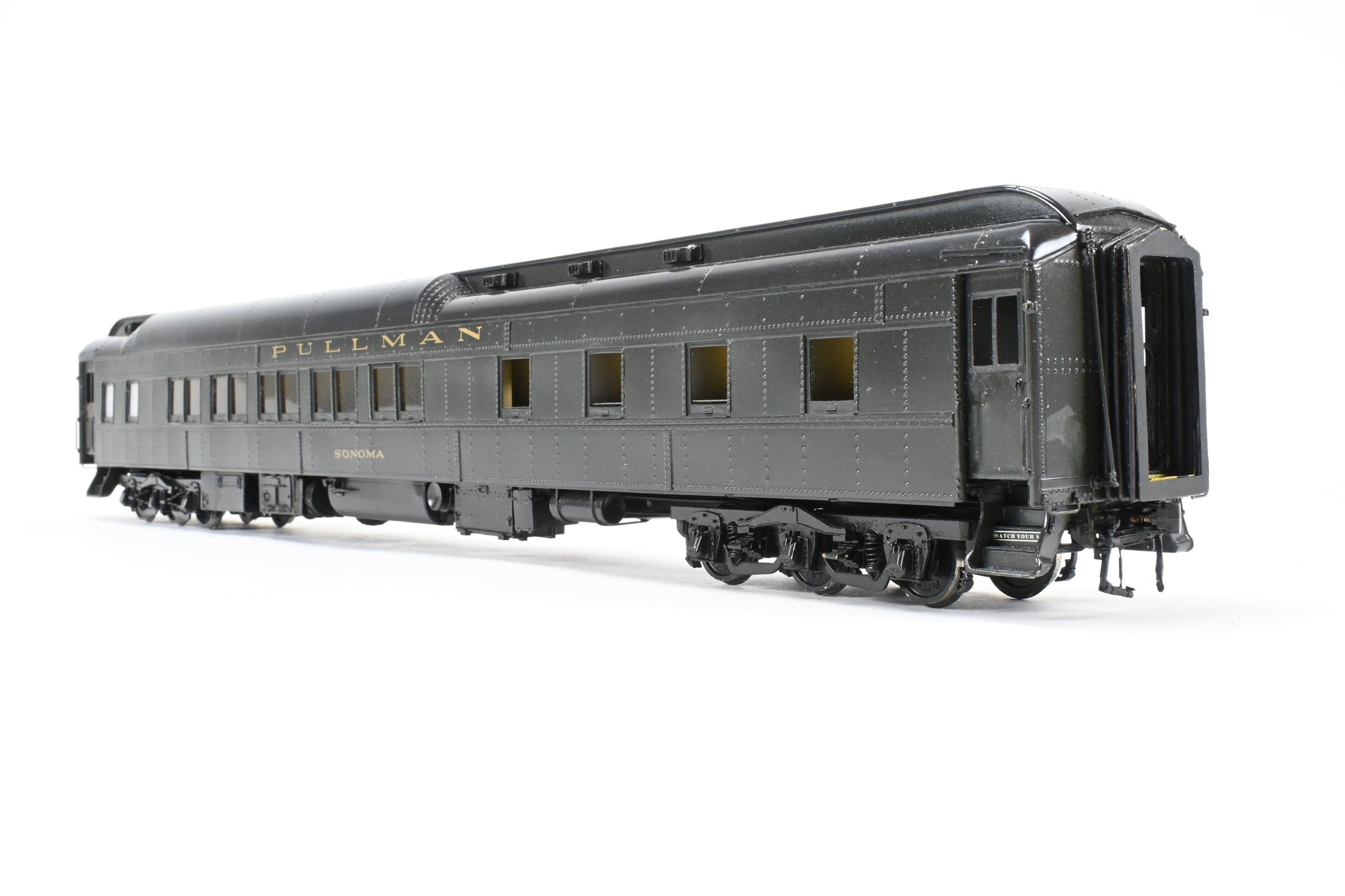 O scale PSC - Precision Scale Co. imported model built by Dae Ha in Korea. Box shows some wear, and fading. Diaphragms included. Various railroads owned these cars. Factory painted in Pullman Green with black roof. Lettered "Sonoma" This is a 10-Section 1 DR-2 Comp HW sleeper with A/C. Model is in excellent condition.
