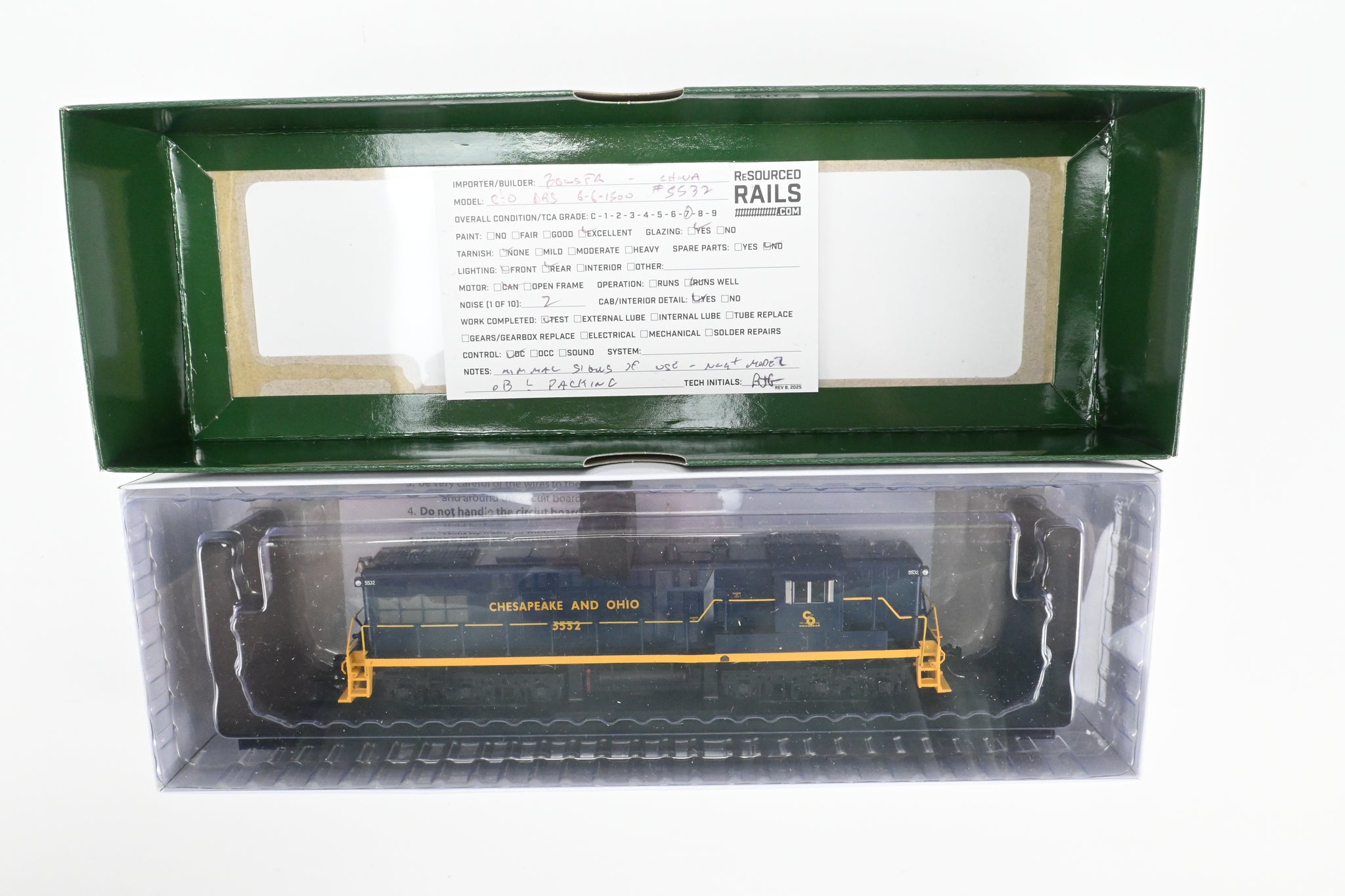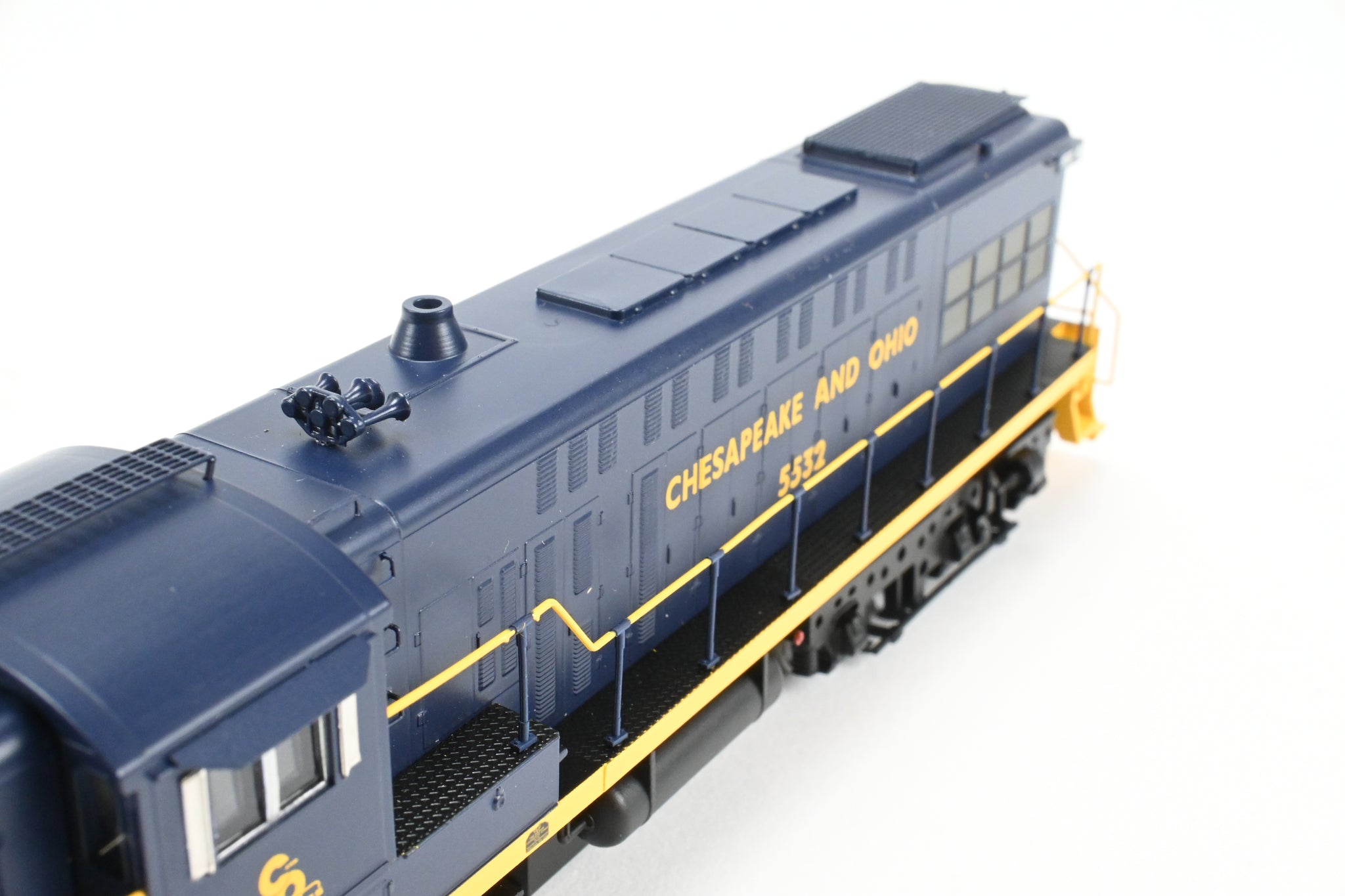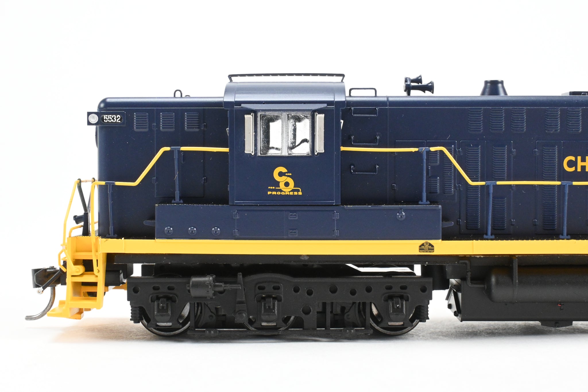 Bowser imported model made in China. Original box shows minimal shelf wear. No spare parts. NOTE: This is a DCC Ready model that runs on conventional DC power. Fully detailed, with an excellent factory paint job in Chesapeake and Ohio No 5532. Minimal signs of use.