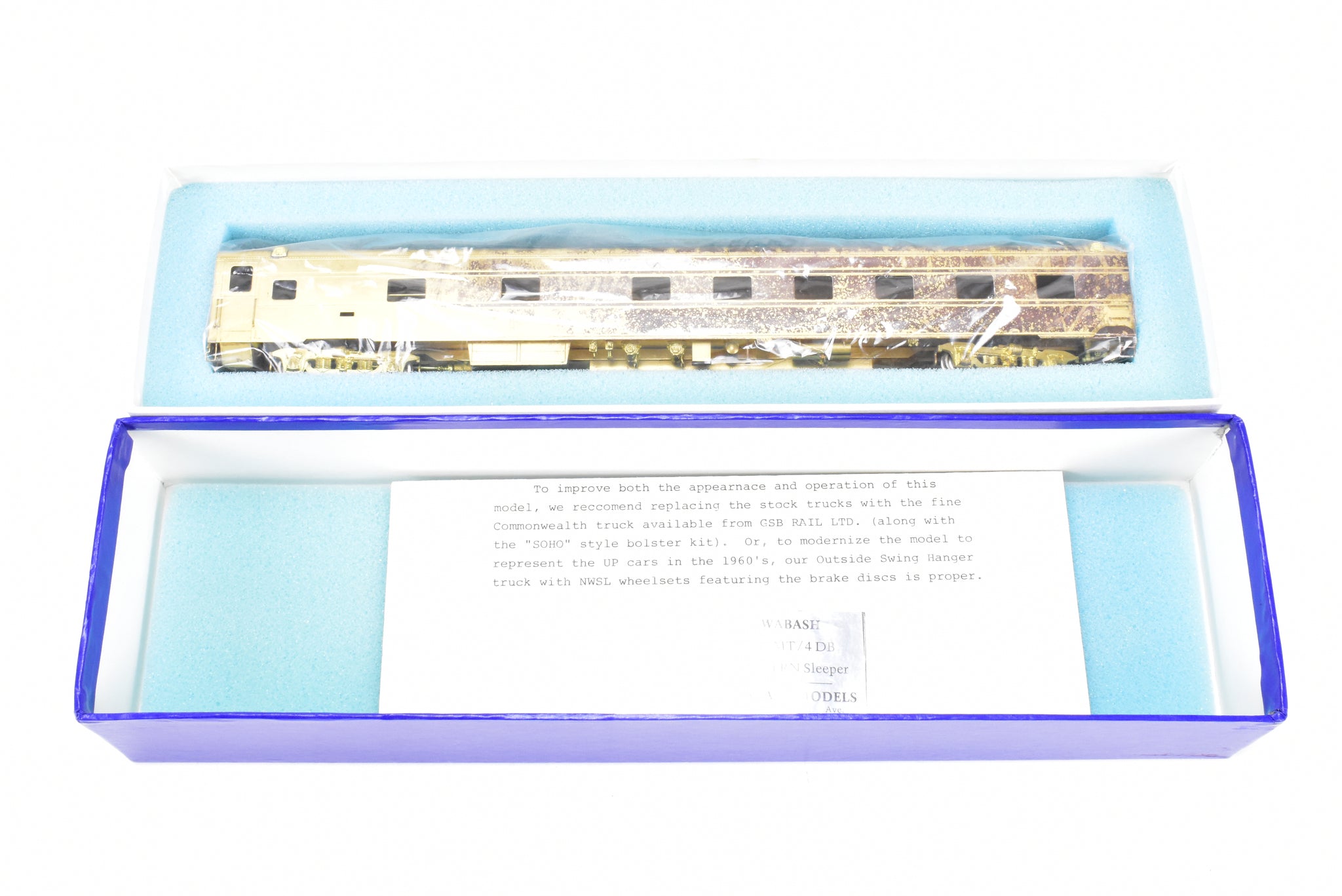 1988 run Cascade Models model built by Kumata in Japan. Box shows minimal shelf wear. No spare parts included bit original paperwork is. Moderate to heavy tarnish that should come off with proper paint preparation (media blasting). 17 of these sleepers were built by ACF in 1949 allocated as follows: UP received 11, Wabash received 4 (for City of St. Louis Service), and 2 for the C&NW ("Cities" streamliner service until 1955).