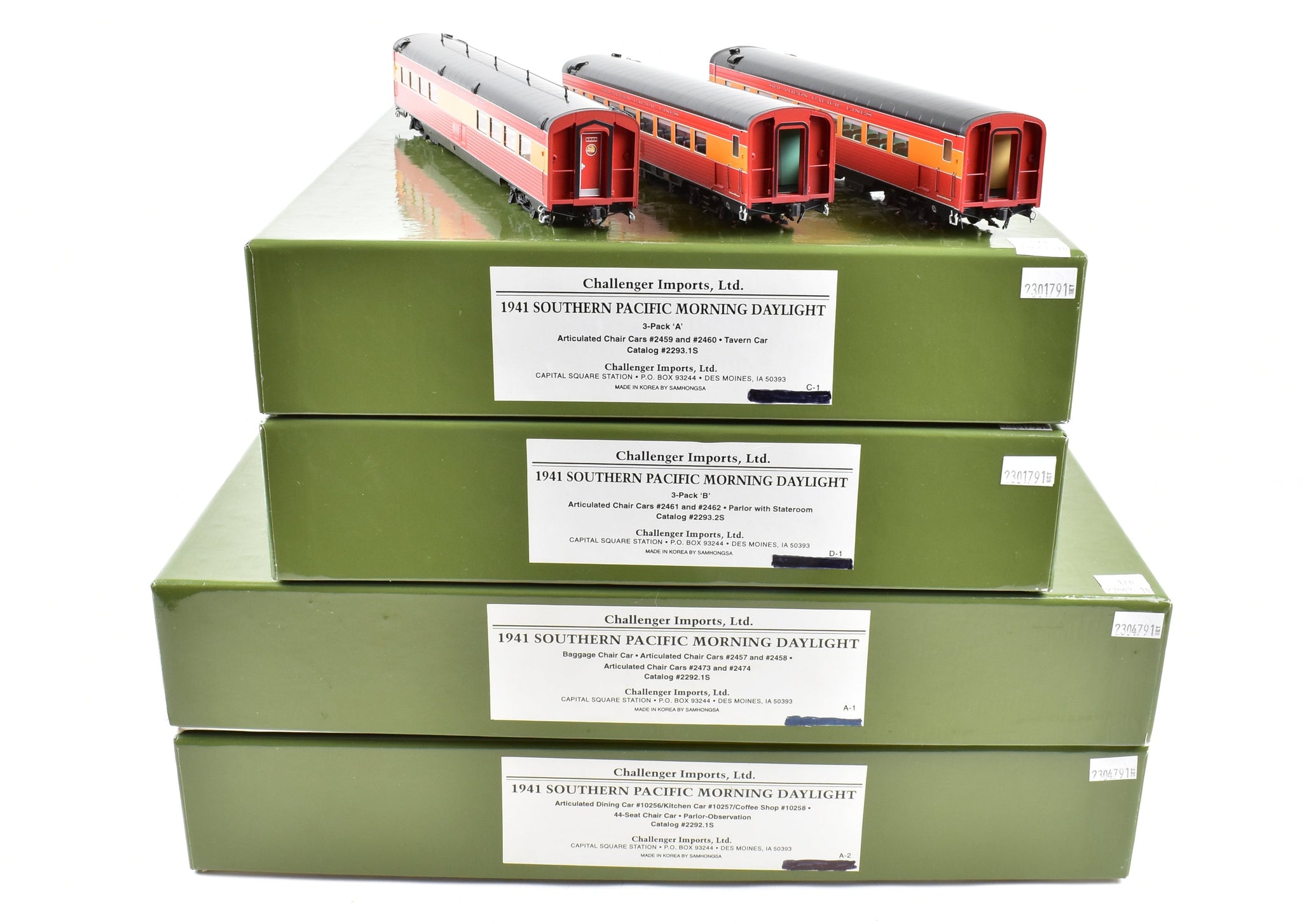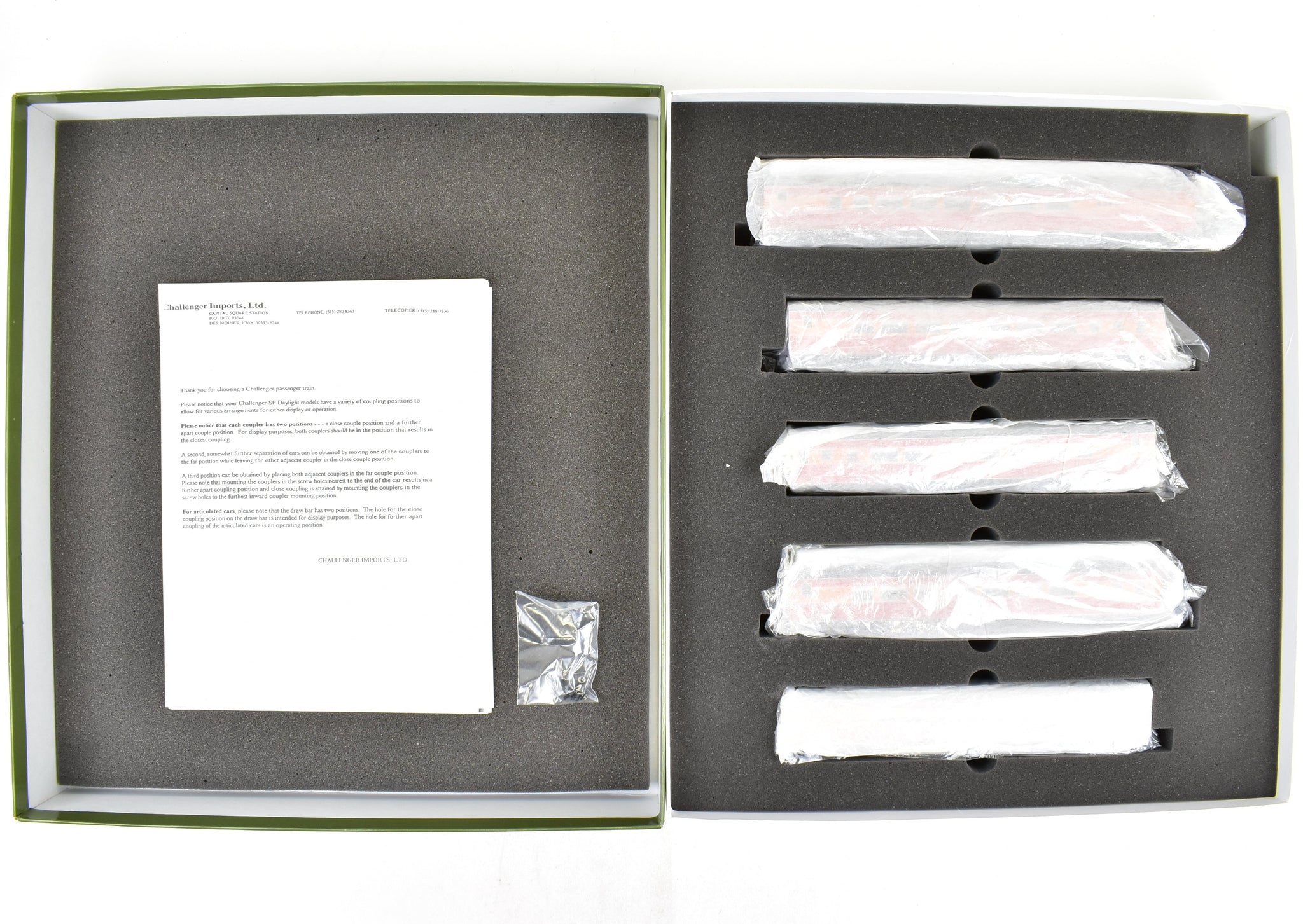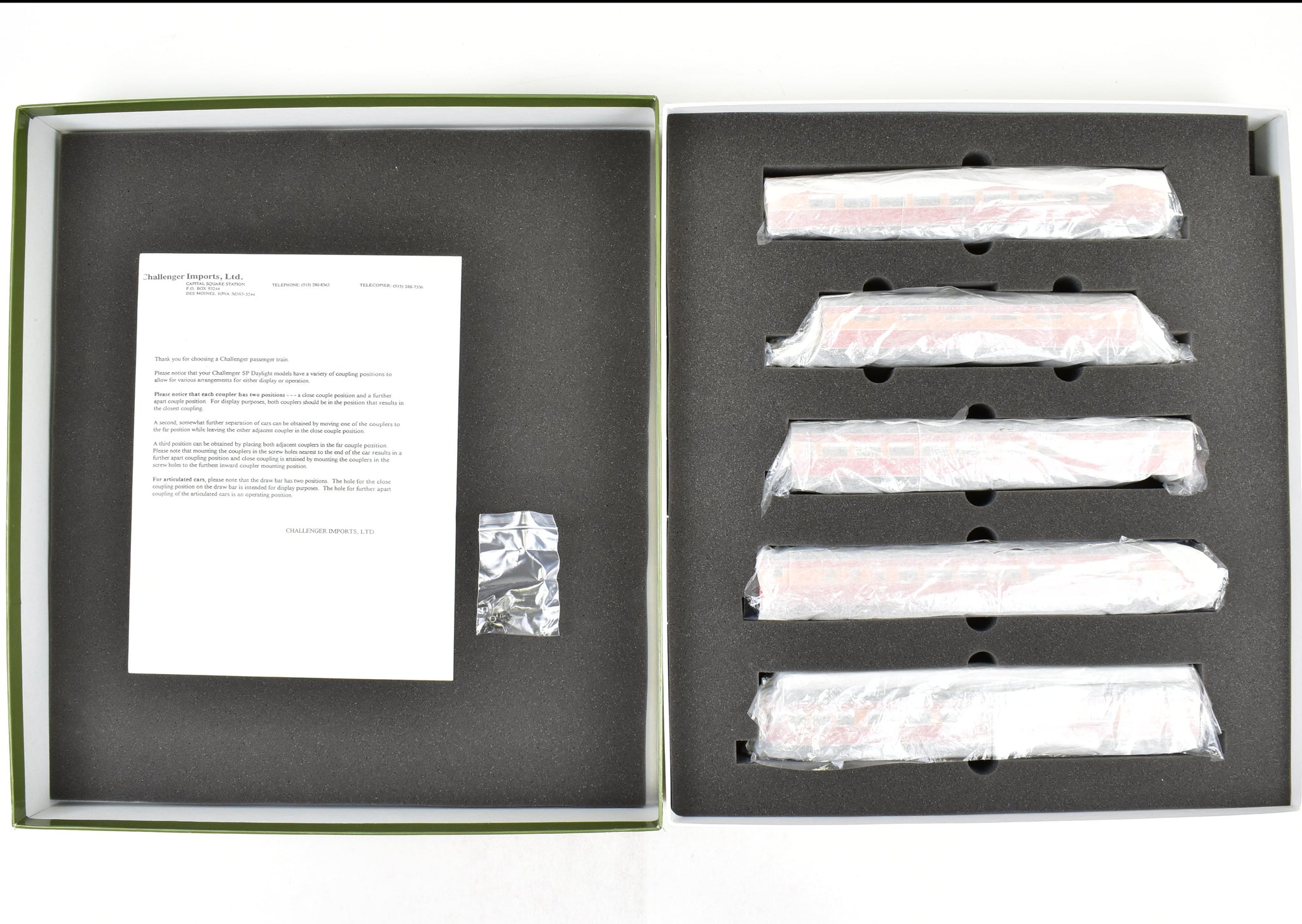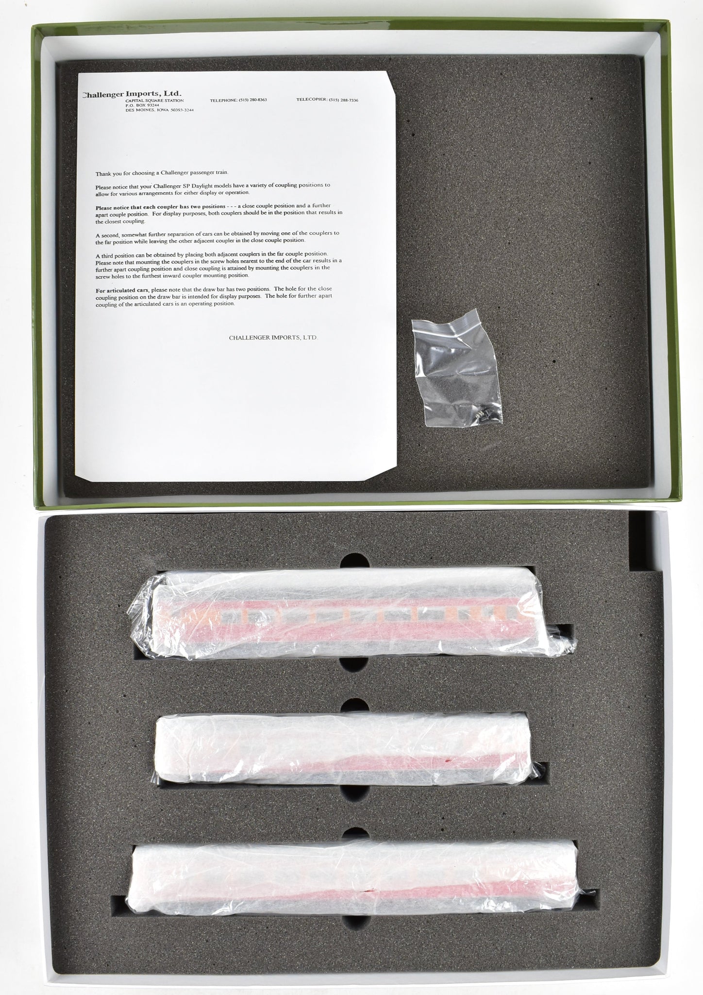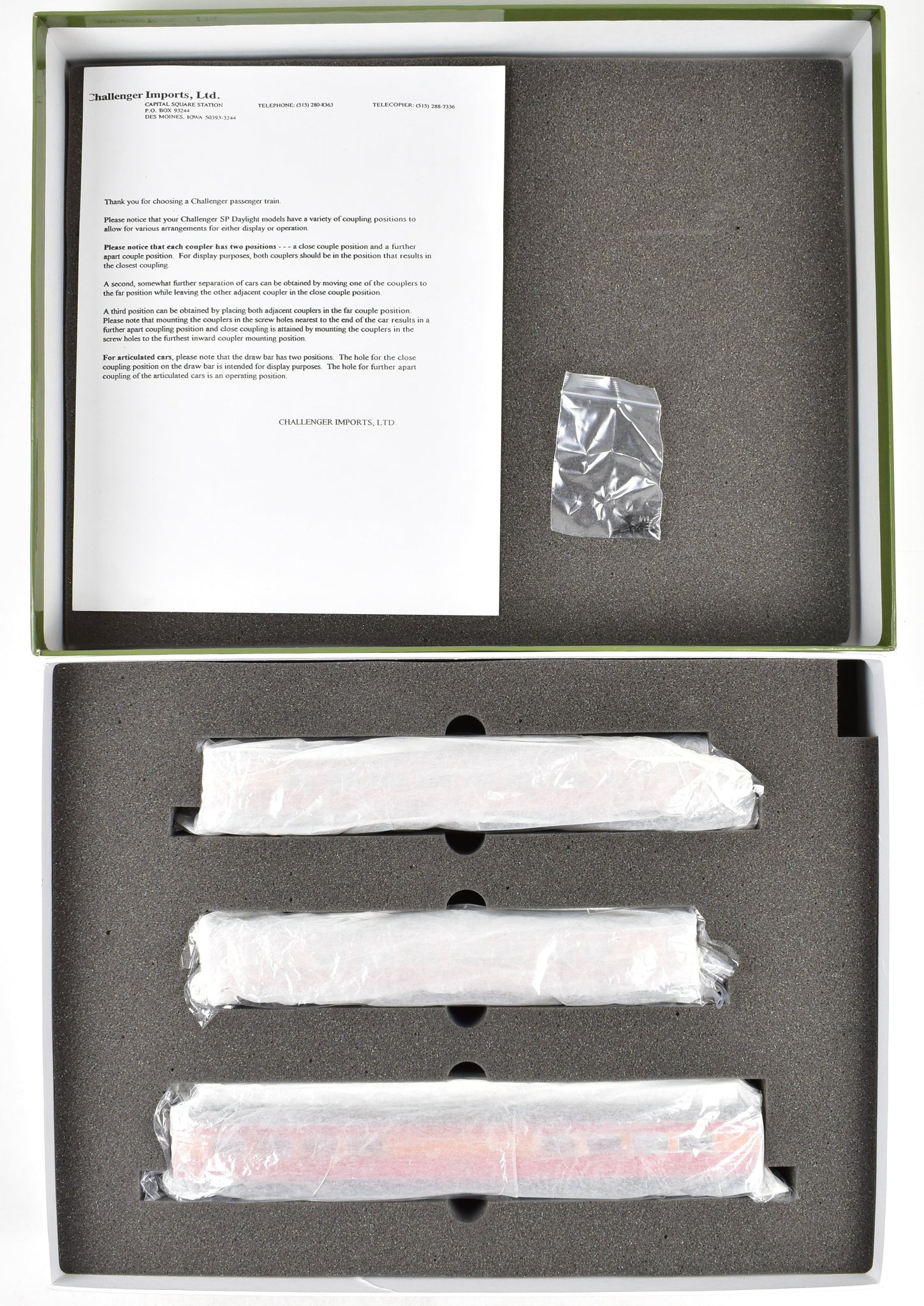 1999 run Challenger Imports models built by Samhongsa in Korea. Box shows minimal shelf wear. Spare parts included. Factory finished with window glazing, interiors, and diaphragms installed. Represents a full 16-car consist that would have operated at peak times on the coast line. Note: A couple trust plate etching are missing - see photos.