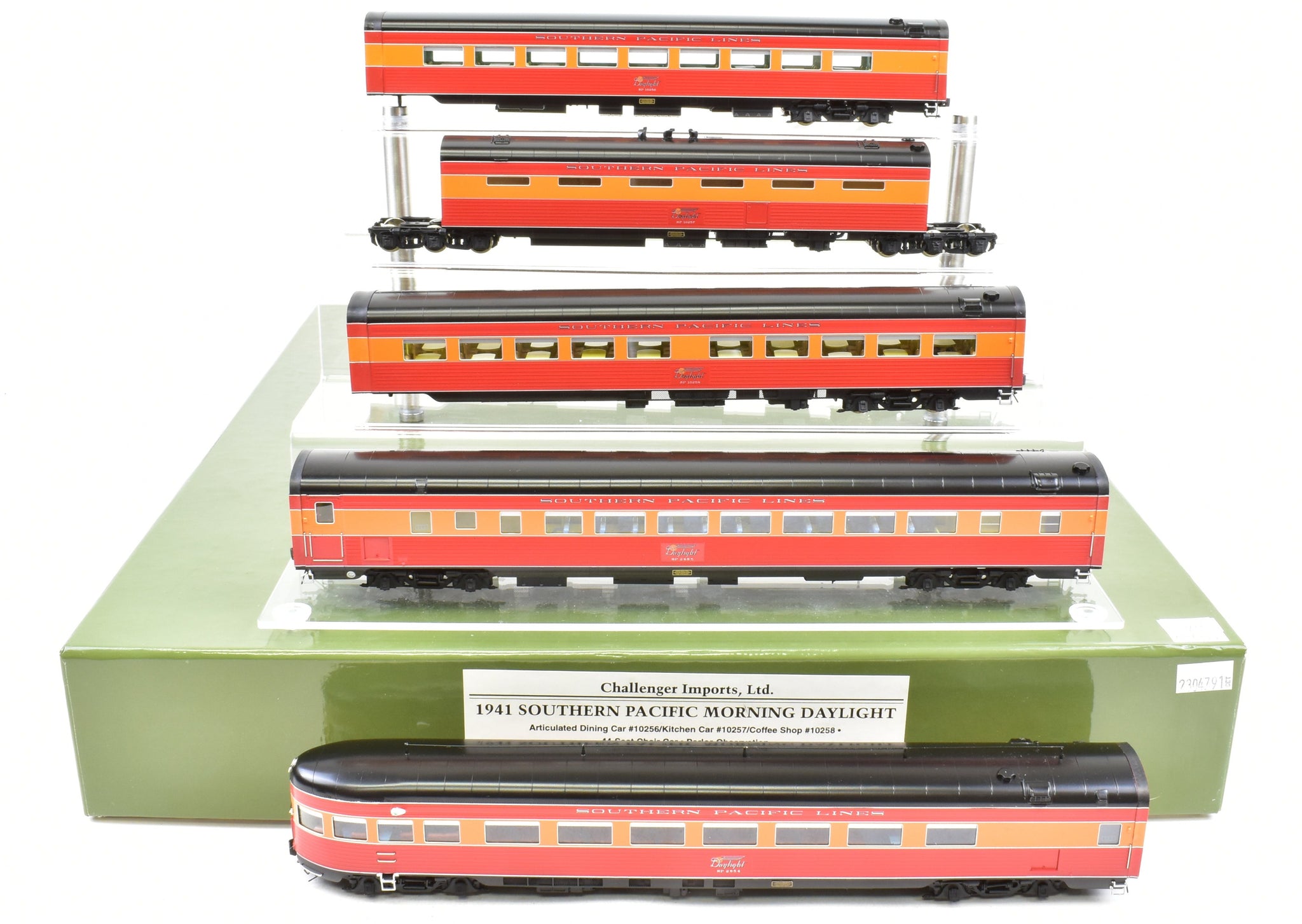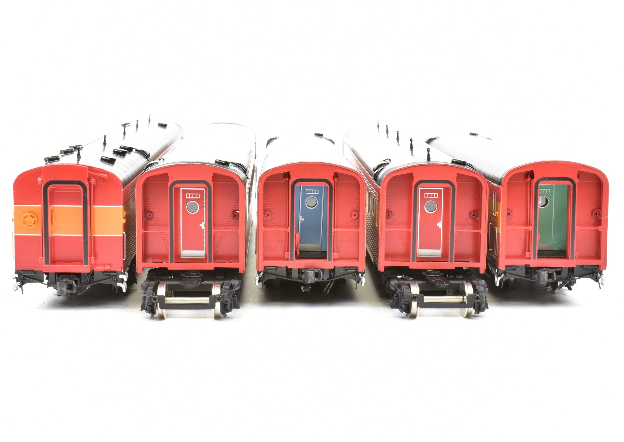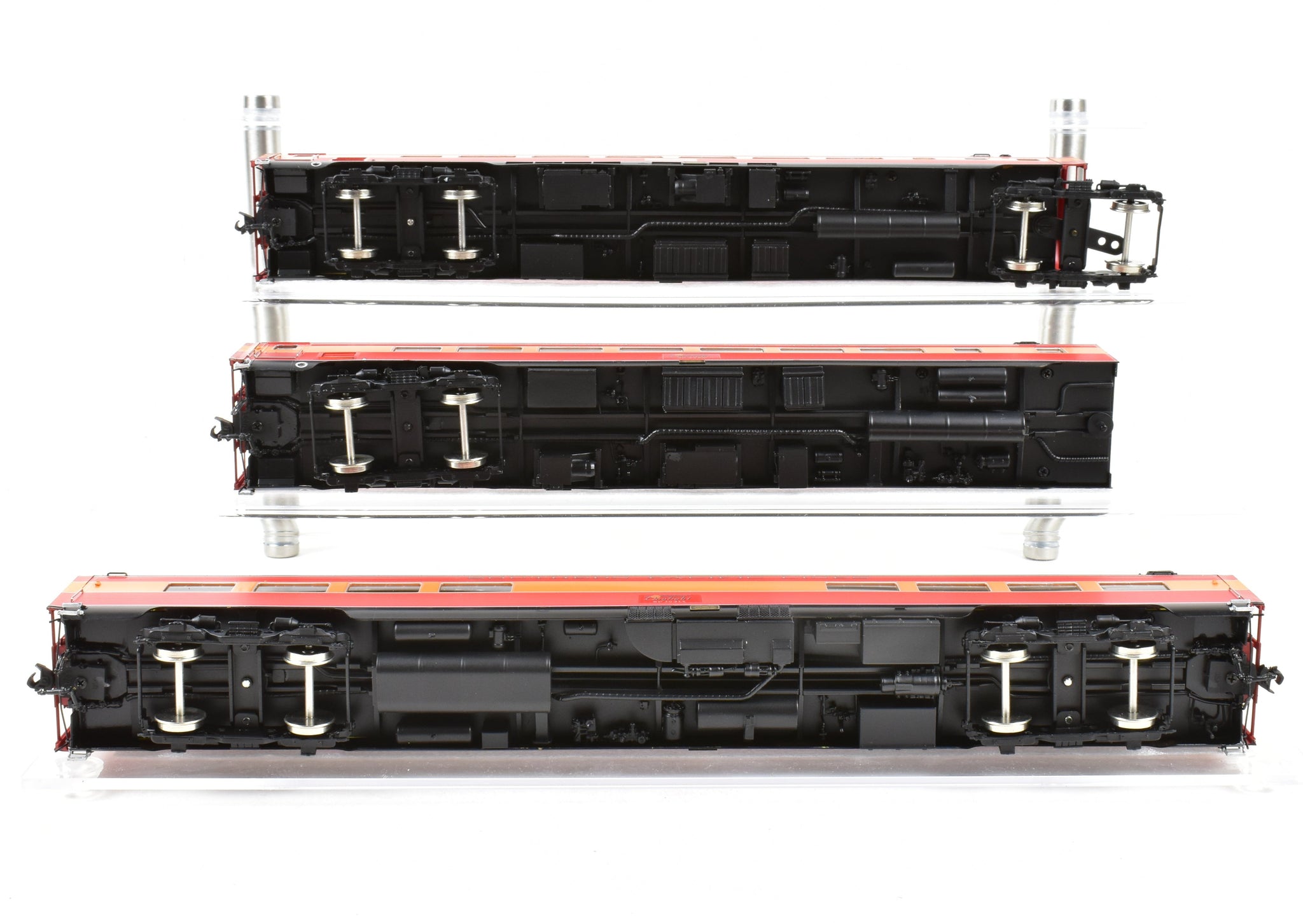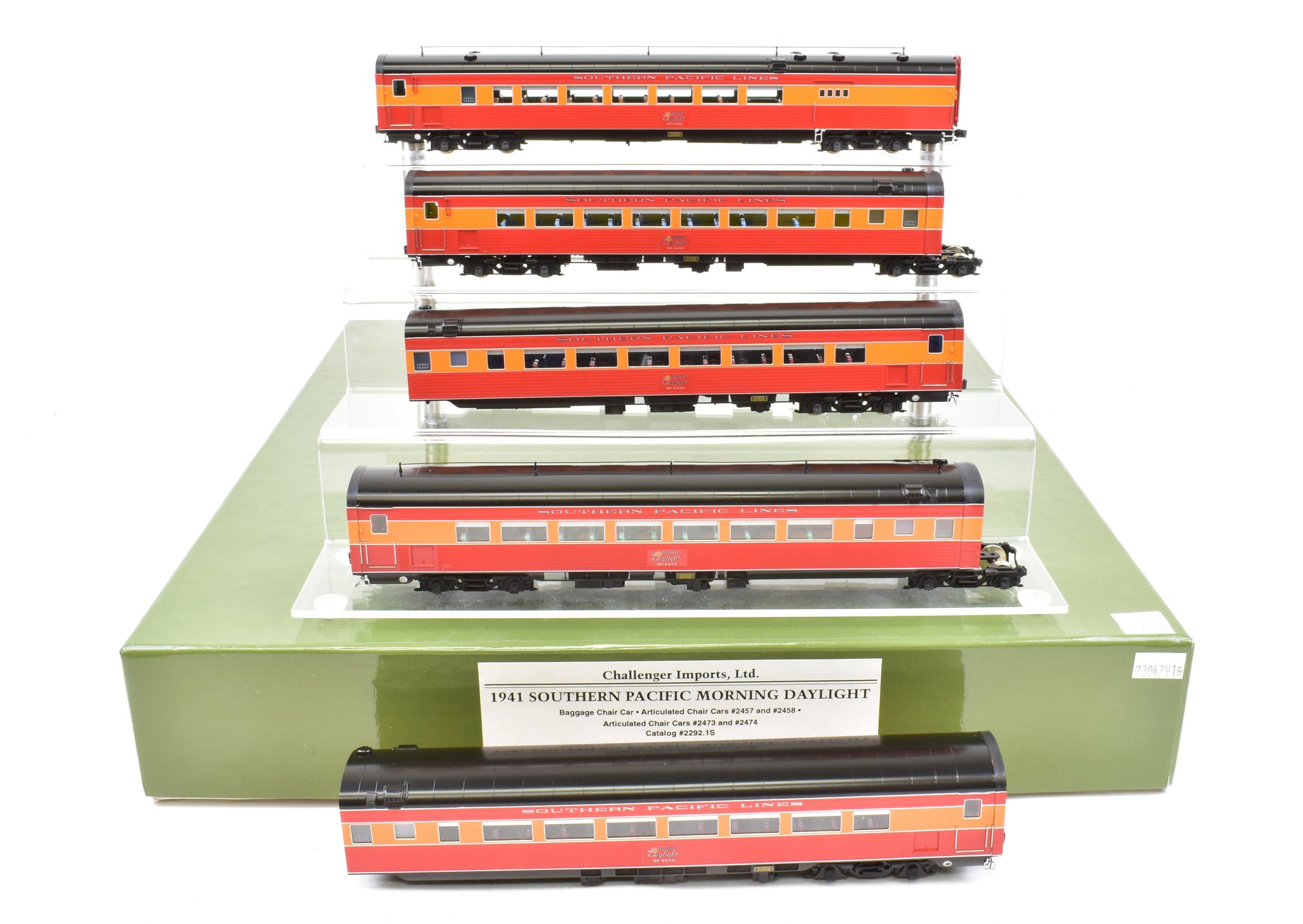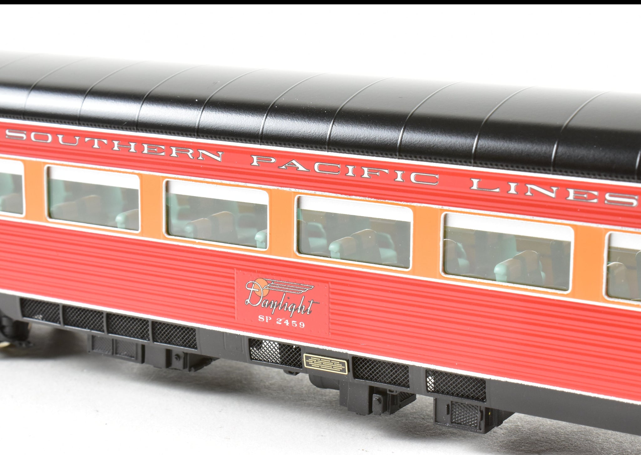 1999 run Challenger Imports models built by Samhongsa in Korea. Box shows minimal shelf wear. Spare parts included. Factory finished with window glazing, interiors, and diaphragms installed. Represents a full 16-car consist that would have operated at peak times on the coast line. Note: A couple trust plate etching are missing - see photos.