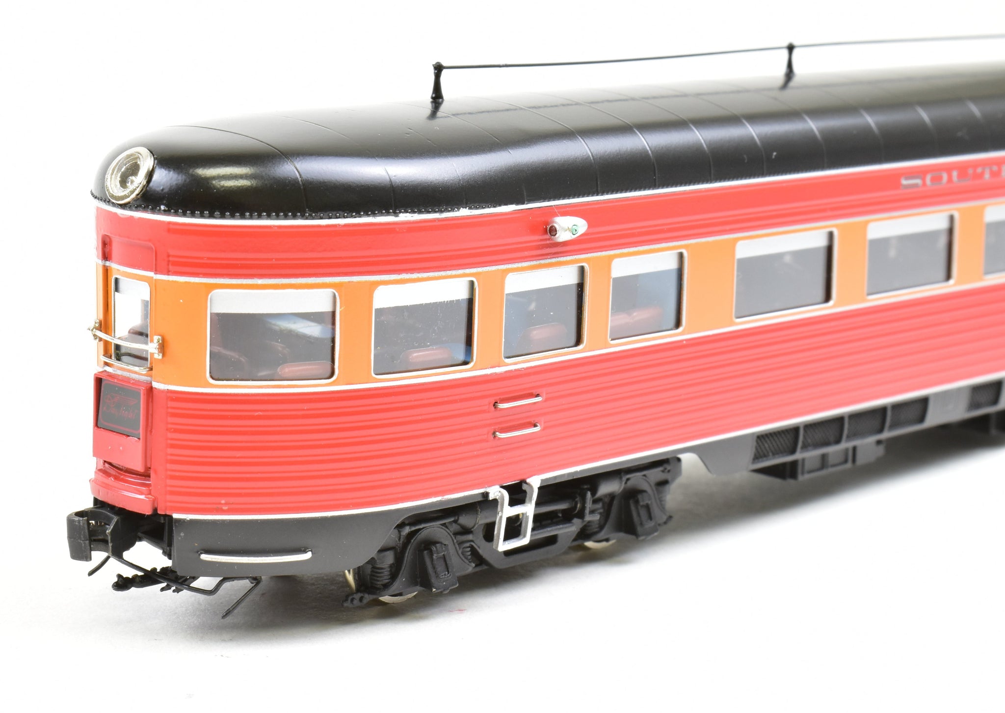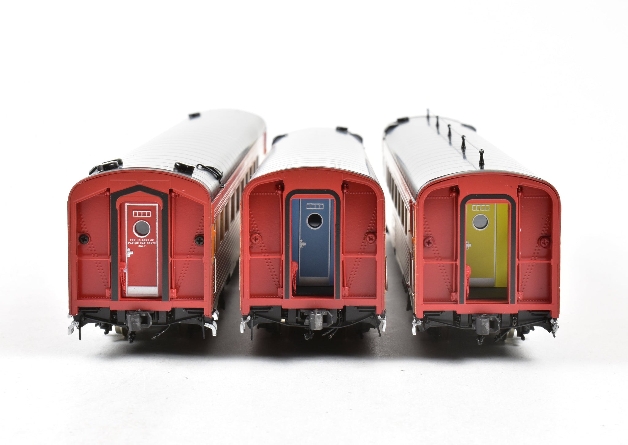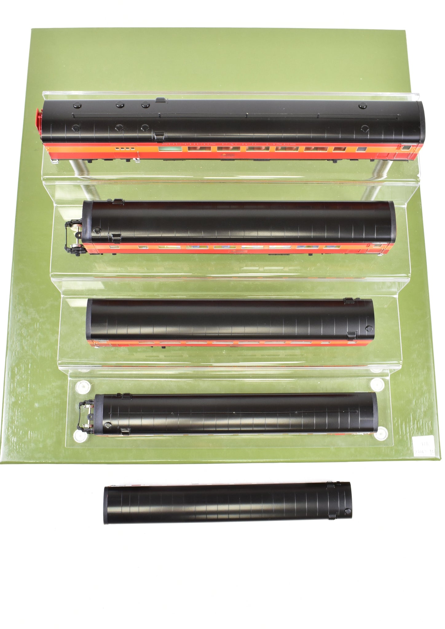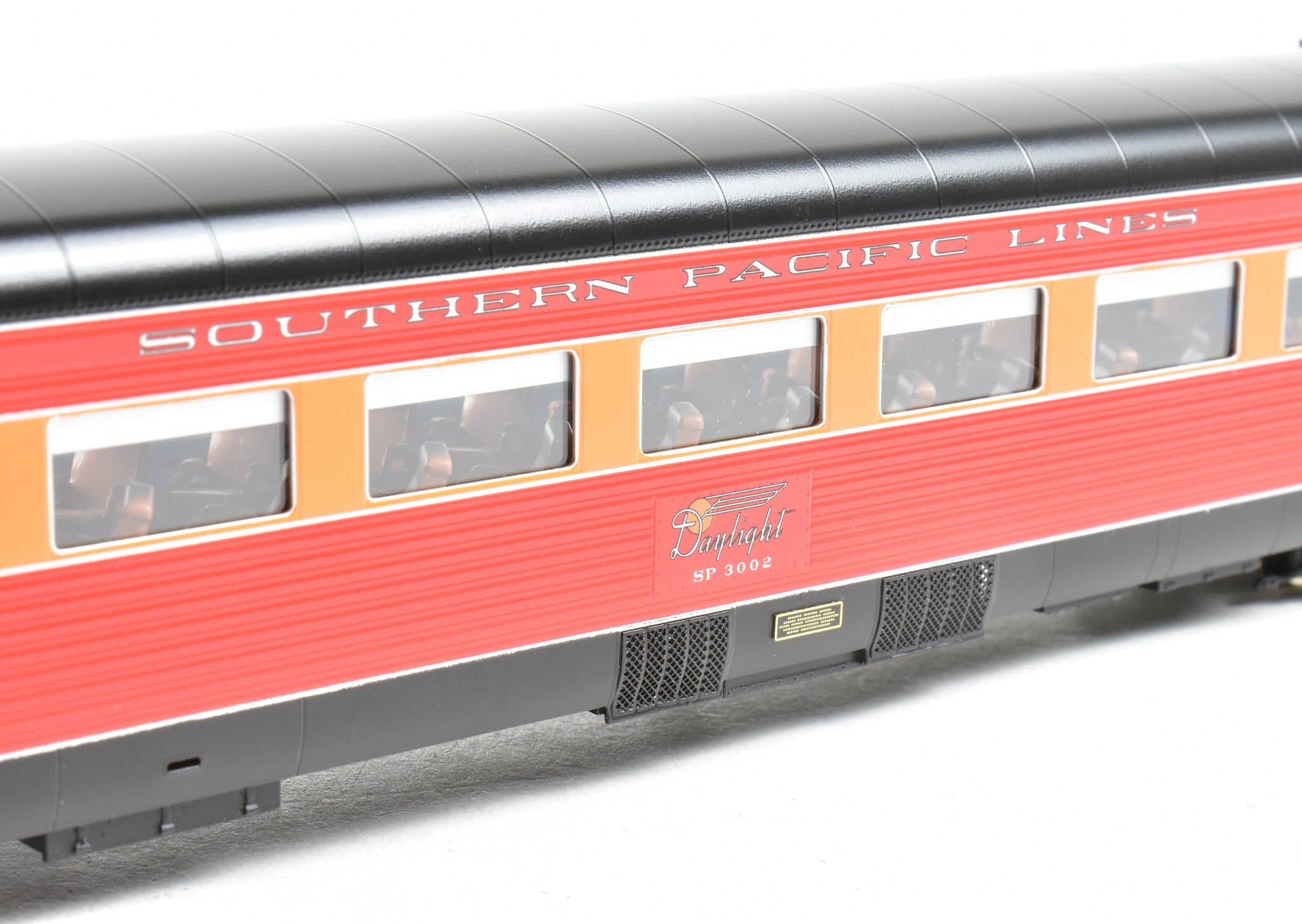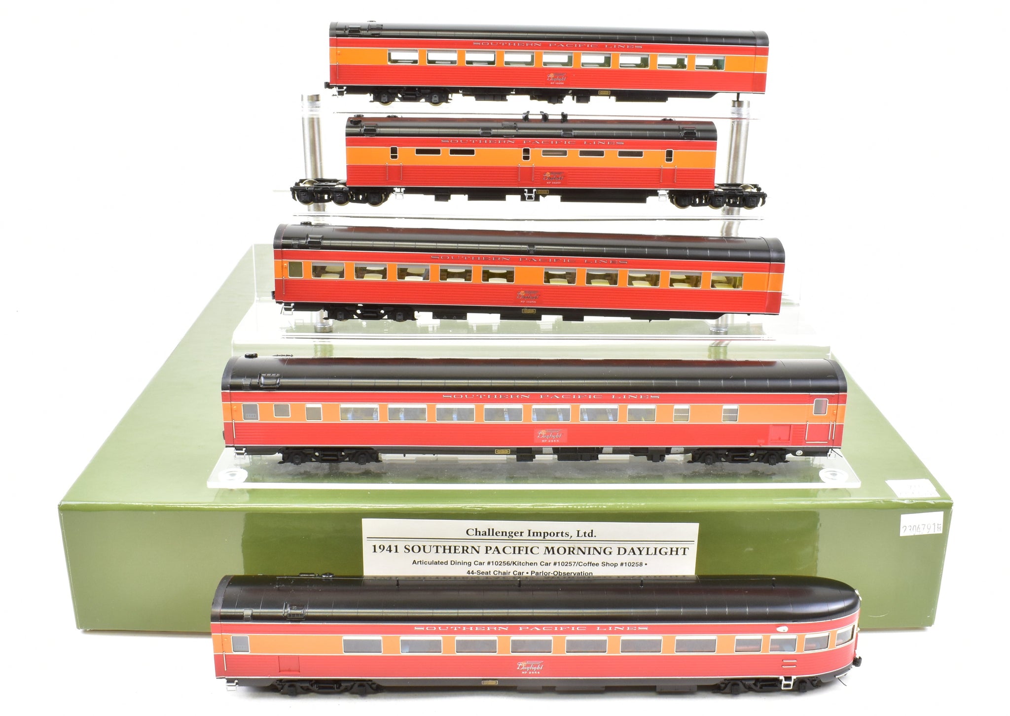 1999 run Challenger Imports models built by Samhongsa in Korea. Box shows minimal shelf wear. Spare parts included. Factory finished with window glazing, interiors, and diaphragms installed. Represents a full 16-car consist that would have operated at peak times on the coast line. Note: A couple trust plate etching are missing - see photos.