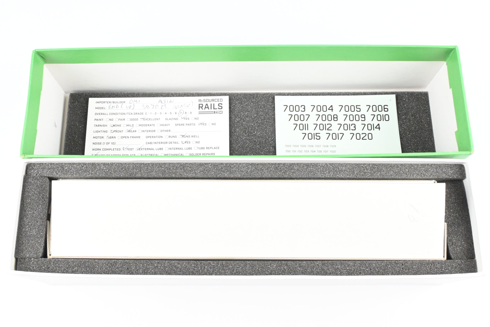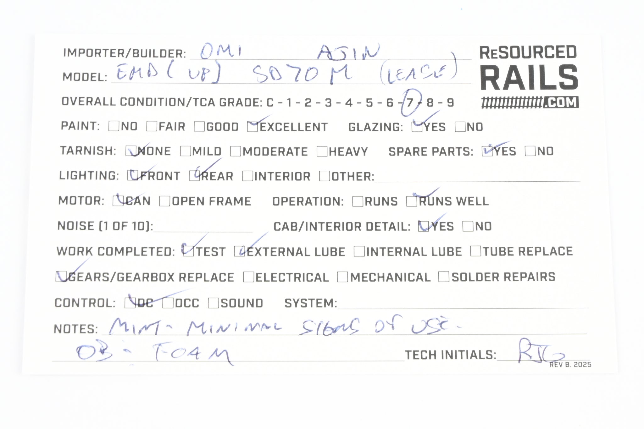 1995 run OMI - Overland Models, Inc imported model built by Ajin Precision Mfg. in Korea. Box shows virtually no shelf wear. Spare and detail parts included. Very little run time. Glazing installed. Represents units leased to the Union Pacific as Nos. 7003 - 7015, 7017, and 7020. A smooth and quiet runner, it's an excellent example of late run Ajin Precision Mfg. craftsmanship. Likely test run only, it shows very little evidence of use.