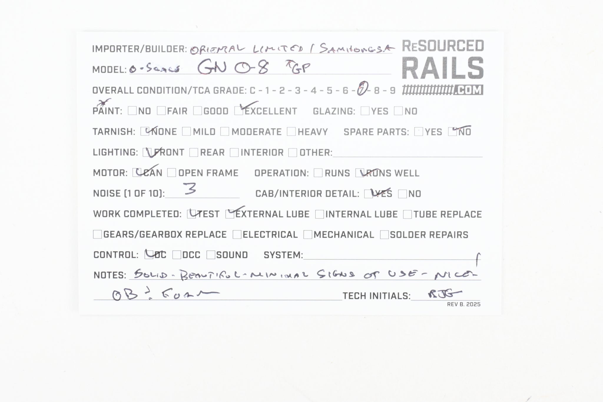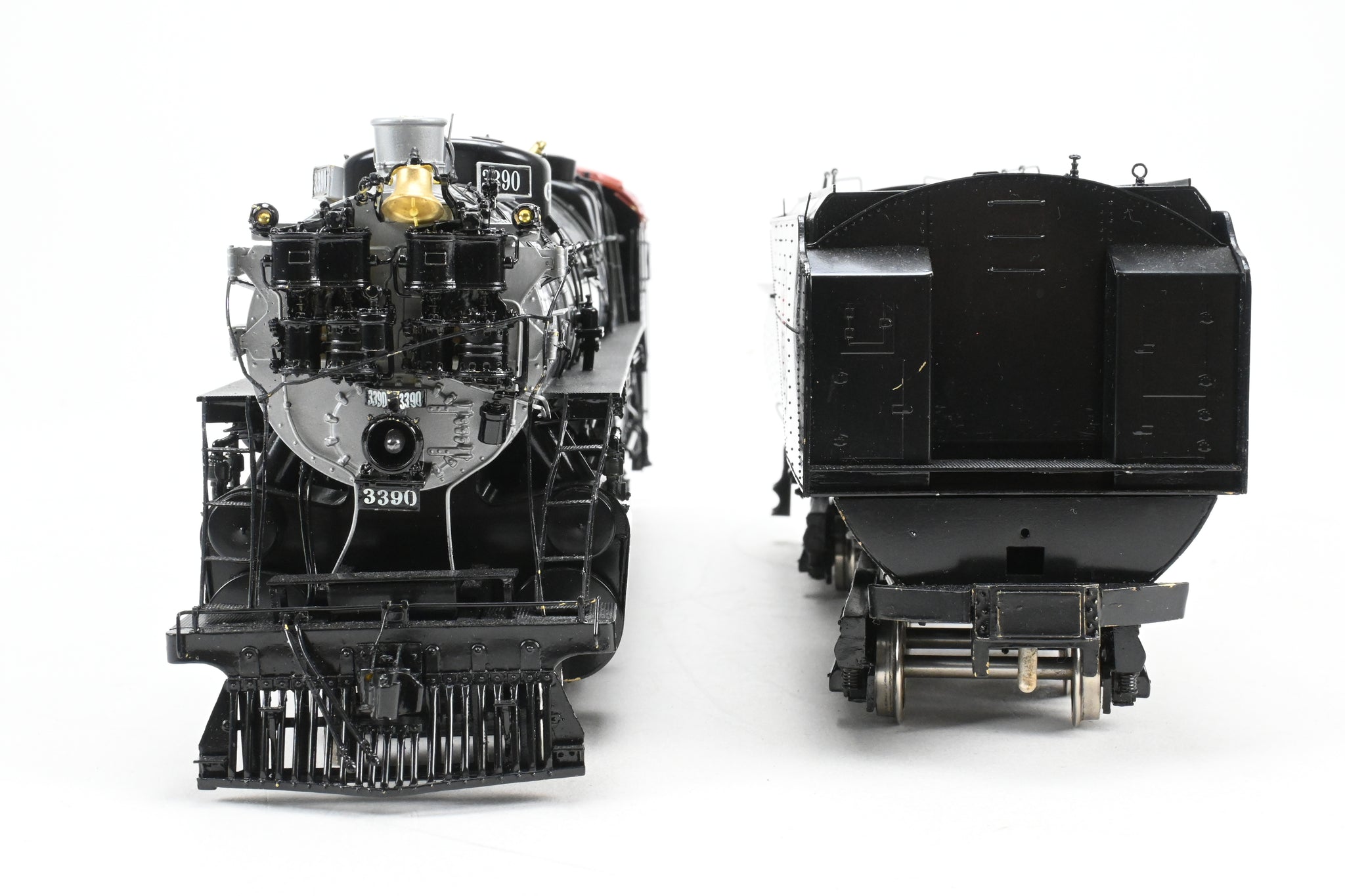 1984 run Oriental Limited model built by Samhongsa in Korea. Box shows minimal shelf wear. Hex head side rod bolts. No spare parts included. Excellent pro-paint work in GN's Glacier Park Scheme. Model is numbered 3390. Cab glazing installed. This is the Vestibule cab version. A nice model of a Great Northern O-8 2-8-2, with minimal signs of use. Very nice!