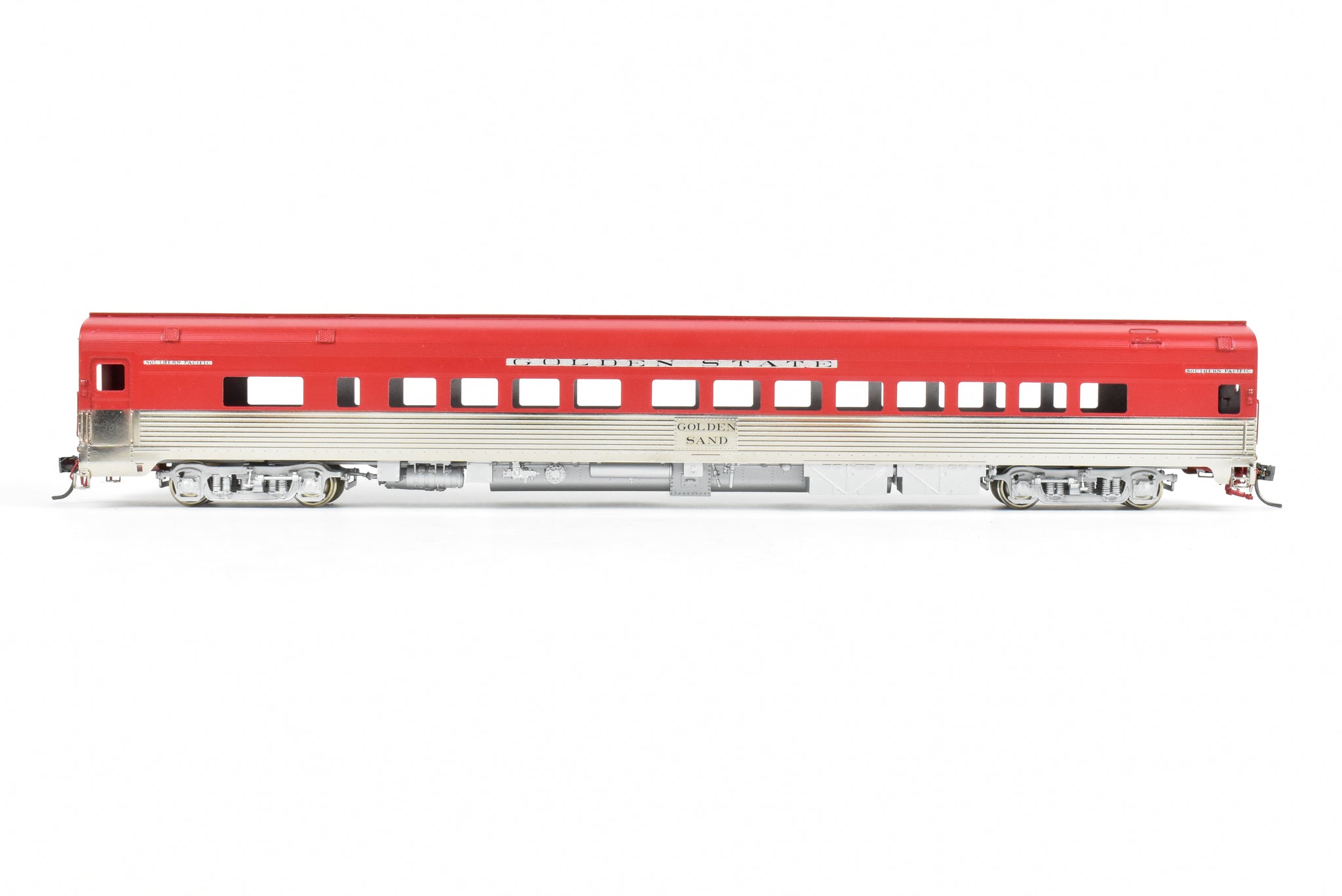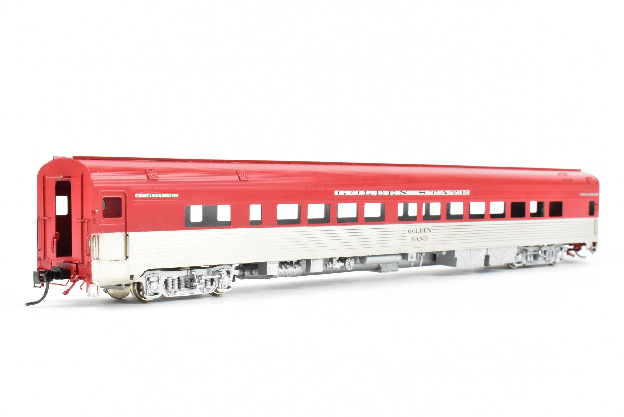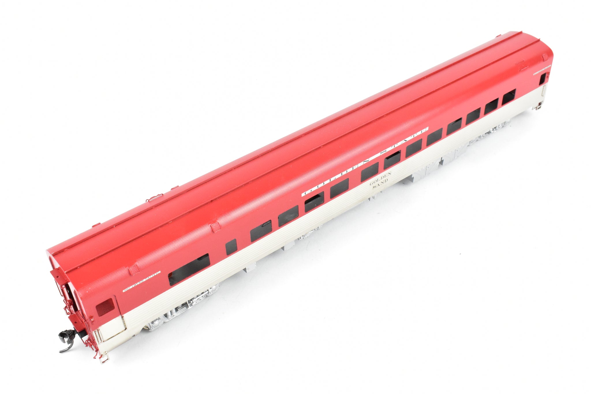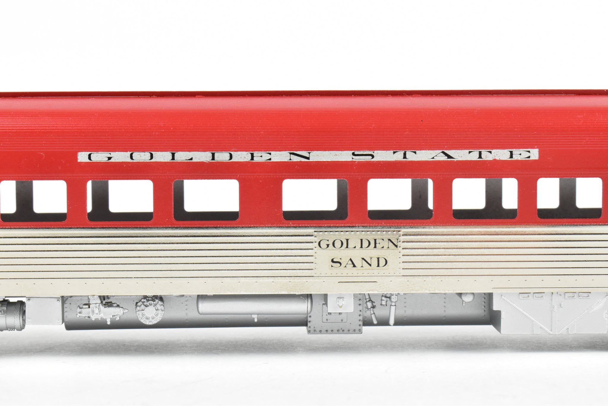 1990's run The Coach Yard imported model built by Samhongsa in Korea. Original, but incorrect, box shows minimal wear. Grey painted full width diaphragms included. This is actually a Budd built divided chair car that was used on the Sunset Limited. This example has been incorrectly painted into the Golden State scheme.
