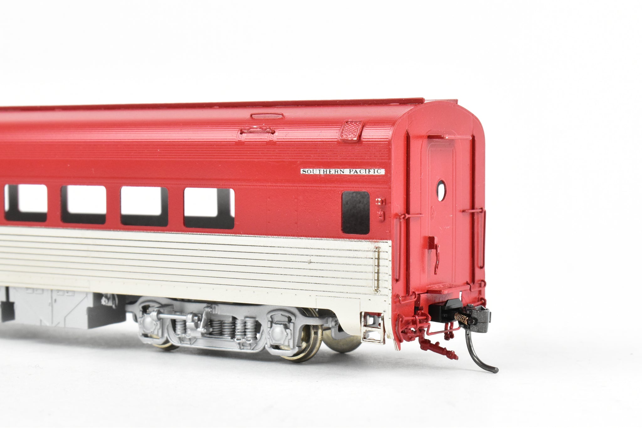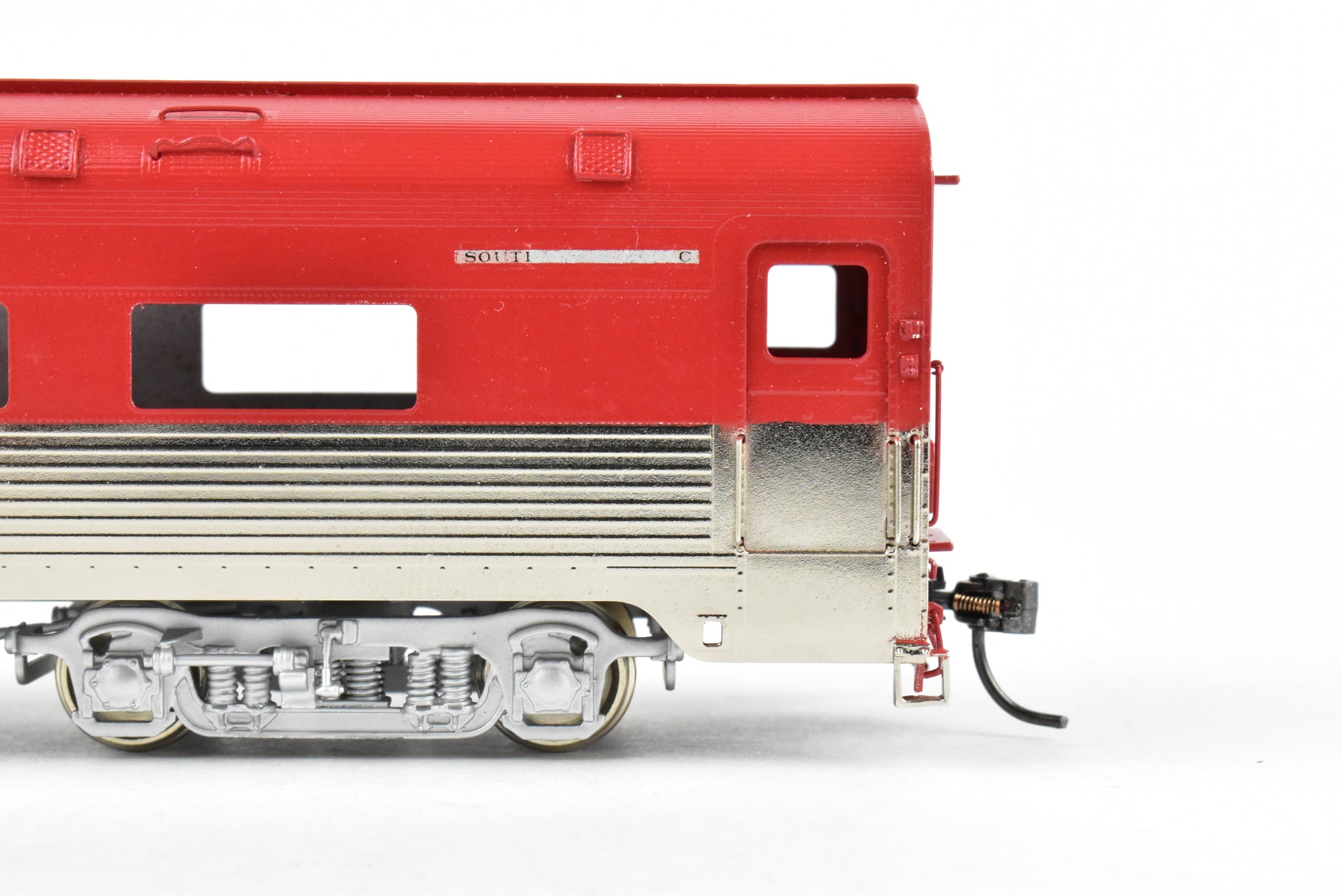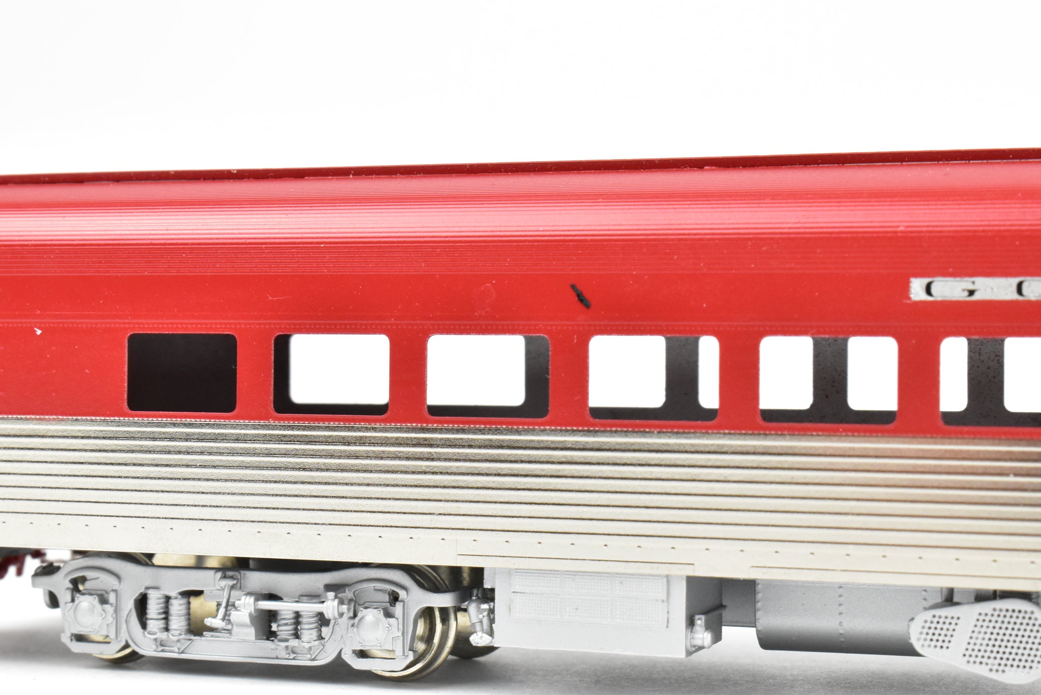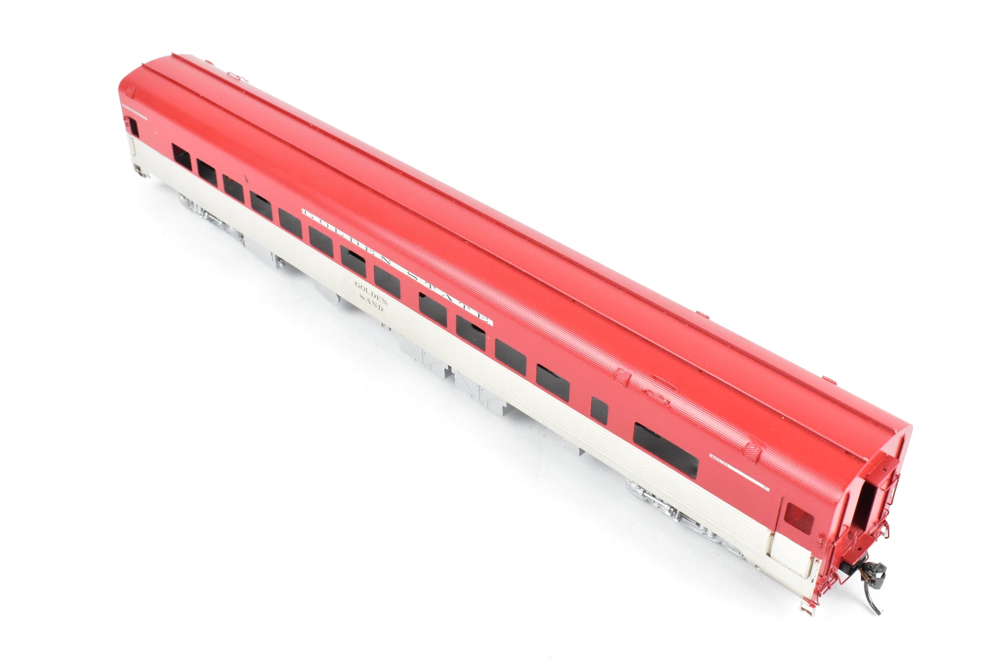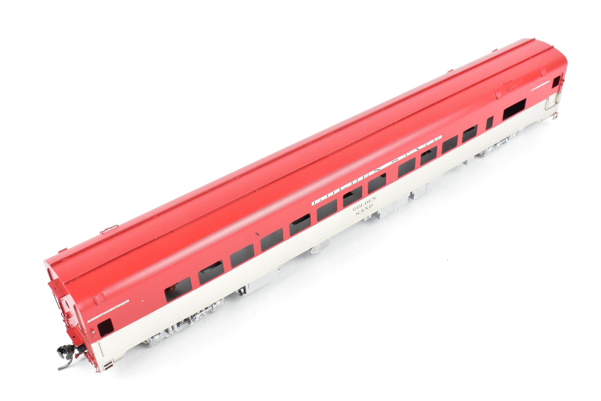 1990's run The Coach Yard imported model built by Samhongsa in Korea. Original, but incorrect, box shows minimal wear. Grey painted full width diaphragms included. This is actually a Budd built divided chair car that was used on the Sunset Limited. This example has been incorrectly painted into the Golden State scheme.