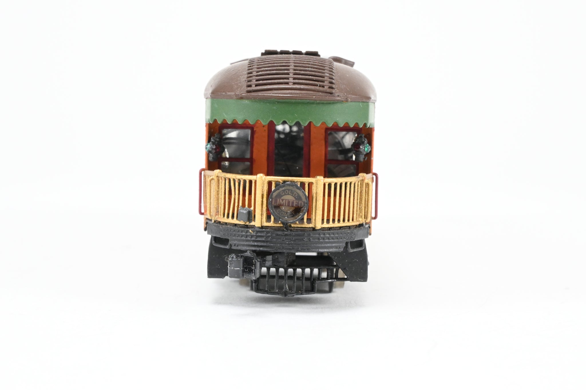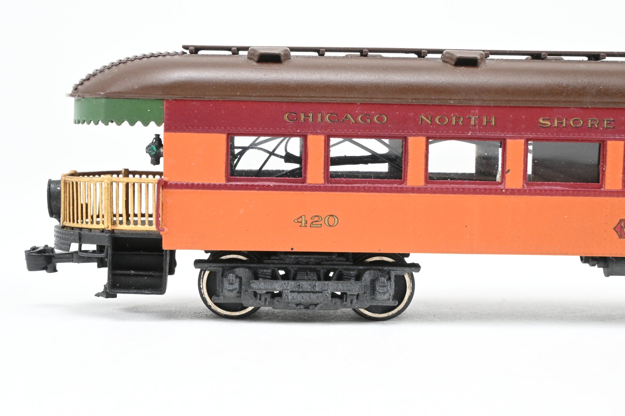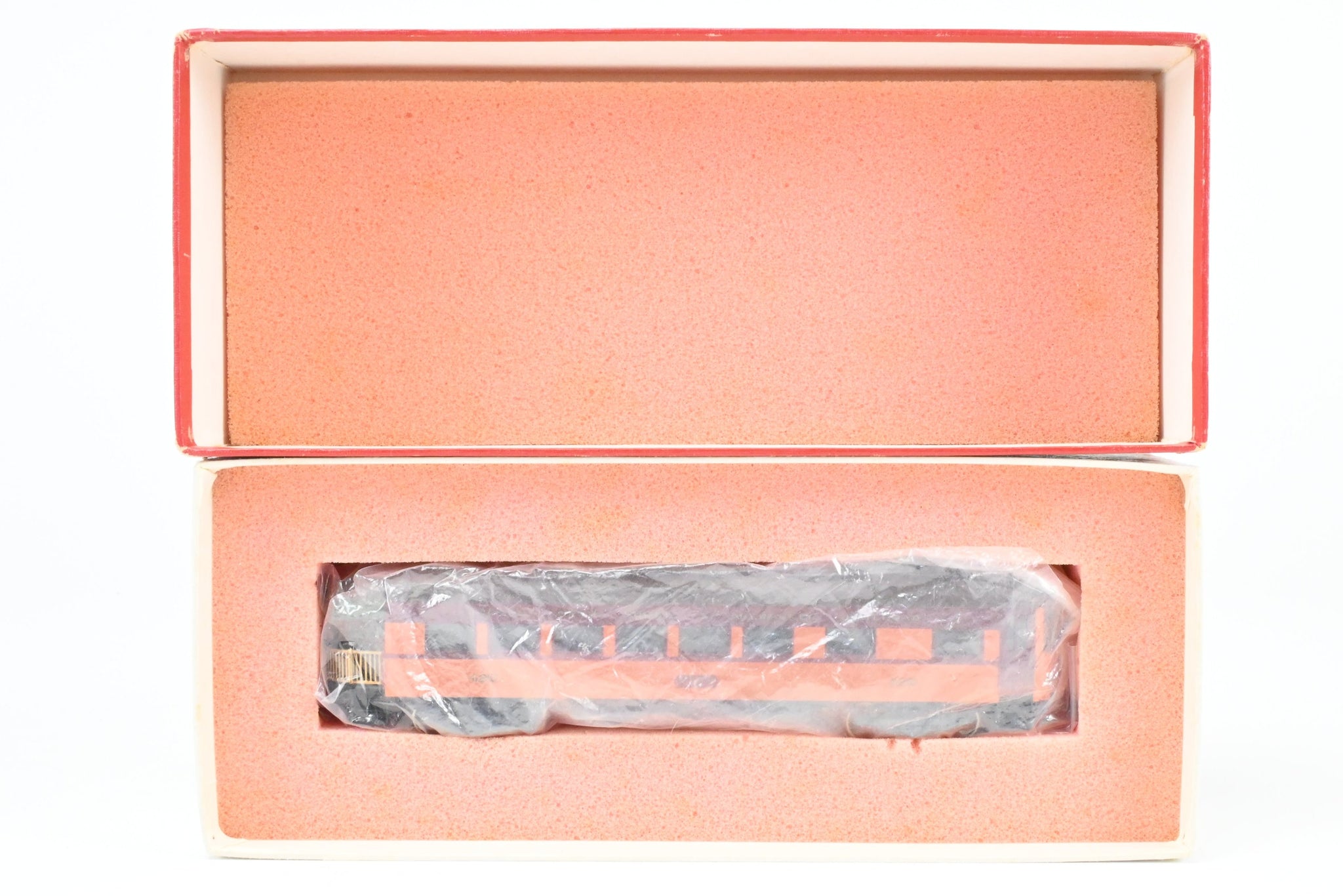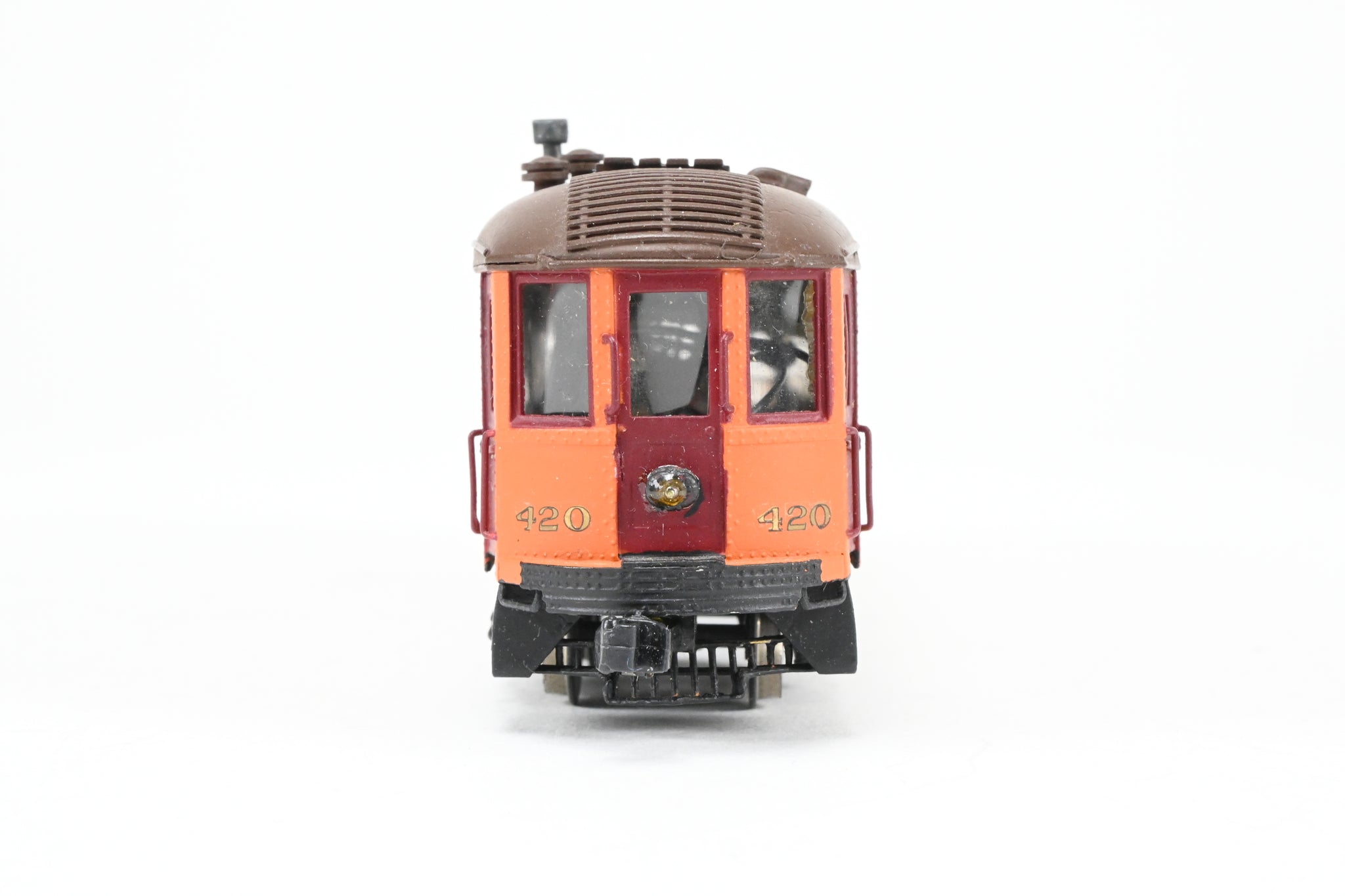 1978 run Midwest Trolley Museum imported model built by Kumata in Japan. Original box shows minimal shelf wear. Model is nicely painted in North Shore's attractive Orange/Maroon paint scheme. NOTE: Model has working marker lights. Glazing installed. Does not includes spare parts. Unpowered trailer just as built for the prototype.