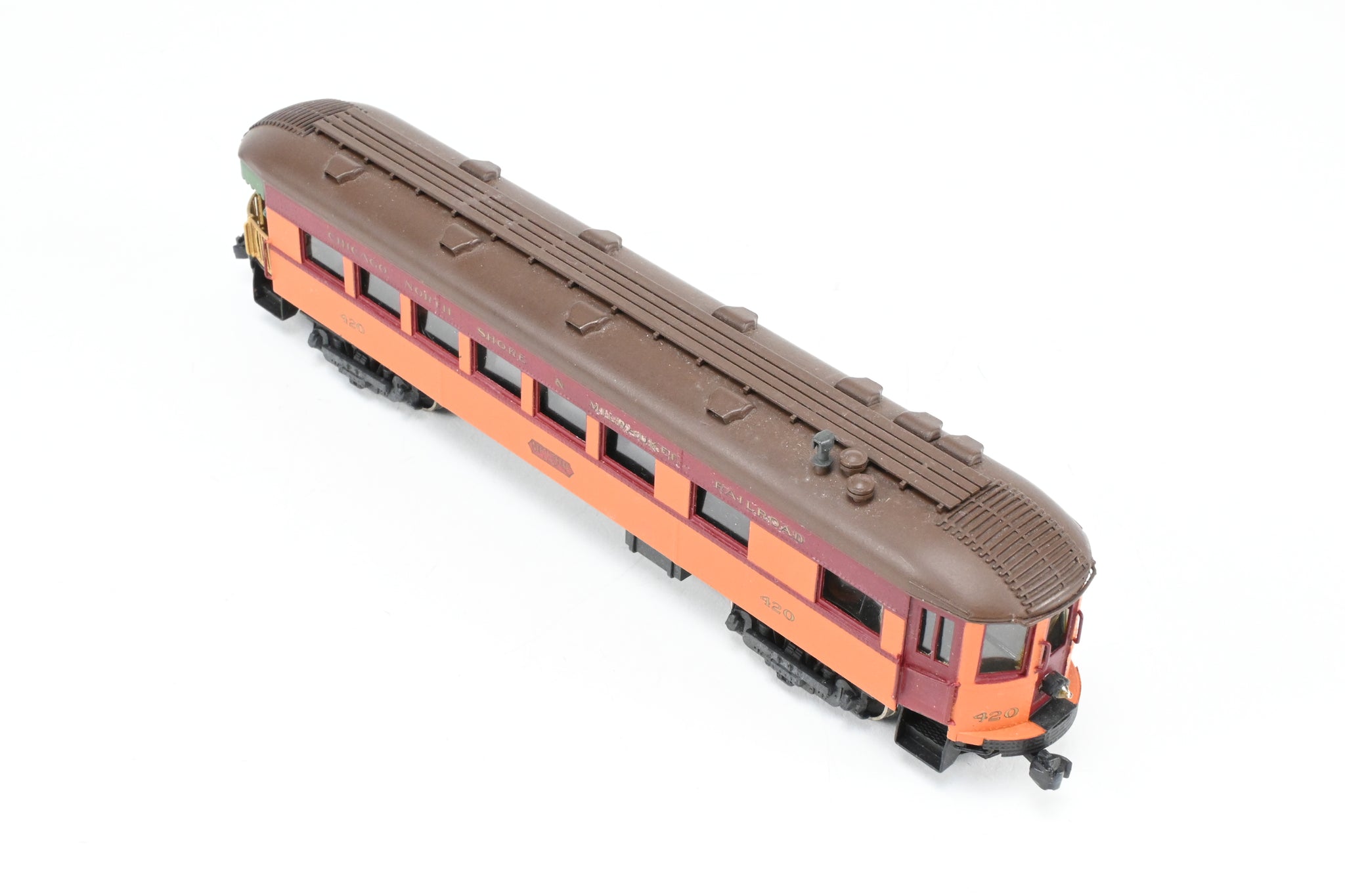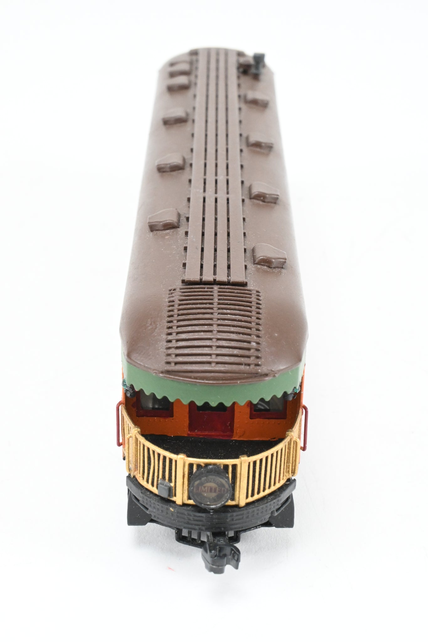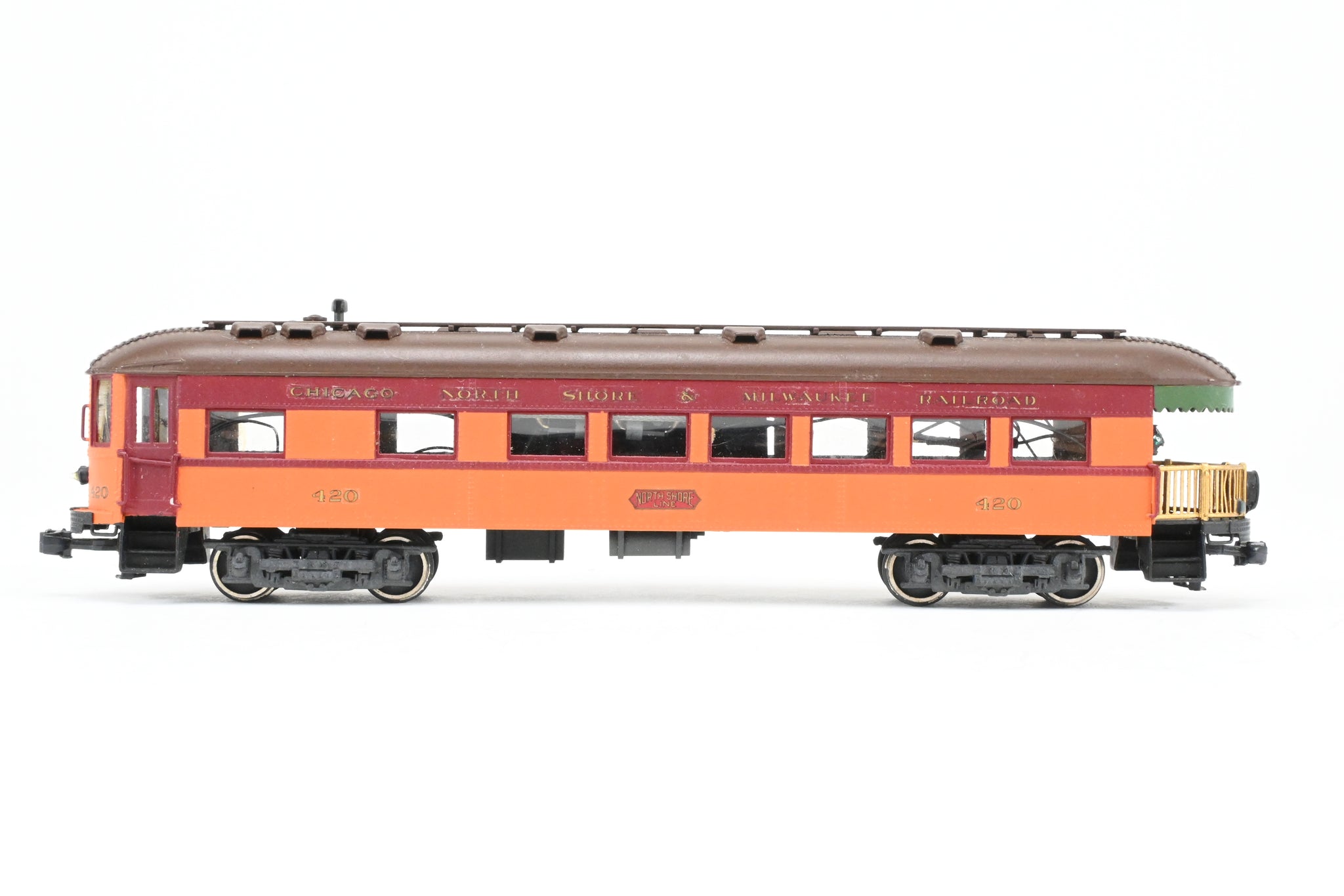 1978 run Midwest Trolley Museum imported model built by Kumata in Japan. Original box shows minimal shelf wear. Model is nicely painted in North Shore's attractive Orange/Maroon paint scheme. NOTE: Model has working marker lights. Glazing installed. Does not includes spare parts. Unpowered trailer just as built for the prototype.