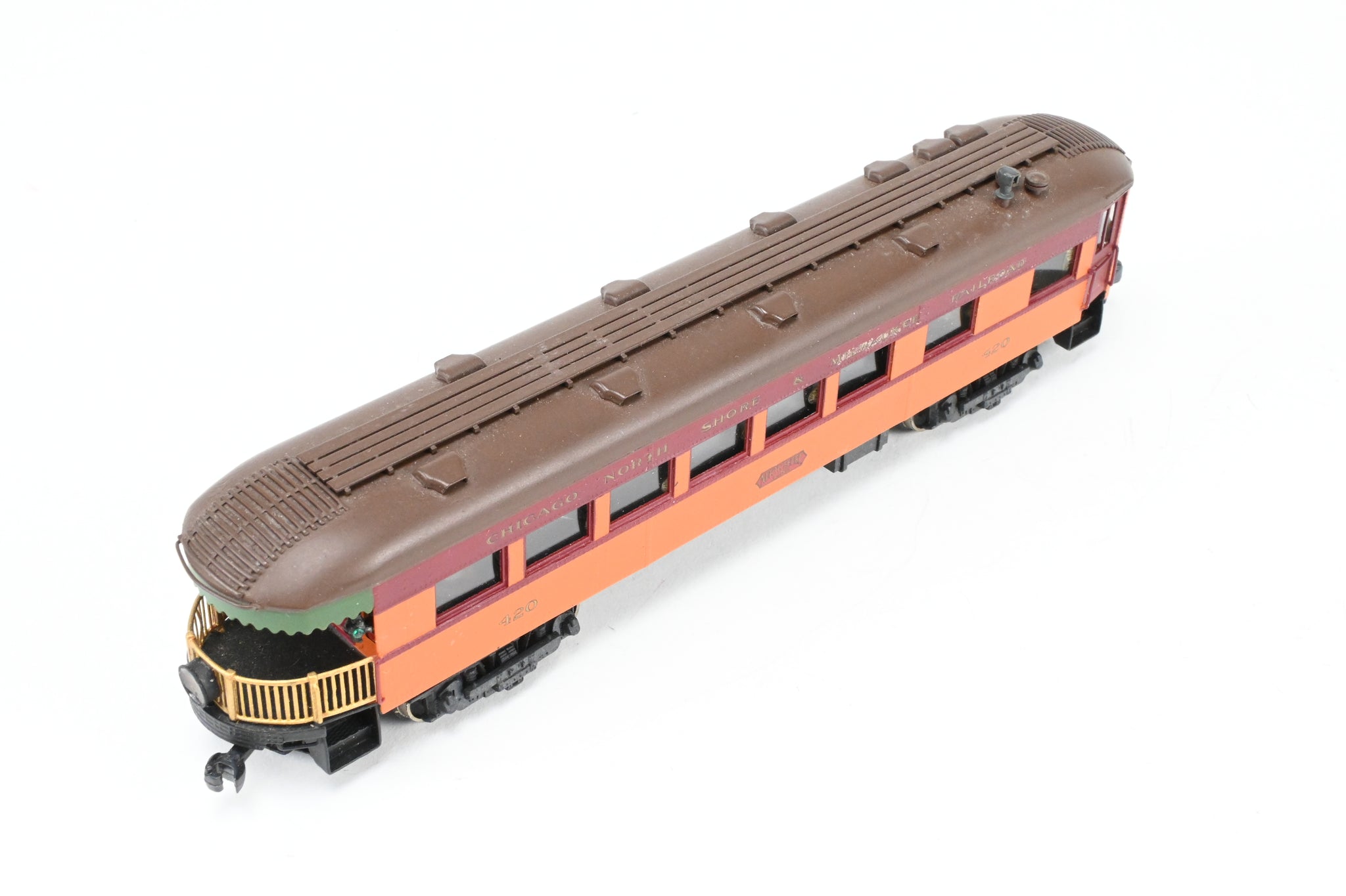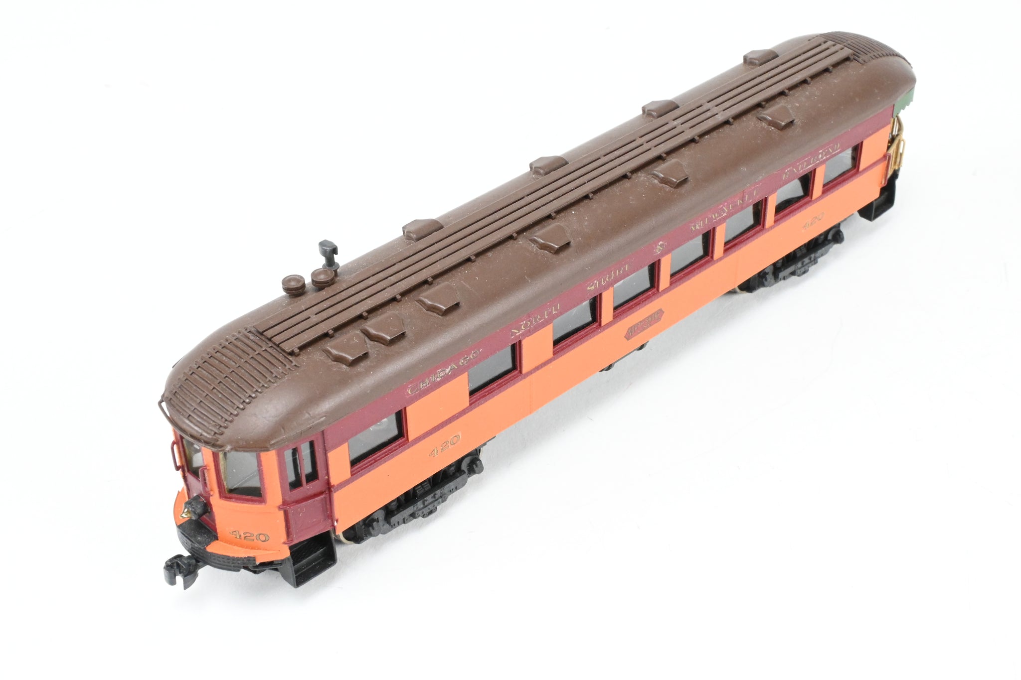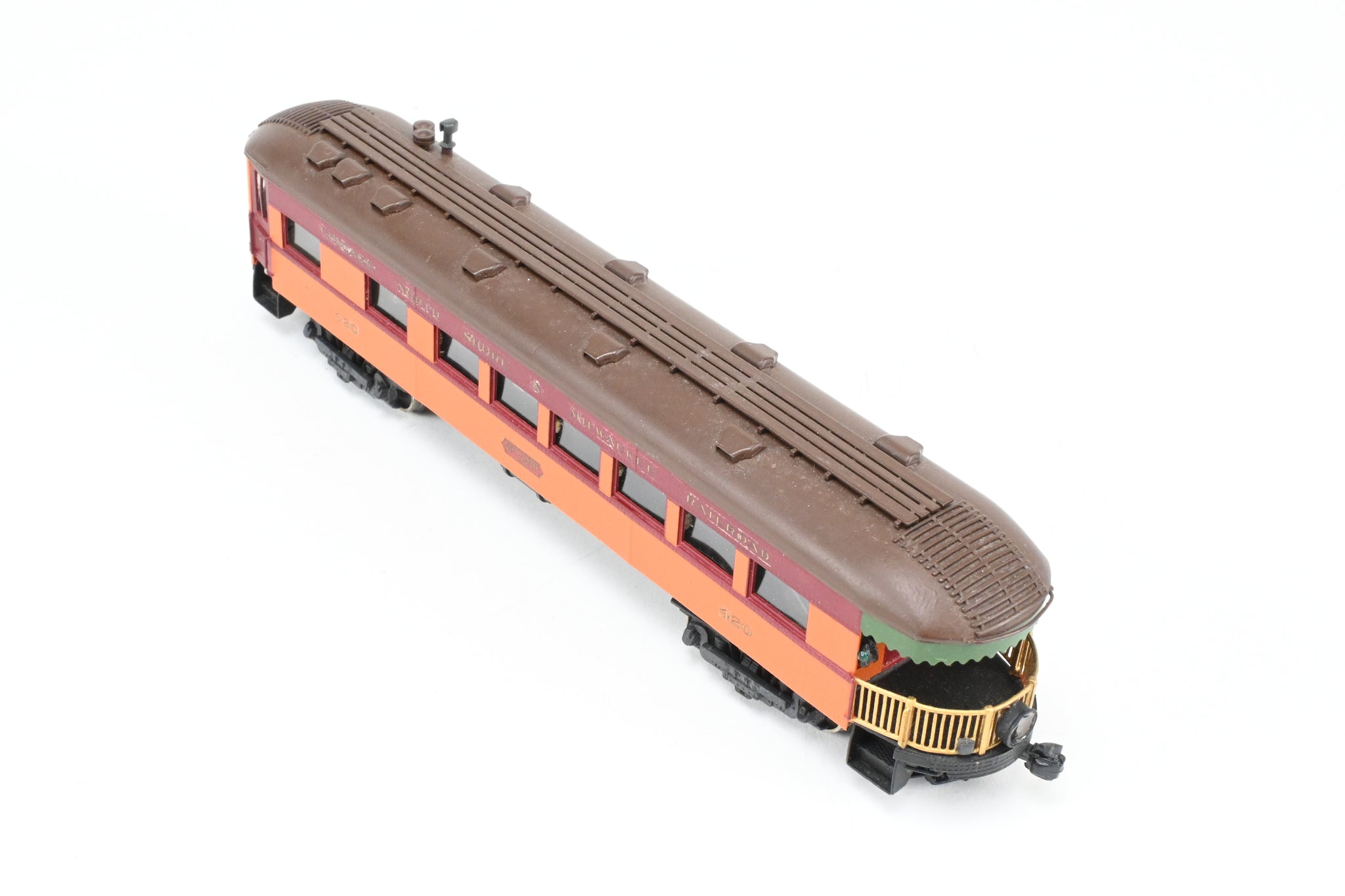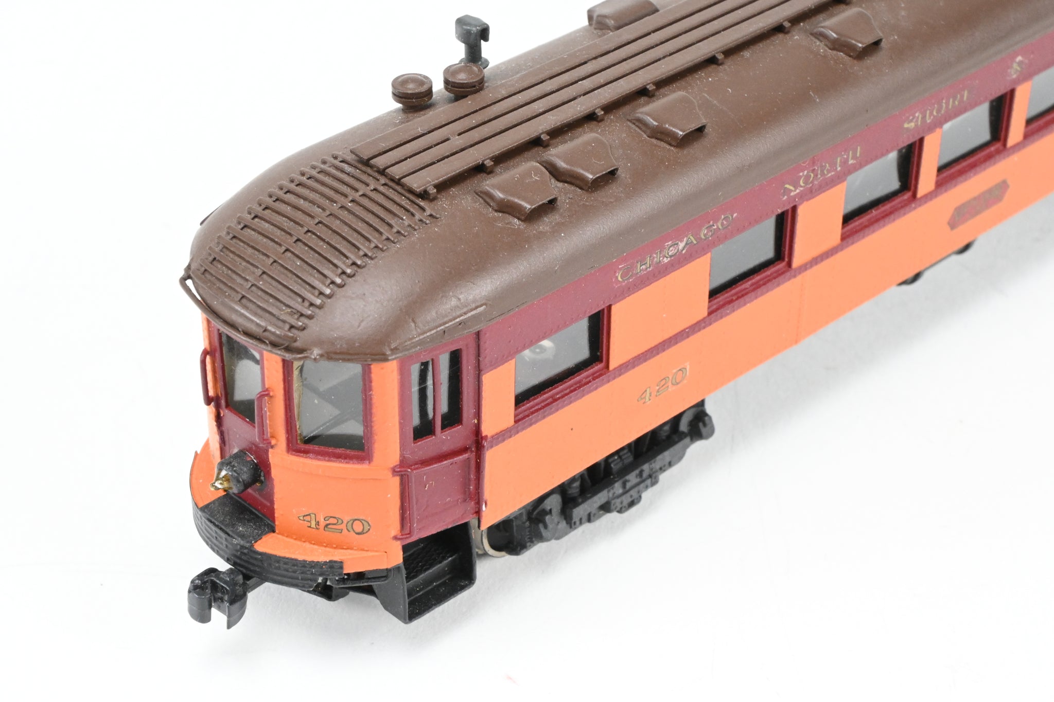 1978 run Midwest Trolley Museum imported model built by Kumata in Japan. Original box shows minimal shelf wear. Model is nicely painted in North Shore's attractive Orange/Maroon paint scheme. NOTE: Model has working marker lights. Glazing installed. Does not includes spare parts. Unpowered trailer just as built for the prototype.