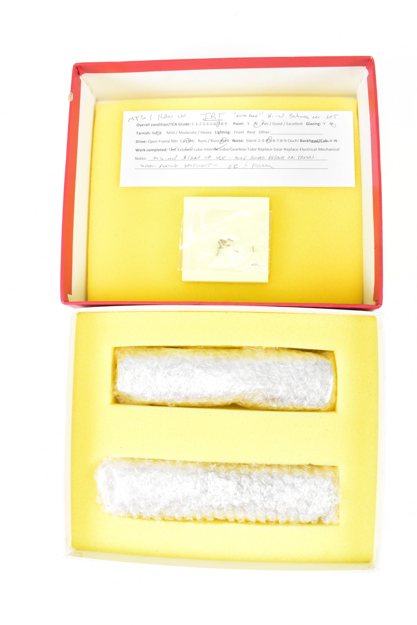 1989 run MTS Imports models built by Han In in Korea. Box shows minimal shelf wear. Spare parts included. One powered car and one unpowered trailer. Center door version, this set represent cars in the 2650 through 2699 series. A smooth running, reasonably quiet two-car set that is ready for the "straphangers" on your railroad and shows minimal signs of use. Note: Some solder repair on trucks - see photos.