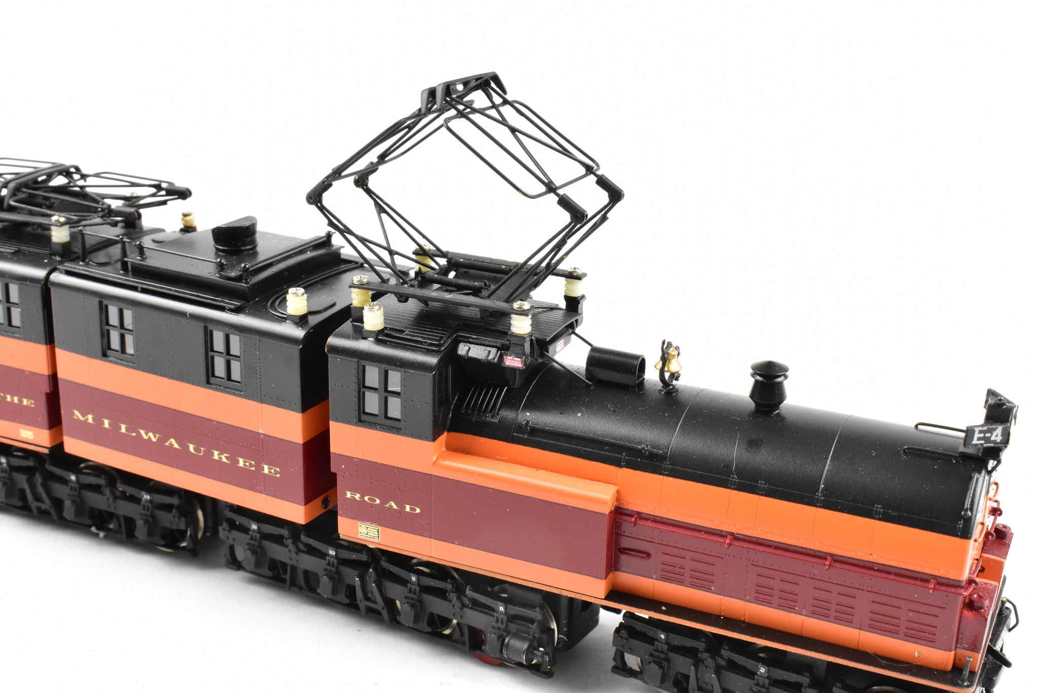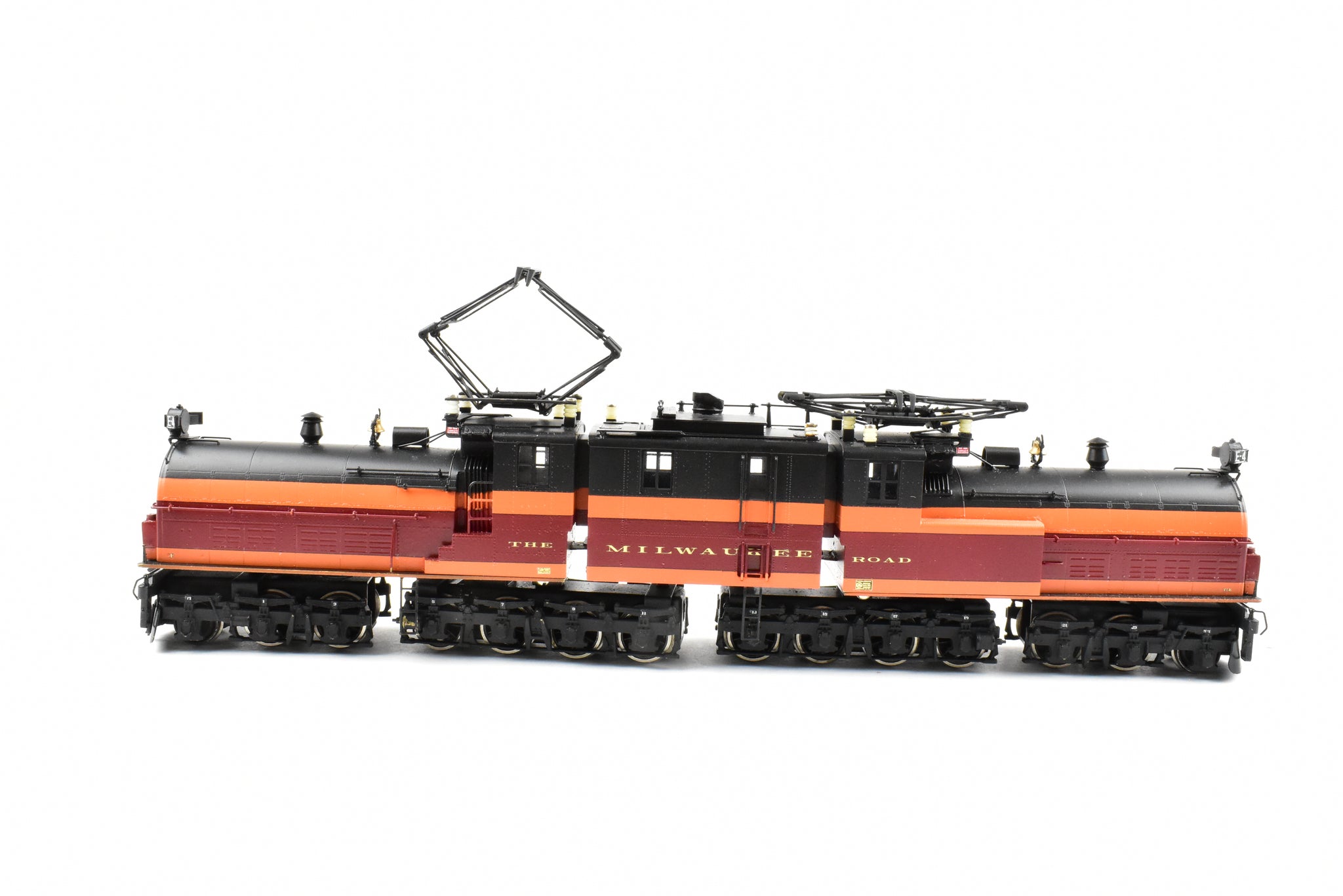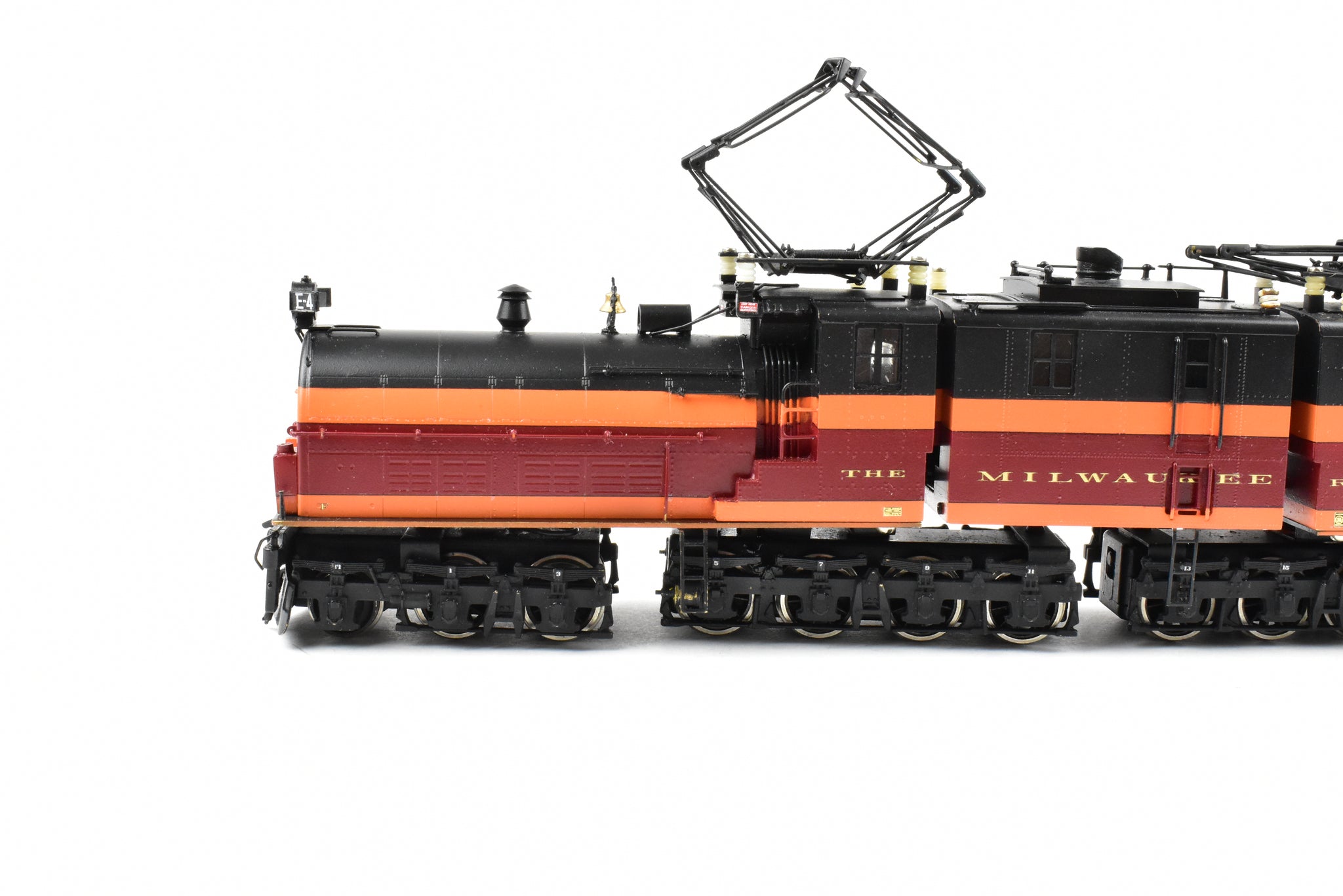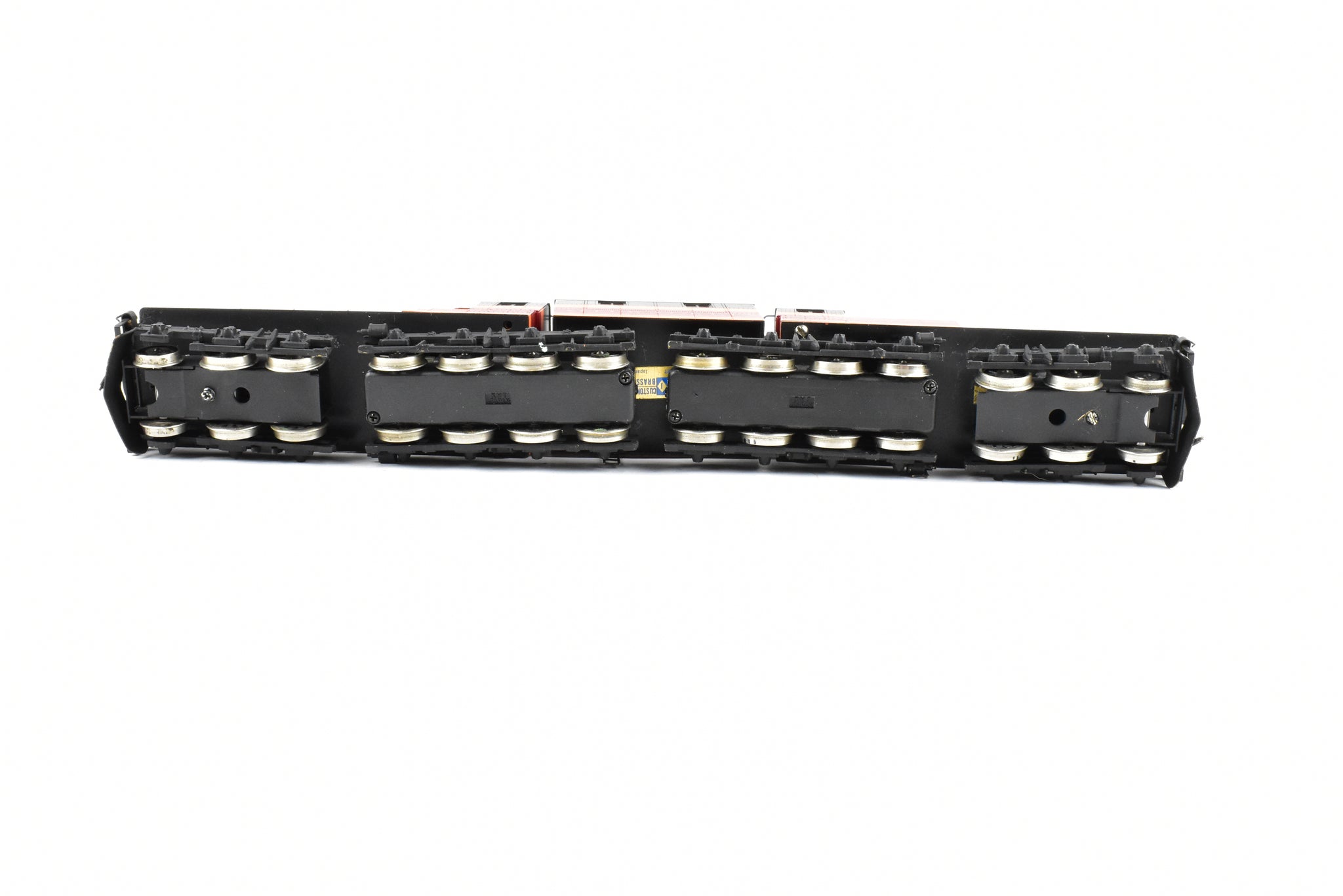 1973 run NJ Custom Brass imported model built by Kumata in Japan. Box shows minimal shelf wear. Spare parts included. Beautiful Pro-Paint work. Glazing, proper sized number boards on the headlights, and MV lenses have been added. Note: Model runs, but does not track well. In addition, one pantograph does not stay latched in the down position.