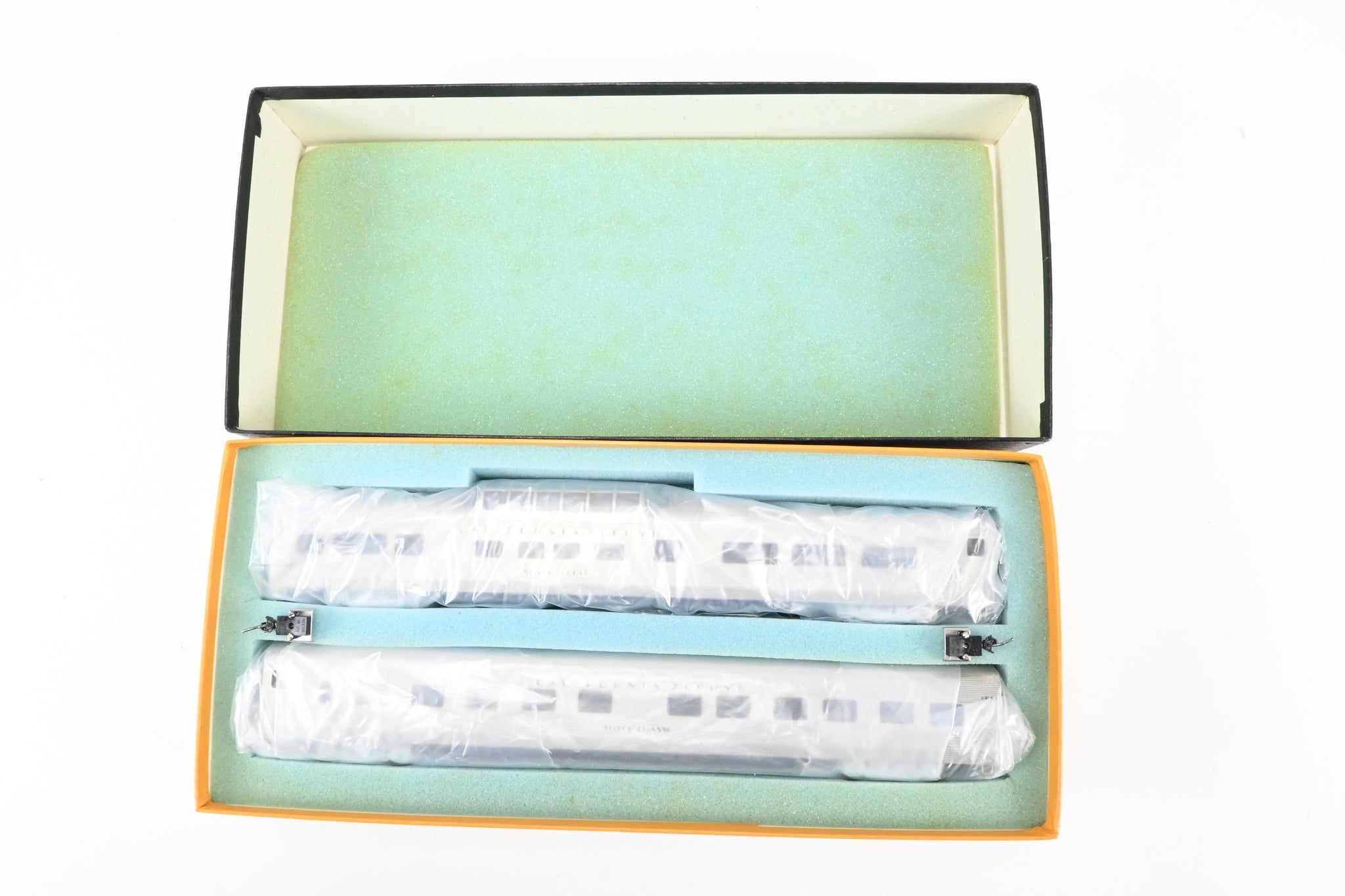 1988 run built by Kumata in Japan. Box shows minimal shelf wear. No spare parts are included. Set includes a Dome Coach and a 10 Roomette 6 Bedroom Sleeping Car. Cars have been decaled and have window glazing installed. Plating shows minor wear - see photos. NOTE: Coupler mounts for the dome coach are broken off but are in the box (see photos).