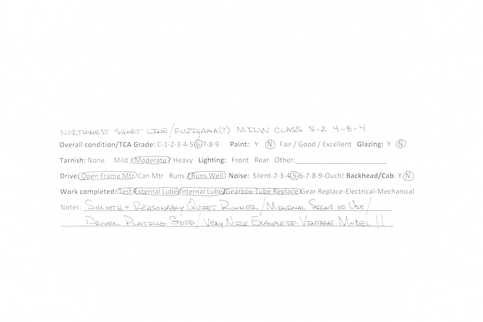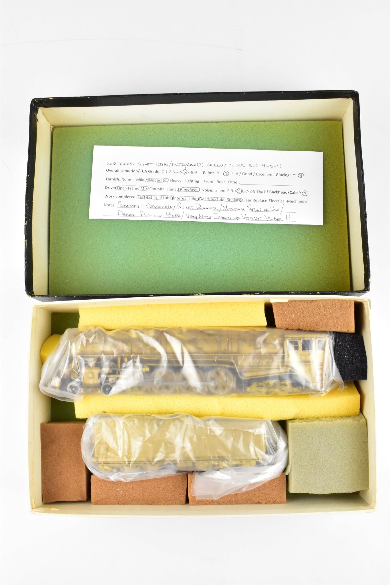 1967 run Northwest Short Line imported model built by Fujiyama in Japan. Box shows moderate shelf wear. Center foam insert has been replaced by block foam. No spare parts. Model has been thoroughly tested, serviced, and lubed.