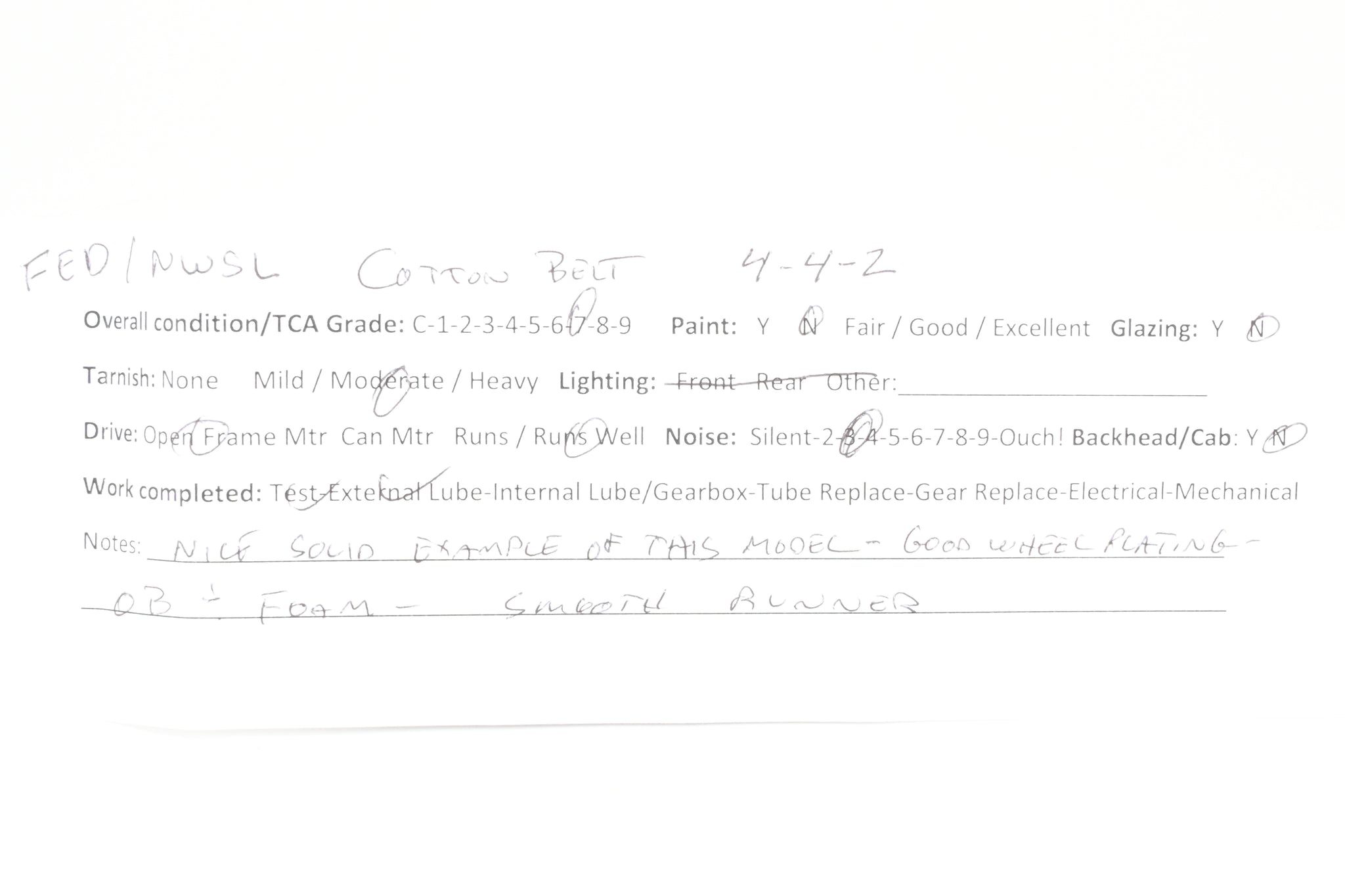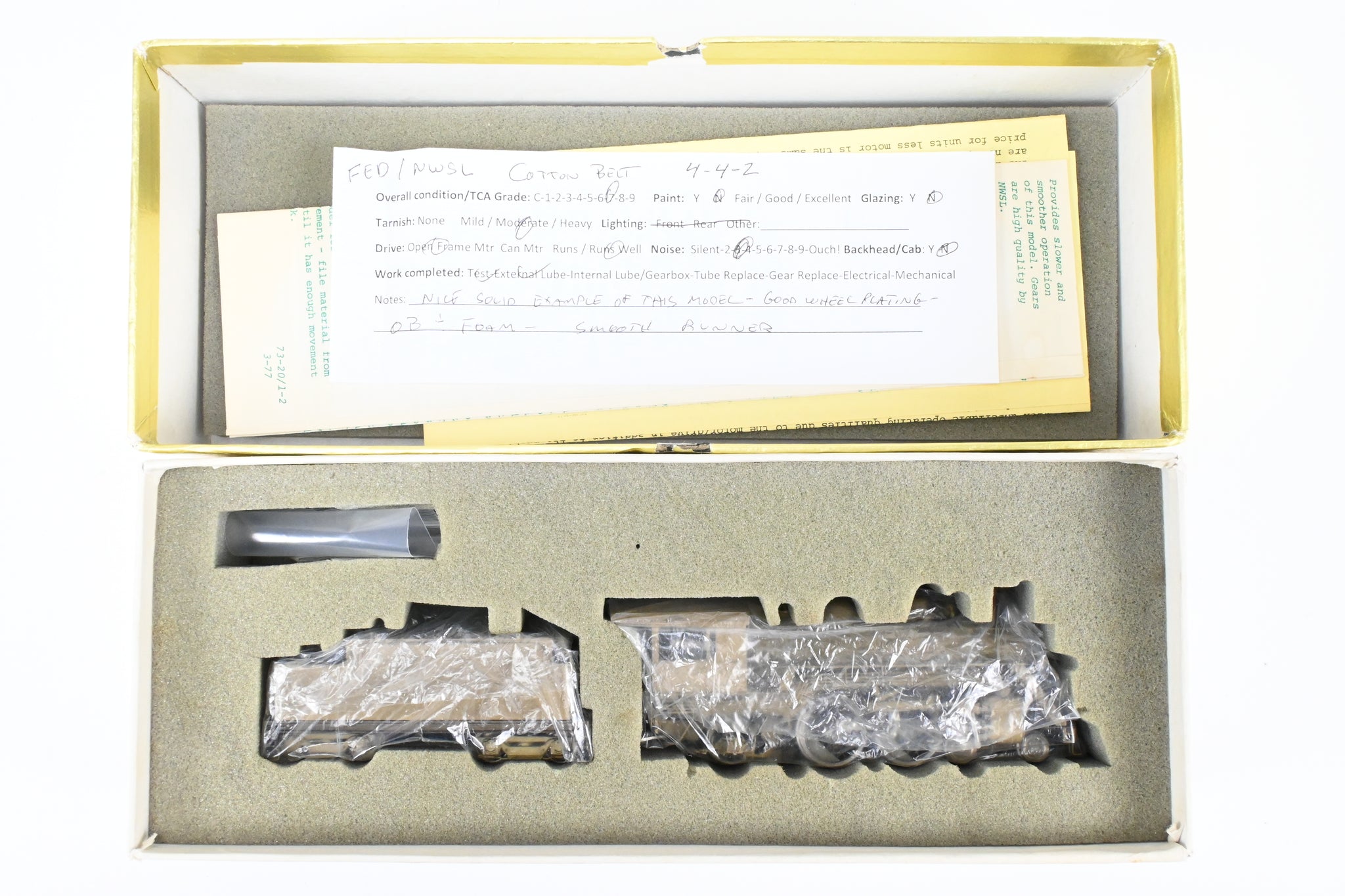 1977 Northwest Short Line/Far East Distributors model built in Japan. Box shows moderate shelf wear with the original packing foam. Spare parts and NWSL paperwork included. Cotton belt had obtained six of these E1 4-4-2's in March of 1909 as their engine numbers 600-605. These engines lasted until 1952.