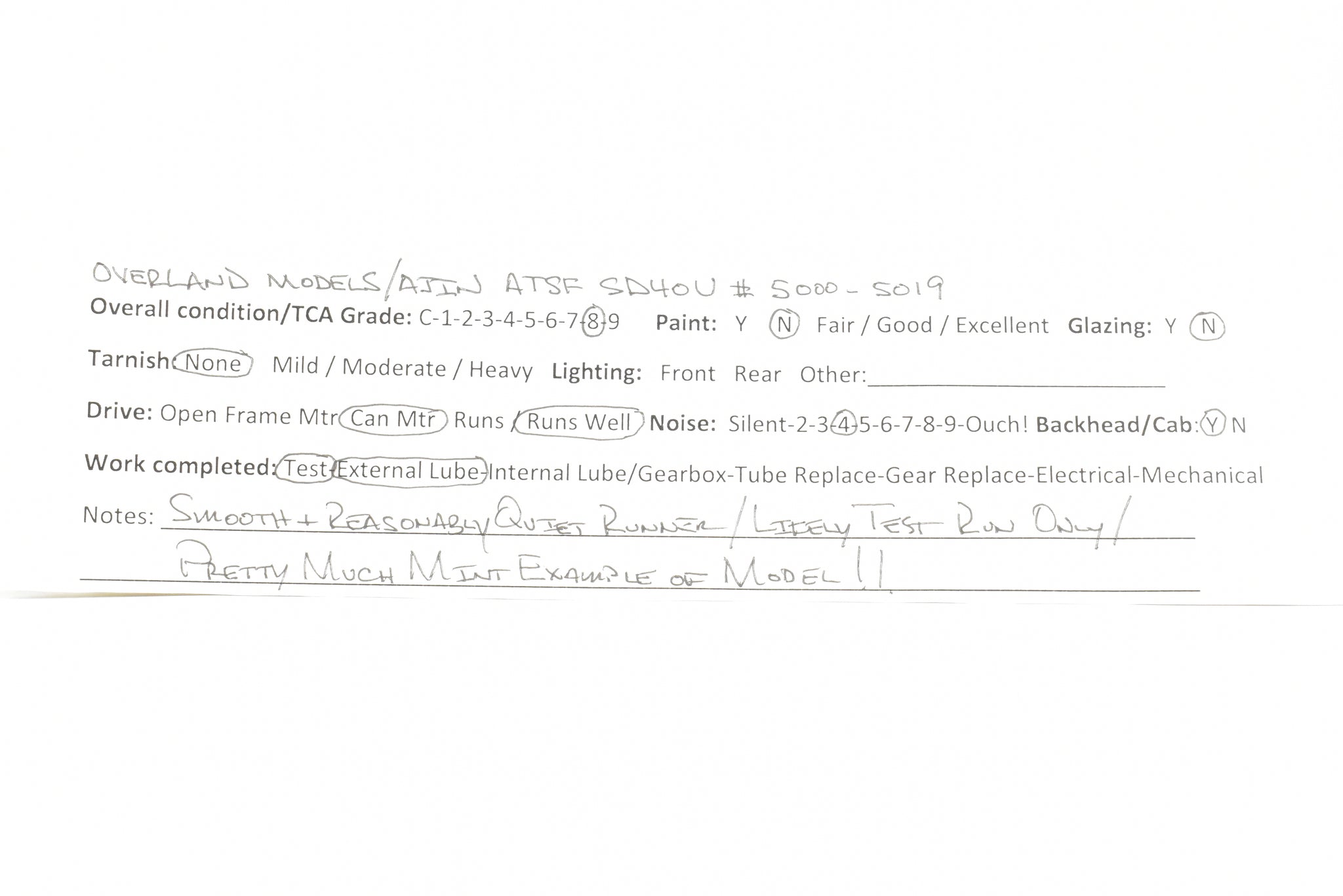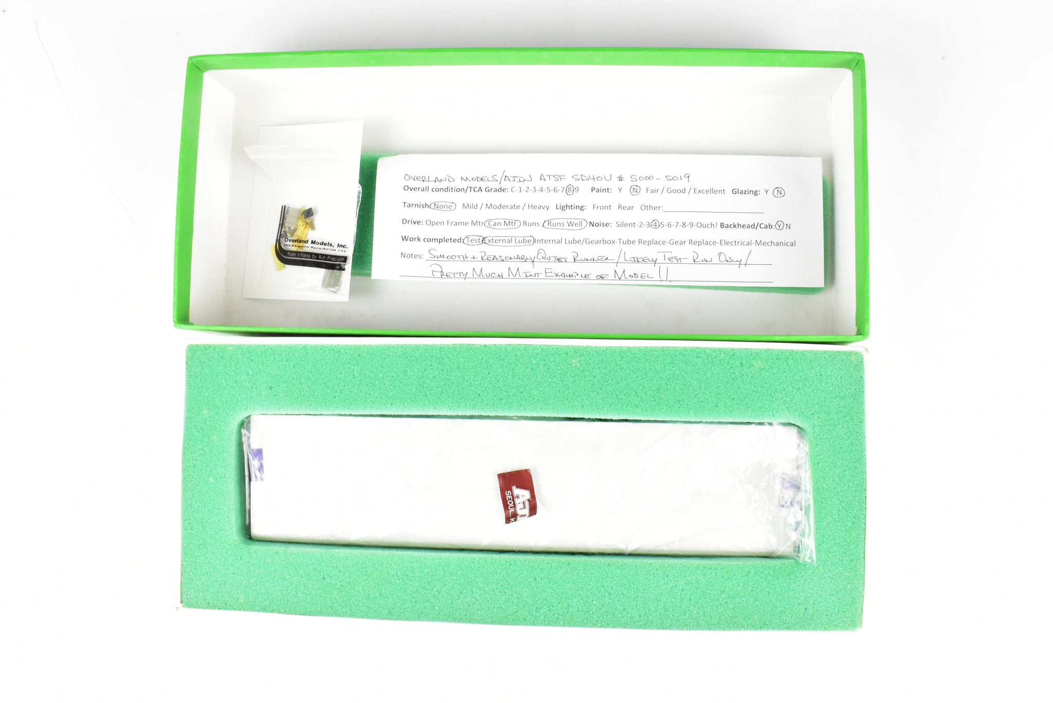1988 run Overland Models, Inc. Imported model built by Ajin Precision Mfg. in Korea. Original box shows minimal shelf wear. Spare parts included. A smooth running, quiet, tower drive model that exhibits little, if any, use.