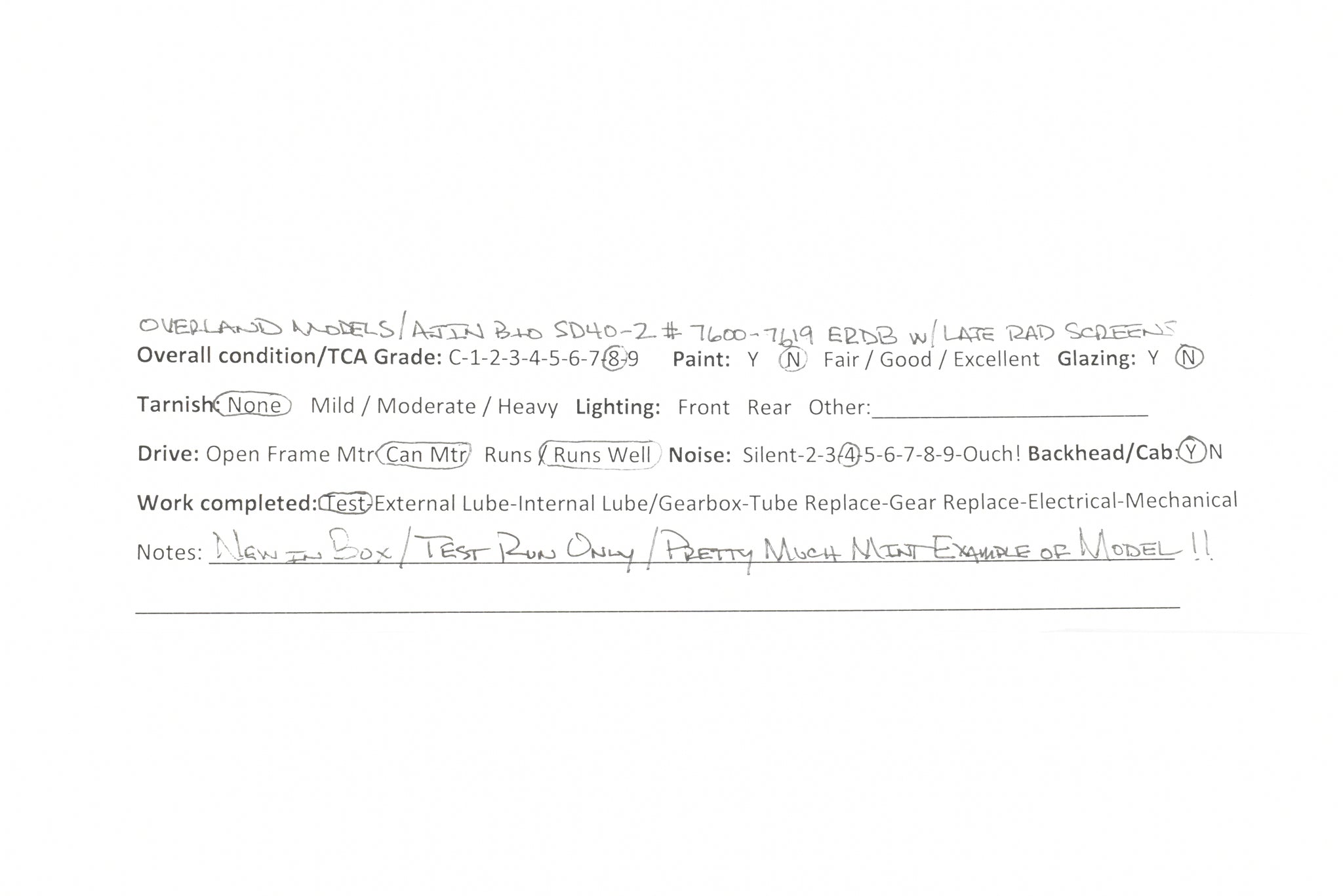 1988 run Overland Models, Inc. Imported model built by Ajin Precision Mfg. in Korea. Original box shows almost no shelf wear. Spare and detail parts included. Represents road numbers 7600 through 7619 w/ Extended Range Dynamic Brakes and Late Radiator Screens. A mint condition model that's a smooth and reasonably quiet runnier with a high degree of detail. It's a rare and harder to find model as only 25 models of this version were imported.