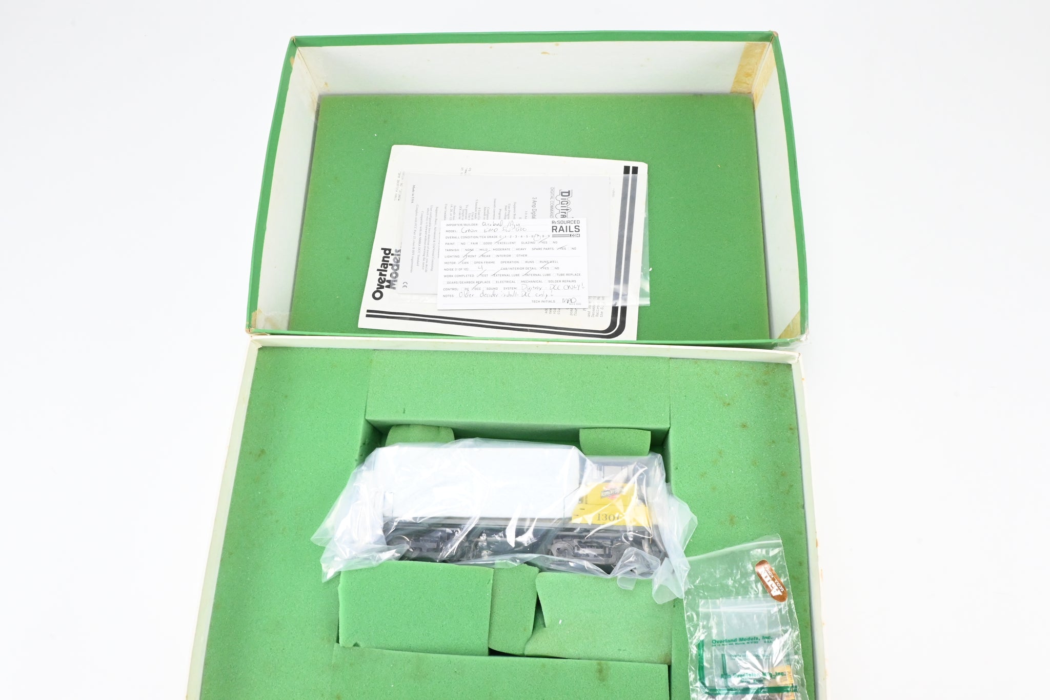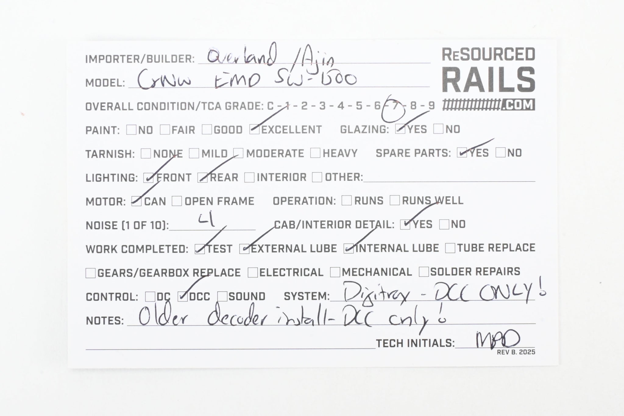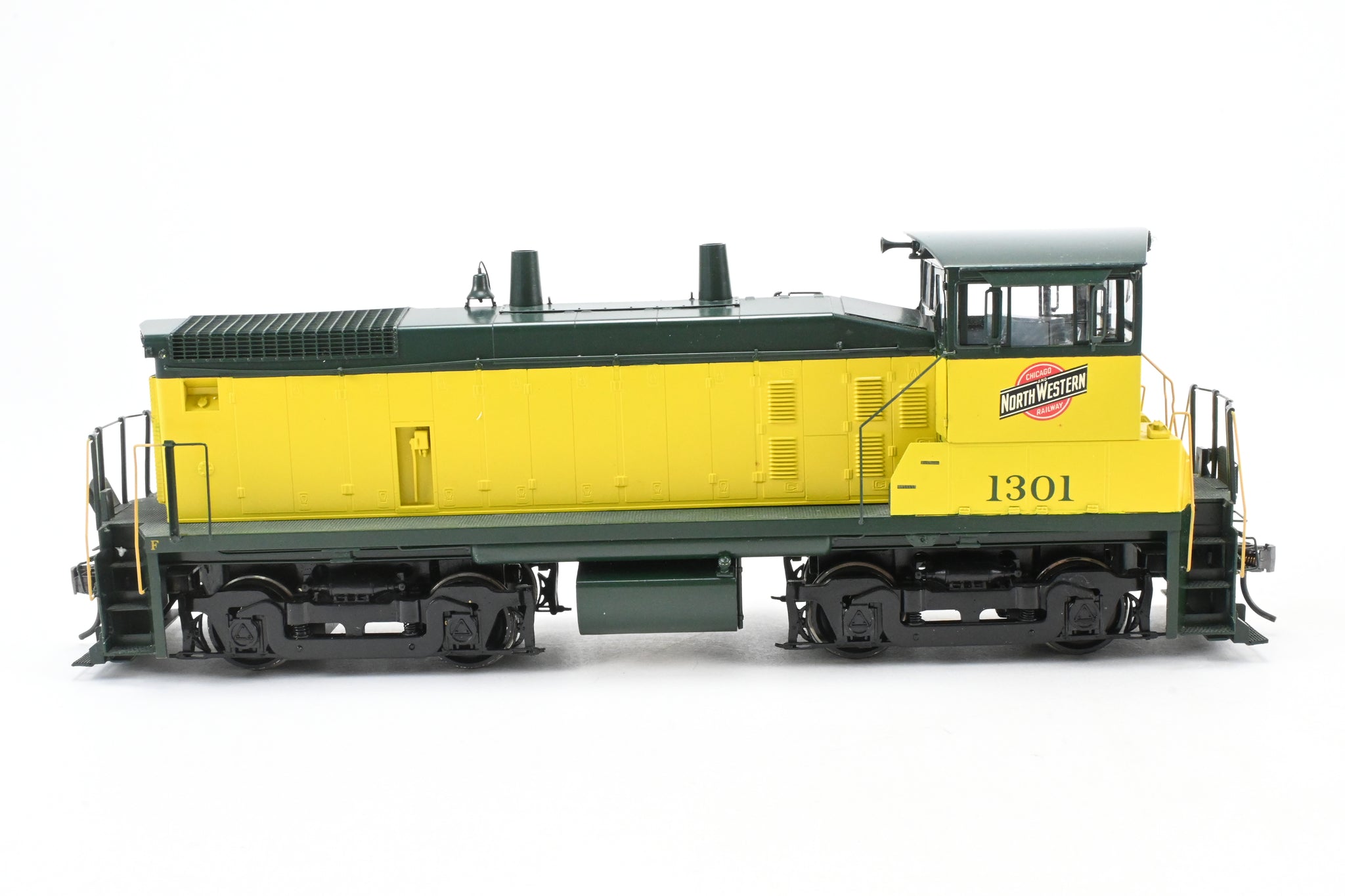 OMI - Overland Models, Inc imported model built by Ajin Precision Mfg. in Korea. Box shows some shelf wear with at least one taped corner. Spare parts included. Represents C&NW's SW1500 #1301. Model has an excellent custom paint job - see photos. A smooth and quiet runner, with minimal signs of use. Very nice! NOTE: Digitrax DCC only! An older Decoder install. RARE! only 30 of these locomotives were produced.