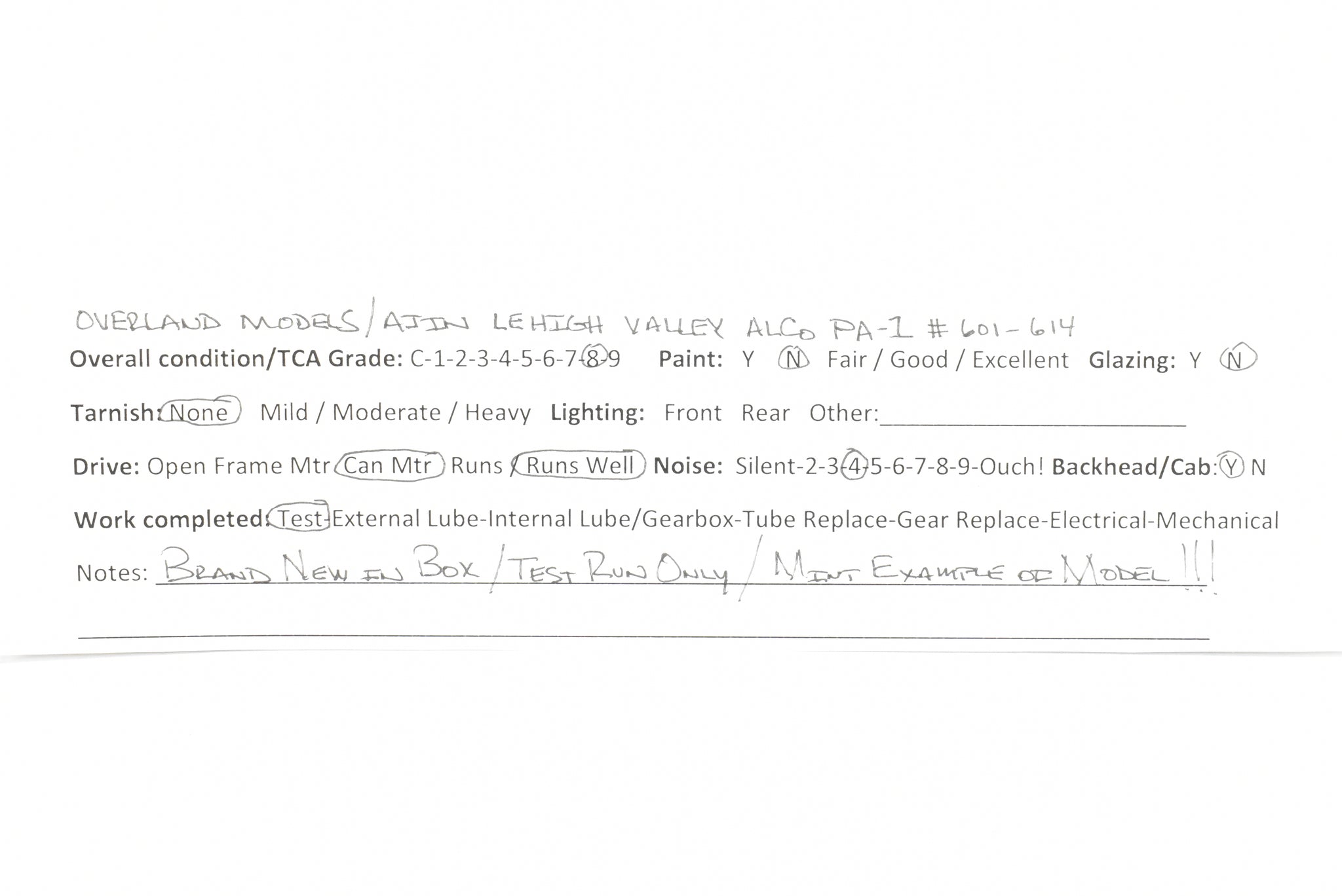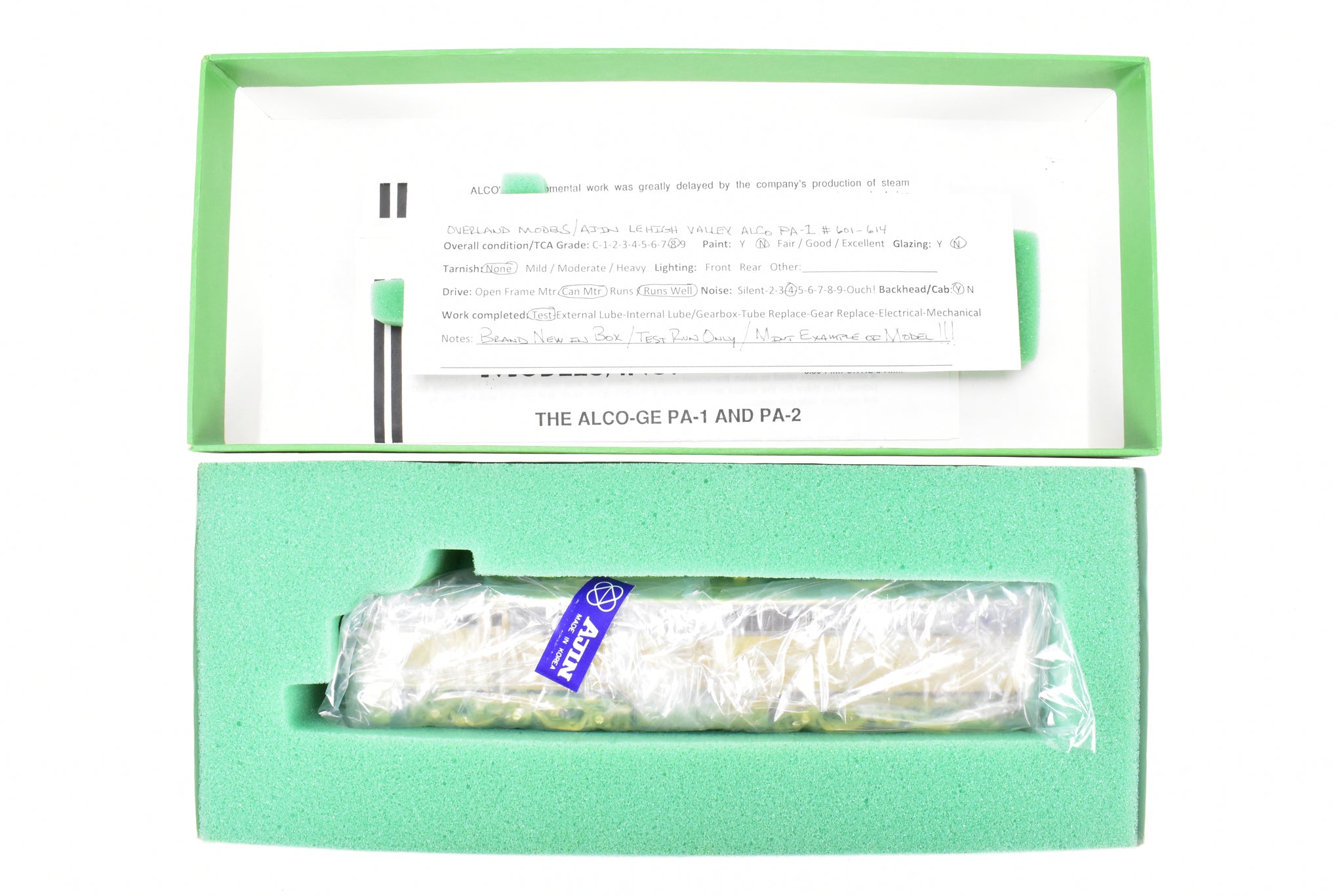 1989 run Overland Models, Inc imported model built by Ajin Precision in Korea. Box has almost no wear. Spare parts included. Only 16 of these models were made. Model is virtually brand new in box. Test ran only. These Locomotives were used on Lehigh Valley's Black Diamond and John Wilkes passenger trains until 1962 when all Lehigh Valley passenger service was discontinued.