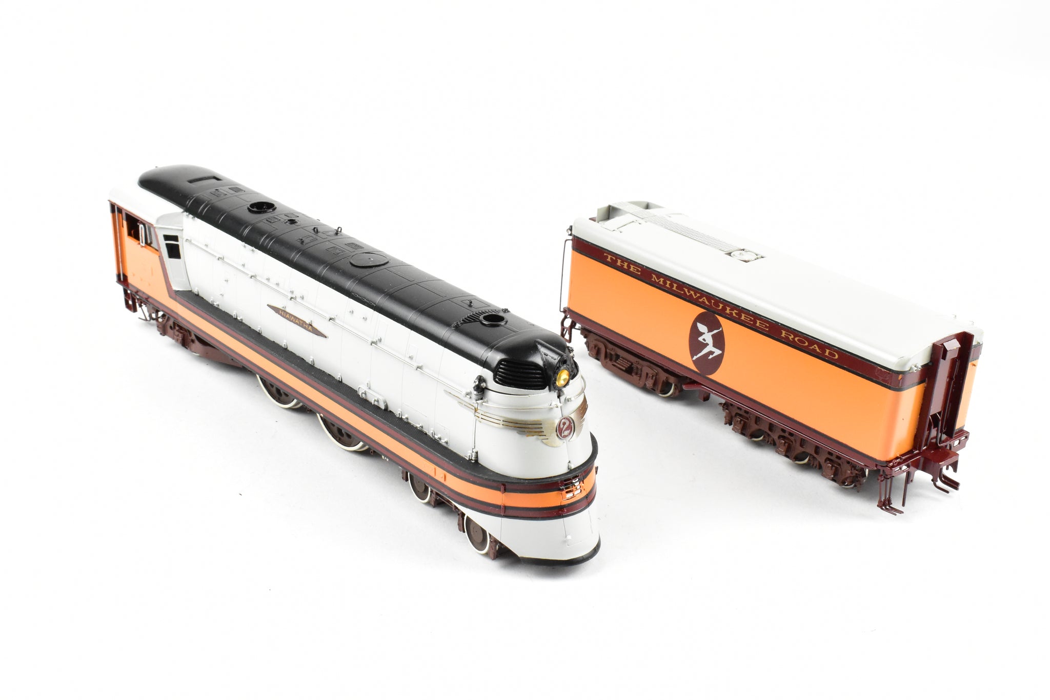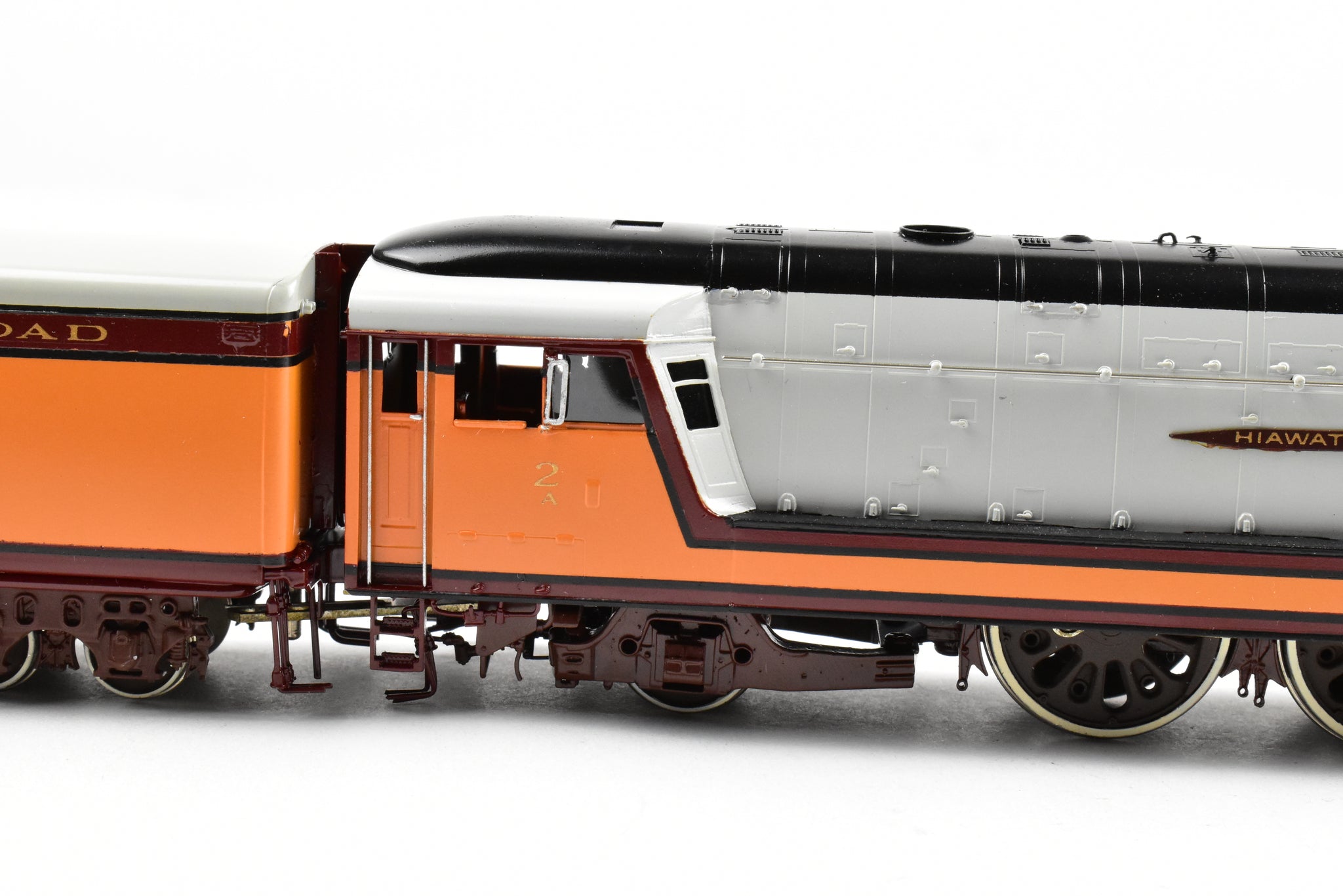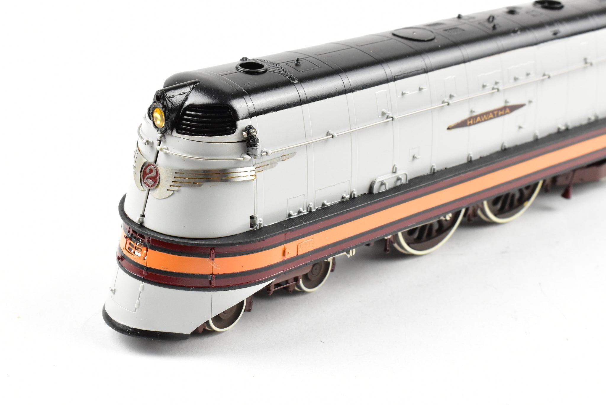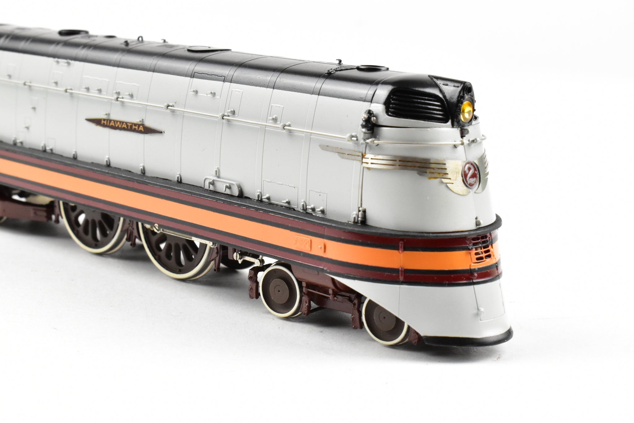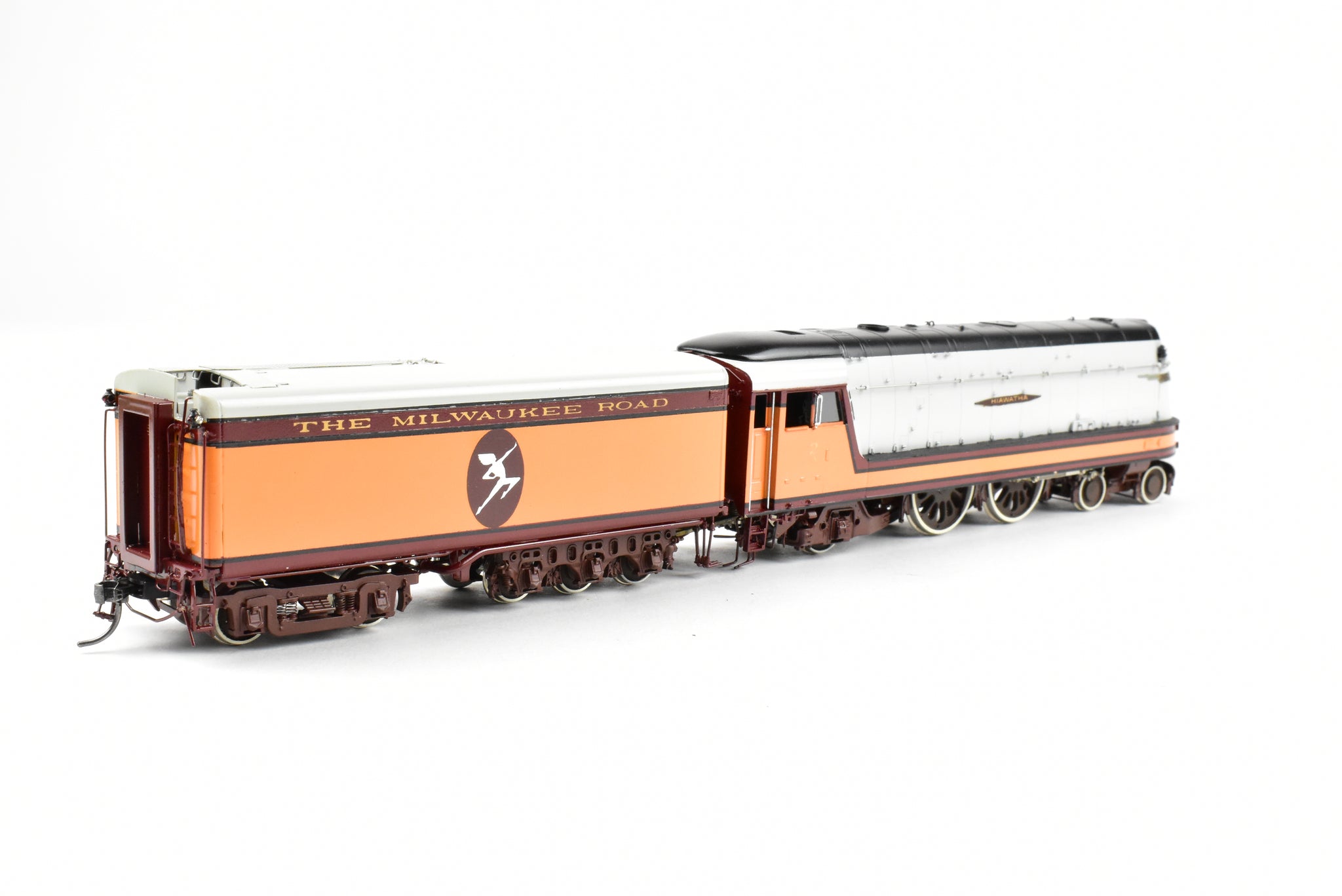 1990 run Overland Models, Inc. imported model built by Ajin Precision in Korea. Box shows almost no shelf wear. Spare parts and side rod wrench included. Modernized "Hiawatha" version. Divided streamline smokebox door covers swing open revealing detail inside. Opening hatches on rear top of streamlined tender revealing detail underneath. Sound cam on front driver axle. Very nice custom paint job with excellent finish throughout. A smooth and quiet runner that looks as good as it runs.