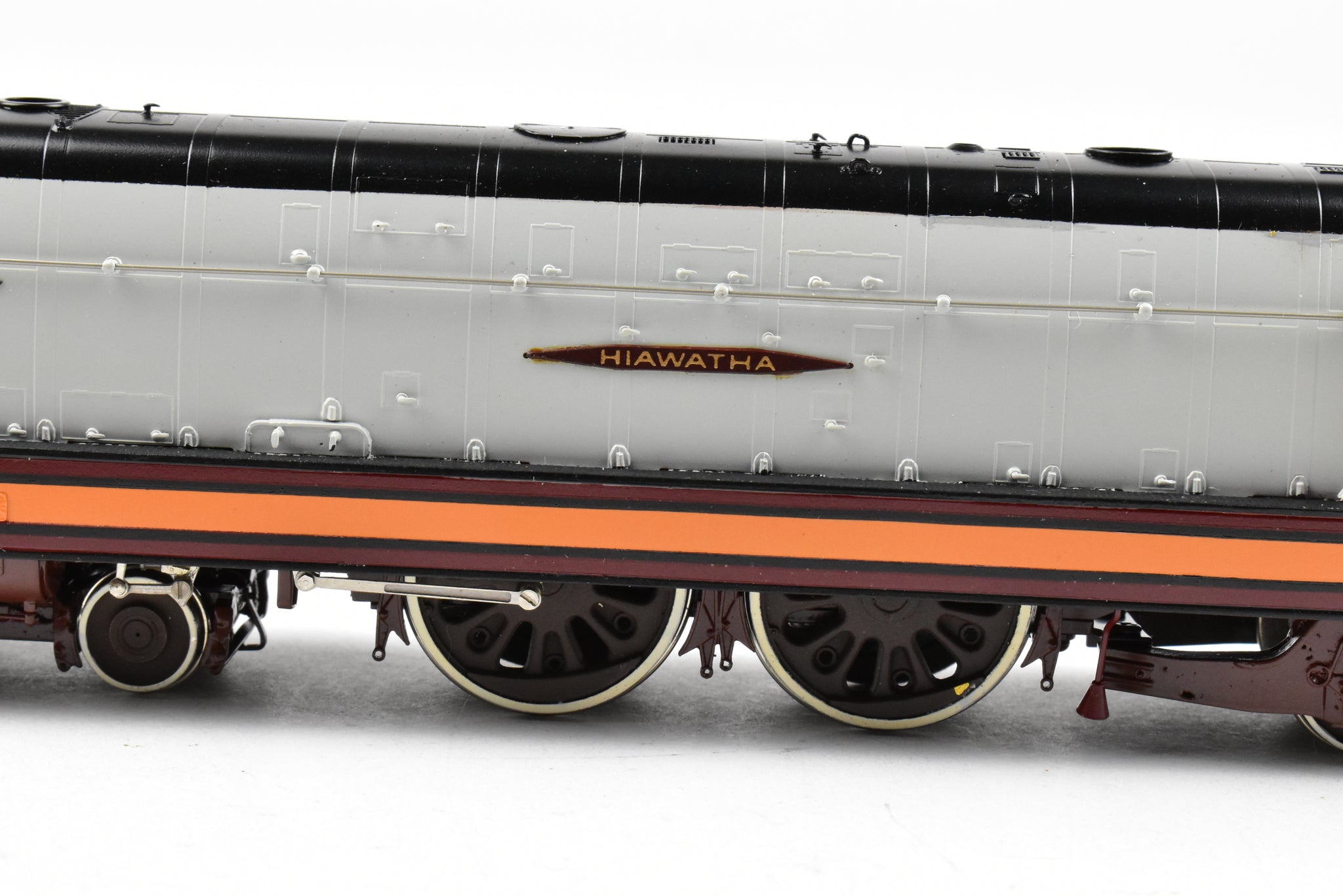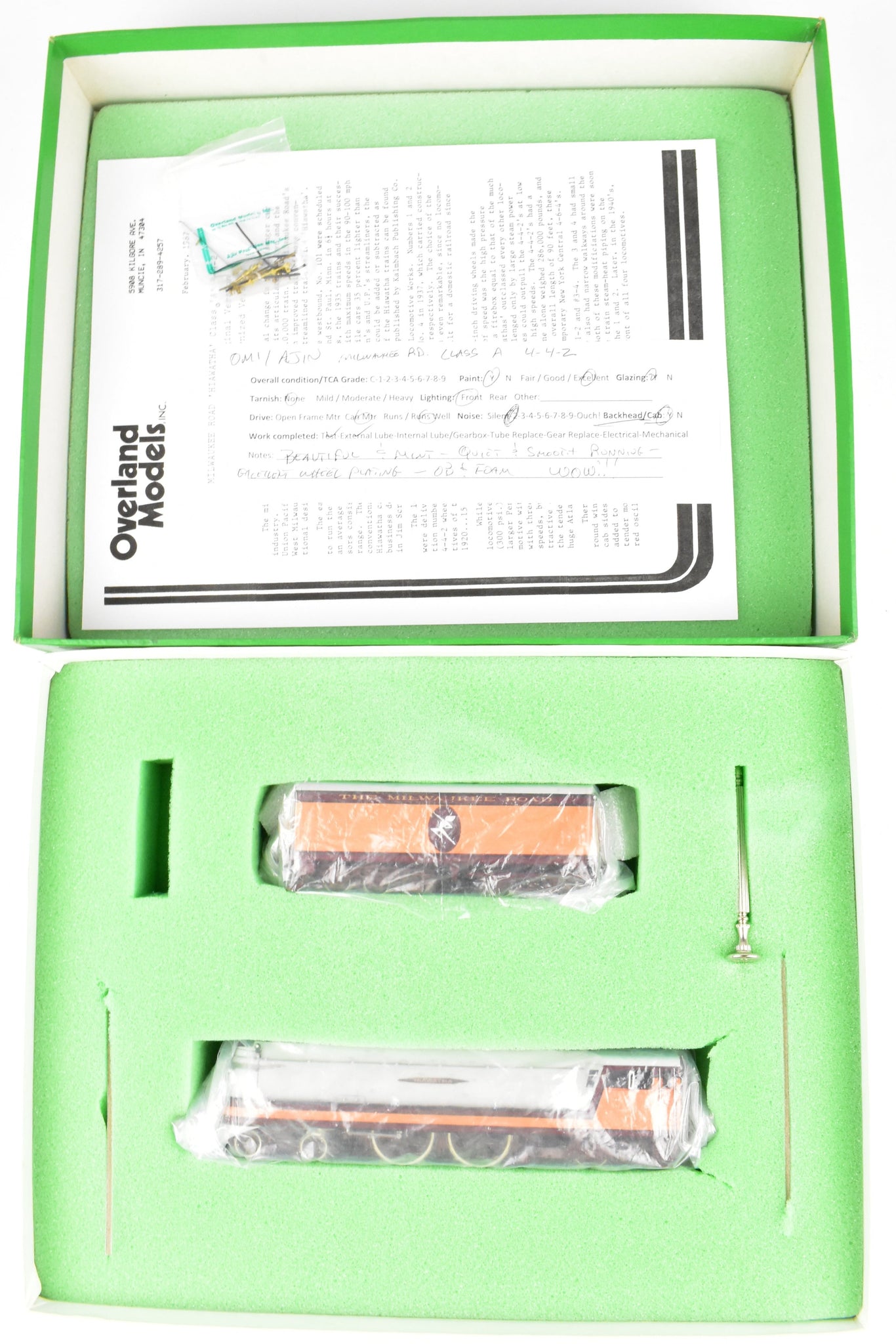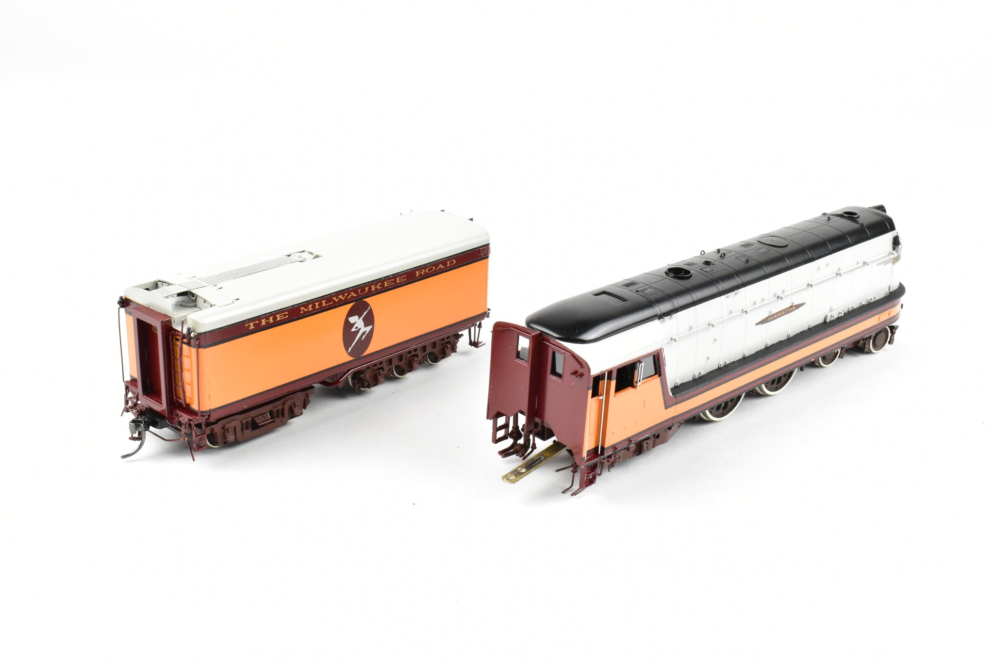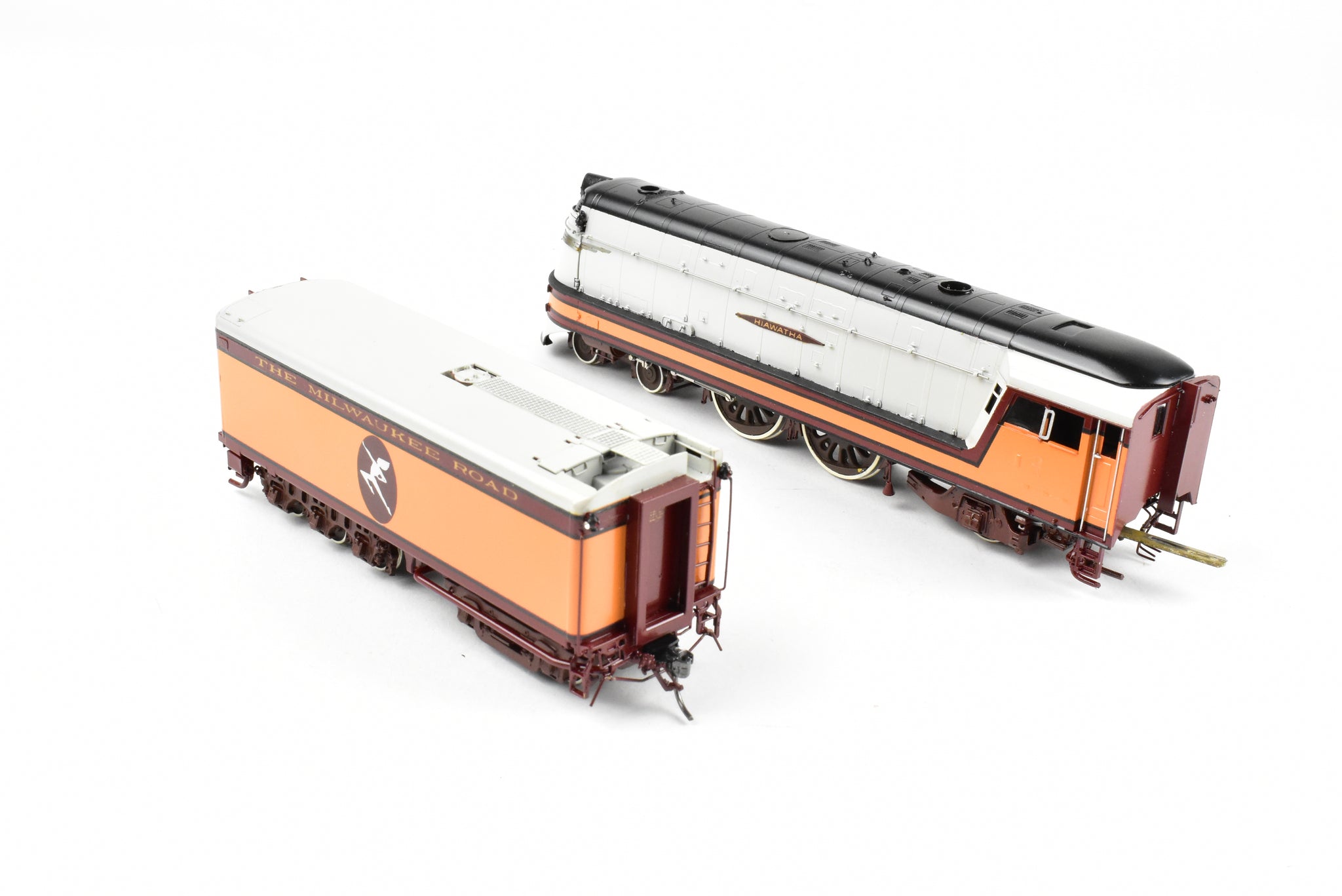 1990 run Overland Models, Inc. imported model built by Ajin Precision in Korea. Box shows almost no shelf wear. Spare parts and side rod wrench included. Modernized "Hiawatha" version. Divided streamline smokebox door covers swing open revealing detail inside. Opening hatches on rear top of streamlined tender revealing detail underneath. Sound cam on front driver axle. Very nice custom paint job with excellent finish throughout. A smooth and quiet runner that looks as good as it runs.