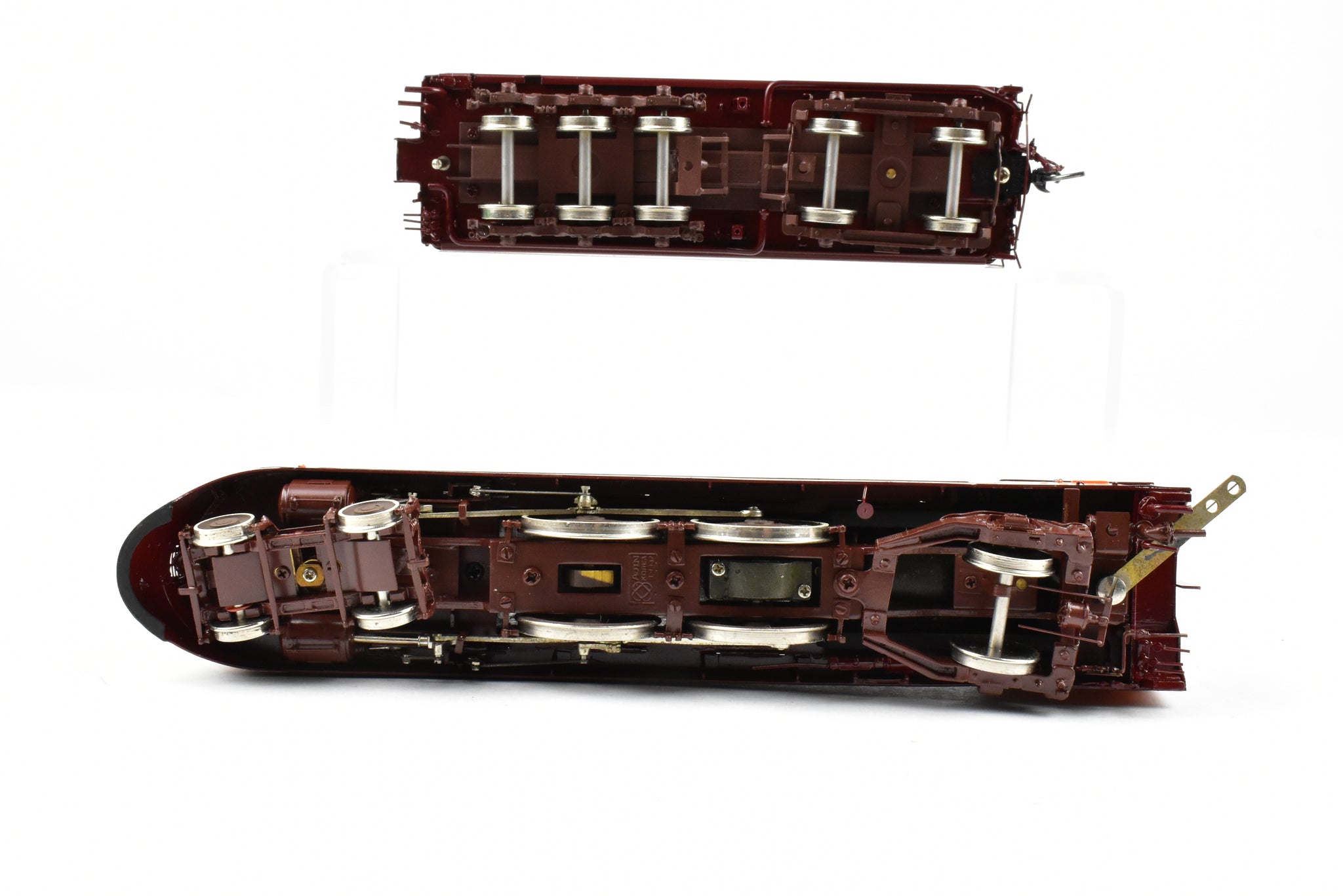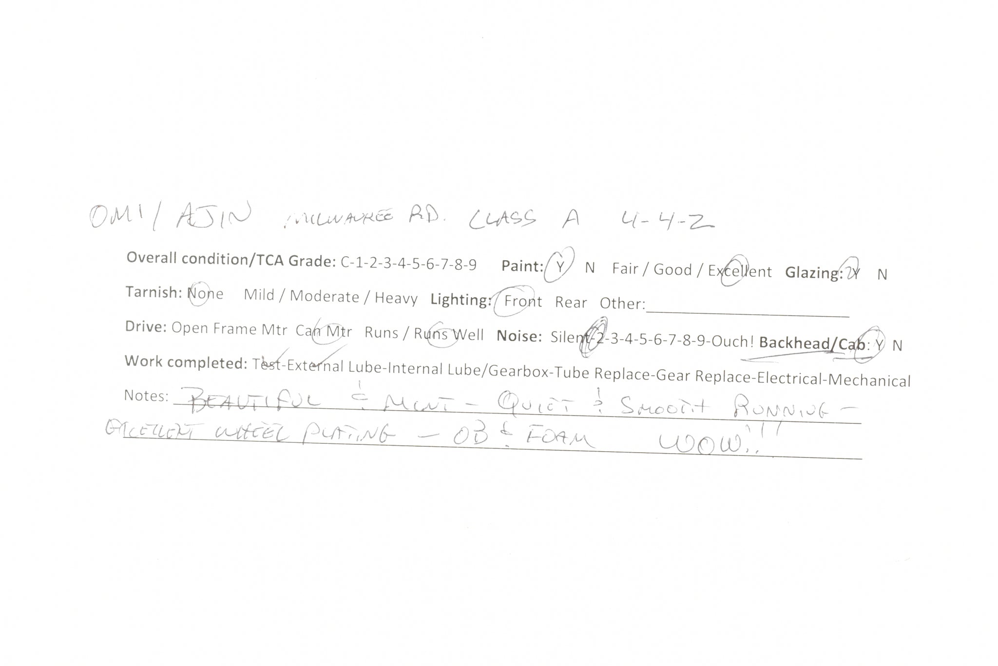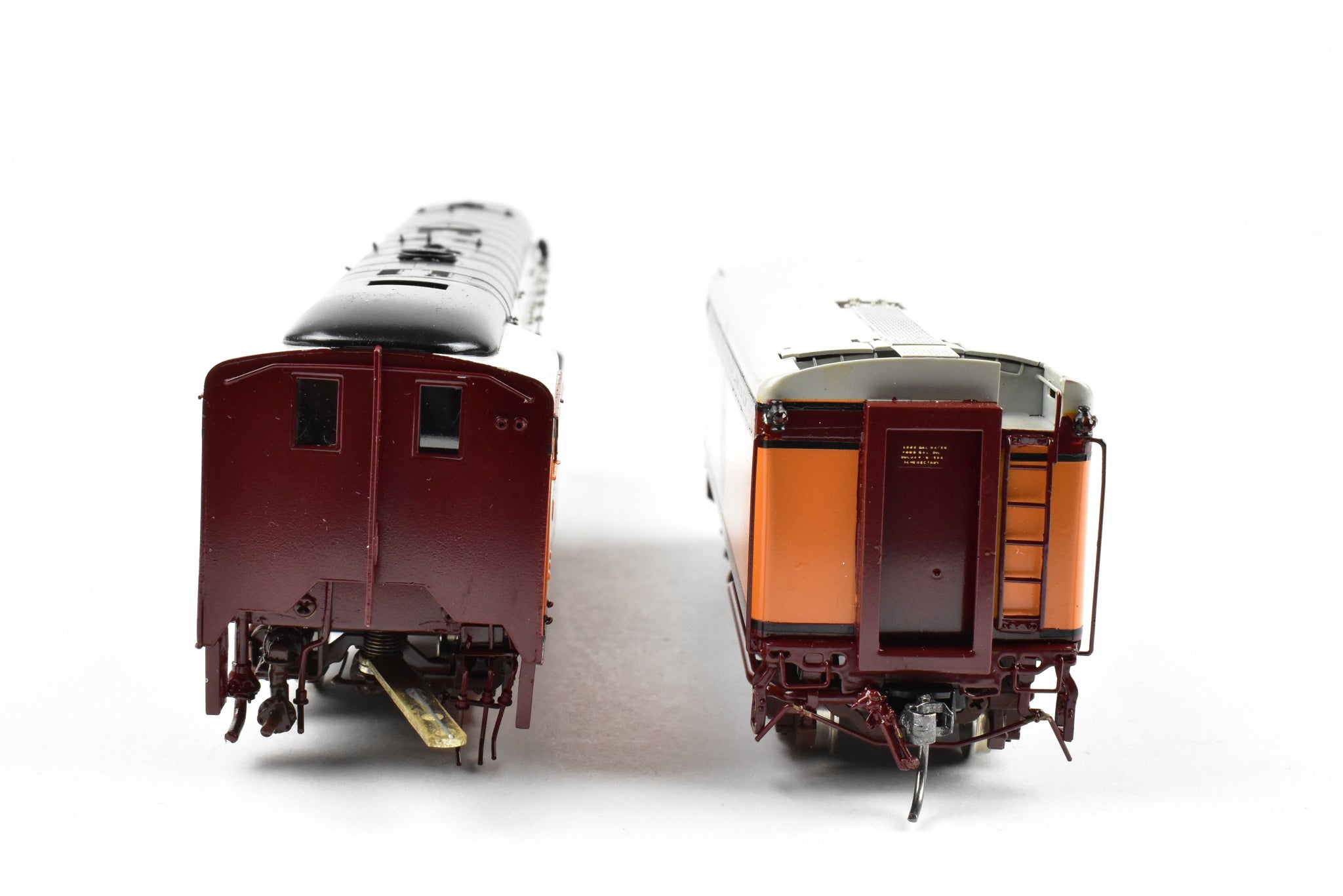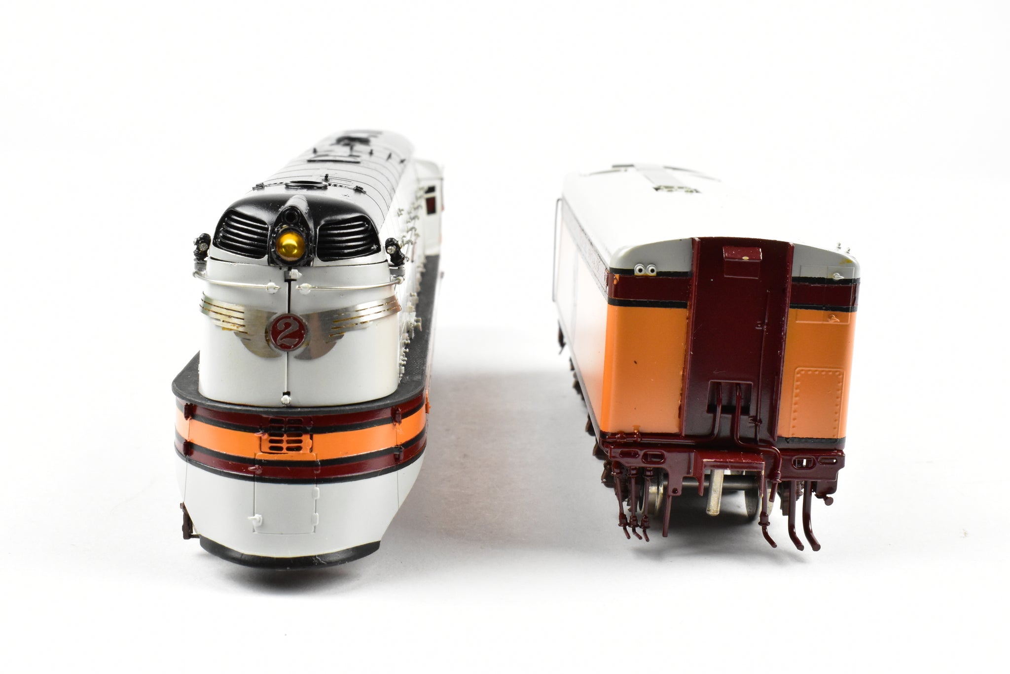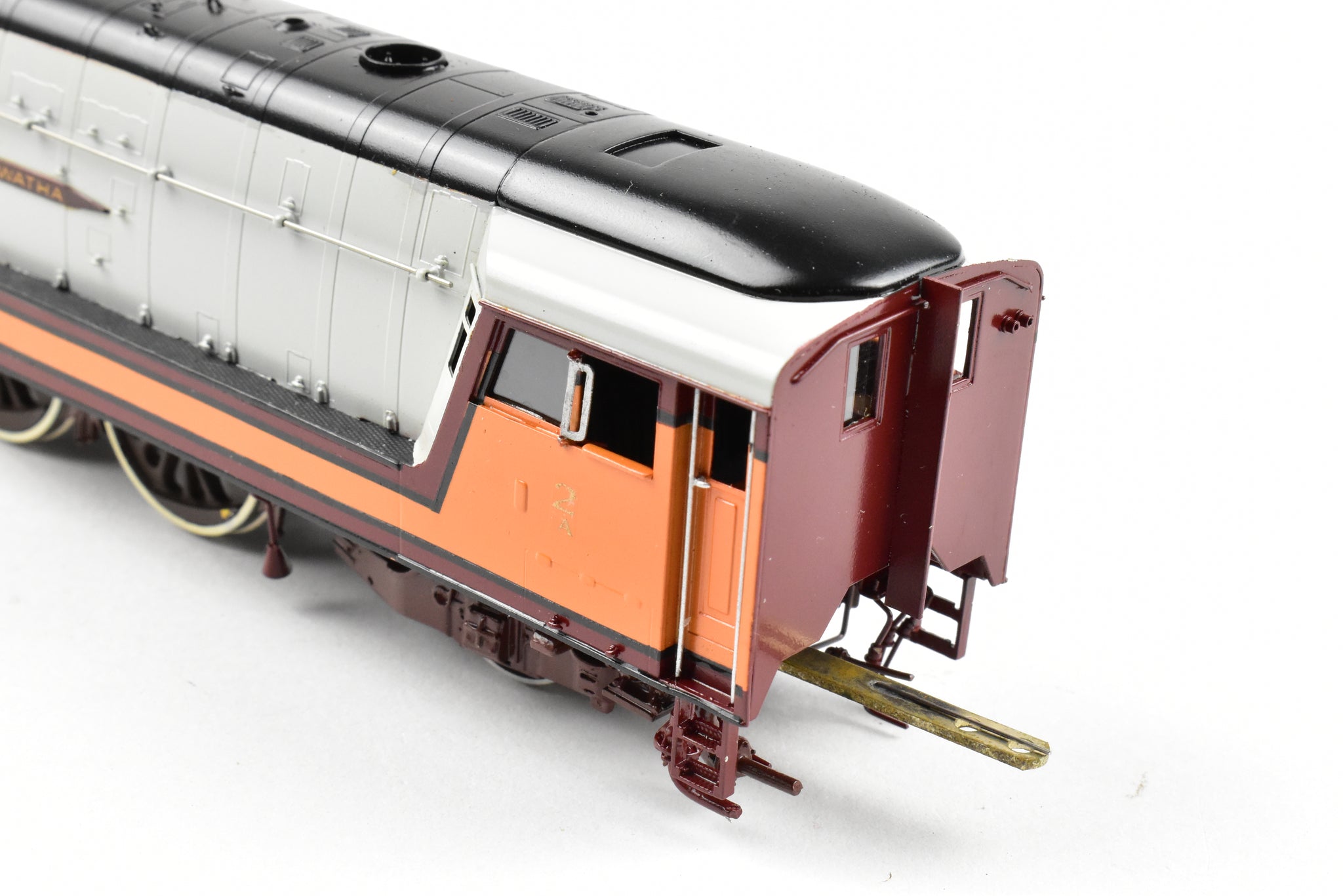 1990 run Overland Models, Inc. imported model built by Ajin Precision in Korea. Box shows almost no shelf wear. Spare parts and side rod wrench included. Modernized "Hiawatha" version. Divided streamline smokebox door covers swing open revealing detail inside. Opening hatches on rear top of streamlined tender revealing detail underneath. Sound cam on front driver axle. Very nice custom paint job with excellent finish throughout. A smooth and quiet runner that looks as good as it runs.