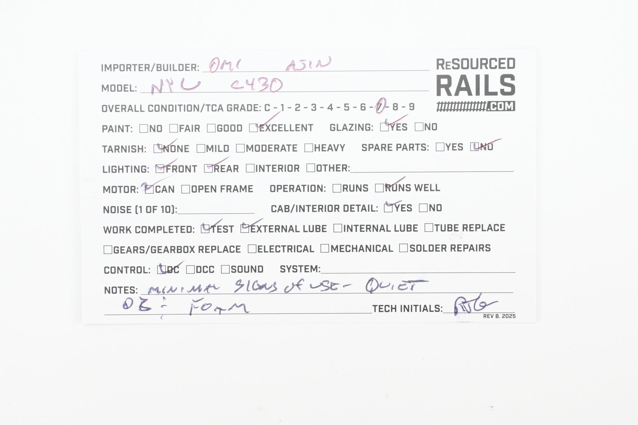 1995 run Overland Models, Inc. imported model built by Ajin Precision Mfg. in Korea. Box shows minimal wear. No spare parts included. Factory installed window glazing. Hi-Adhesion trucks on this version. These were the last 10 locomotives purchased by the New York Central arriving on the property in December of 1967, barely two months before the Penn Central merger. A very nice model with minimal signs of use and a smooth, quiet runner. This model is harder to find, as Overland Models only imported a total of 100 of the NYC C430's, broken up into four road numbers, 25 of each road number.