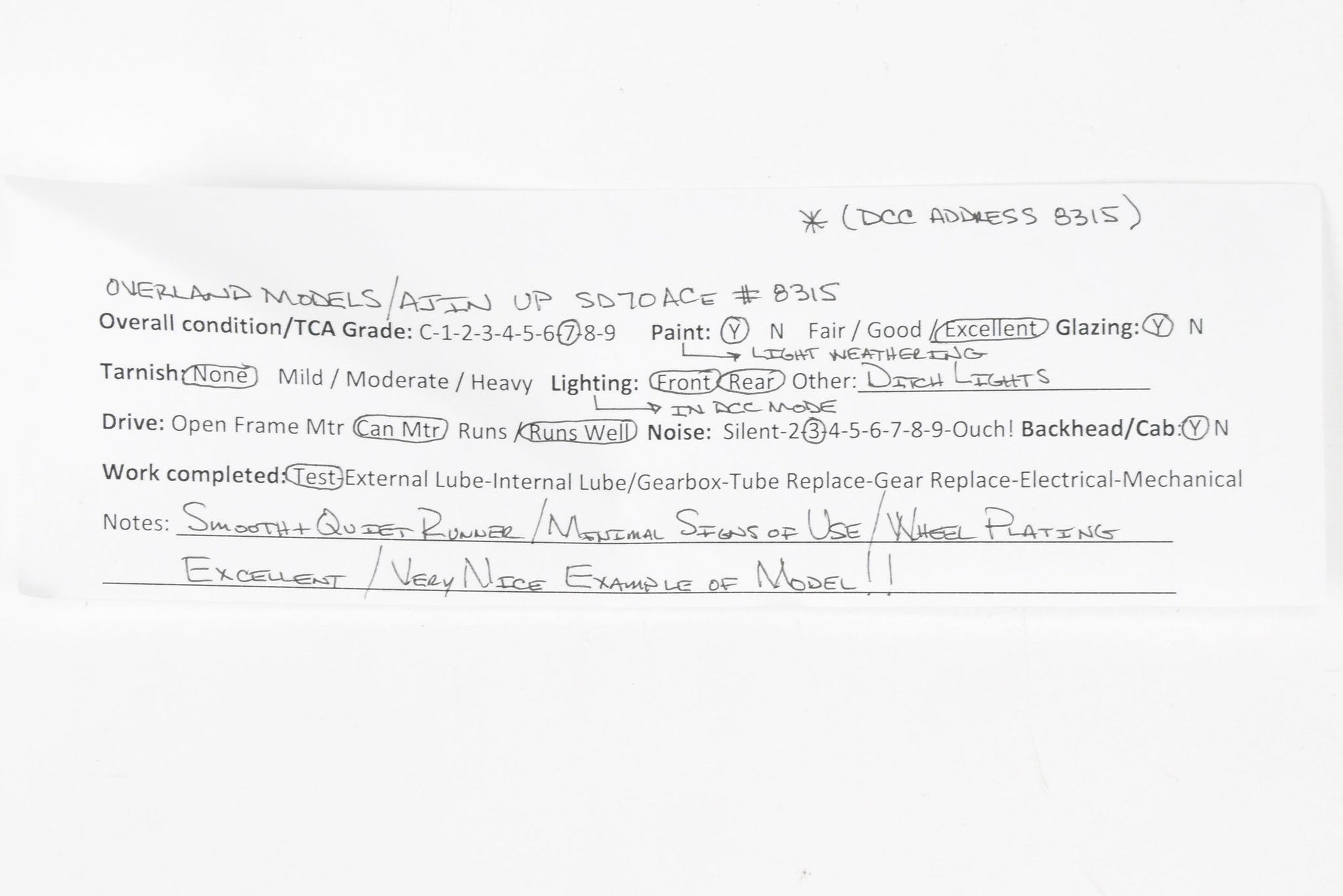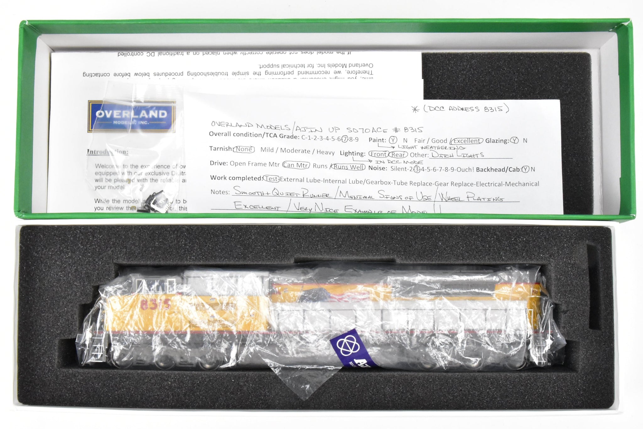 Overland Models, Inc. imported models built by Ajin Precision in Korea. Box shows minimal wear. Spare parts are not included. Excellent factory paint work with glazing in the cab. Numbered 8315. Model has been lightly weathered - see photos. Unit has working headlights and ditch lights. Model come factory equipped with Digitrax DCC Decoder installed and the address is 8315. It will also run on a conventional DC - Analog layout. An excellent example of a UP SD70ACe.