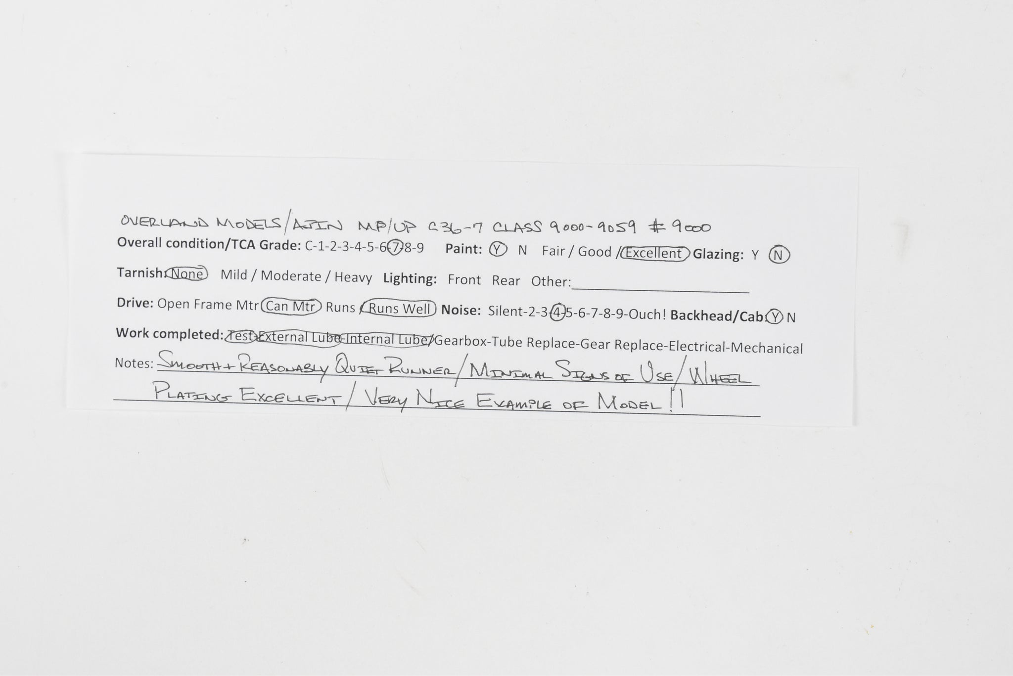 Overland Models, Inc. Imported model built by Ajin Precision Mfg. in Korea. Original box shows minimal wear. No spare parts included. Excellent Union Pacific/Missouri Pacific paint work, road number 9000. Finished with glazing in the windows and lenses in the lights. It will be an excellent addition to your motive power fleet.