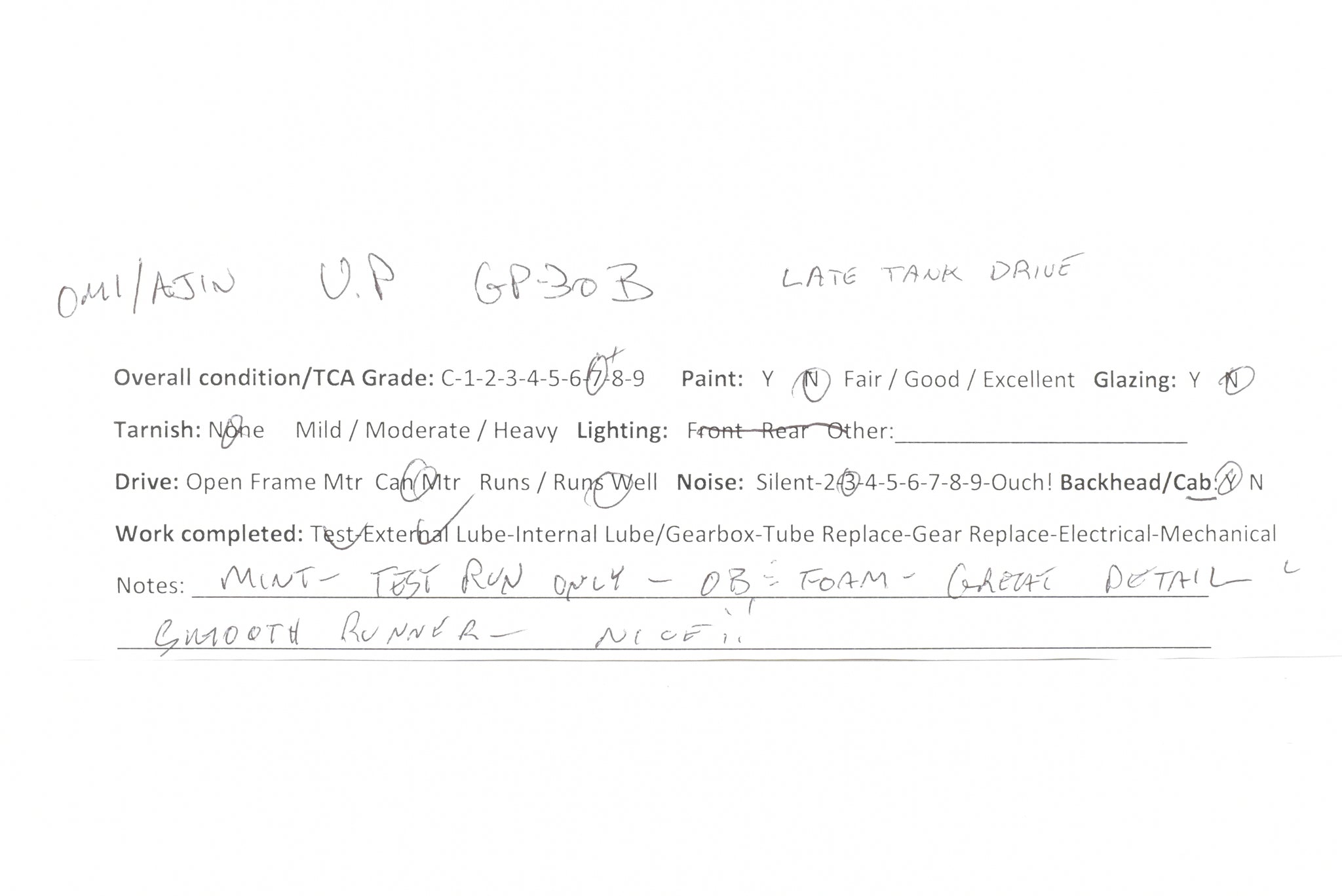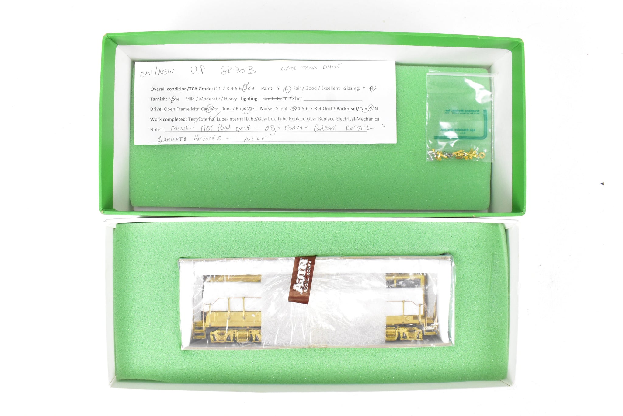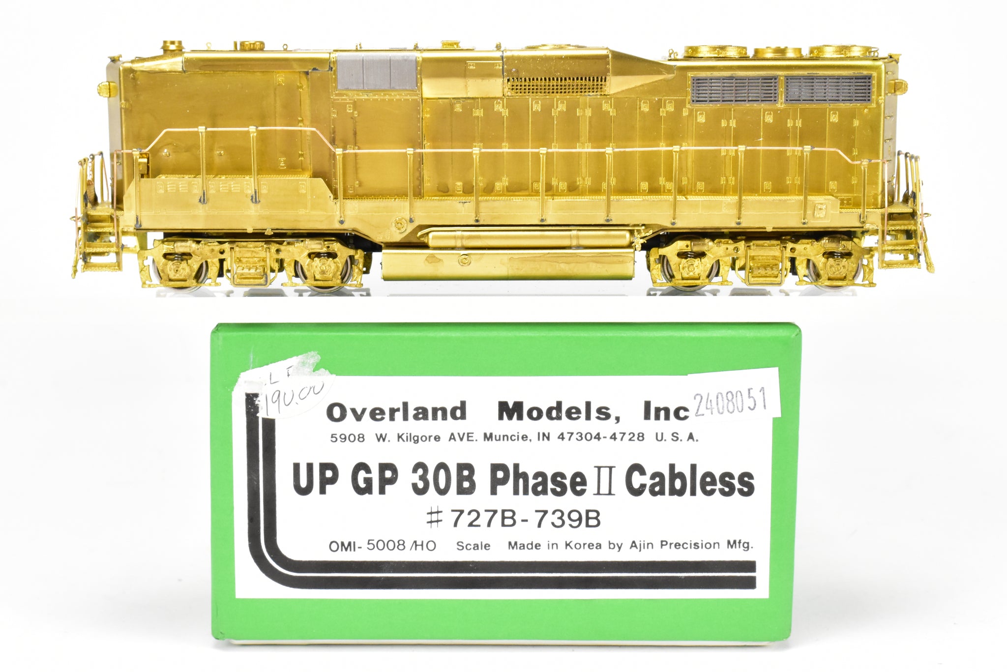 1987 run Overland Models, Inc. imported model built by Ajin Precision Mfg. in Korea. Box shows virtually no shelf wear. Spare parts included. Represents road numbers 727B - 739B of the forty GP30B's that the Union Pacific rostered. A nice running, quiet, late tank drive model. This model was brand new, except for our test run.