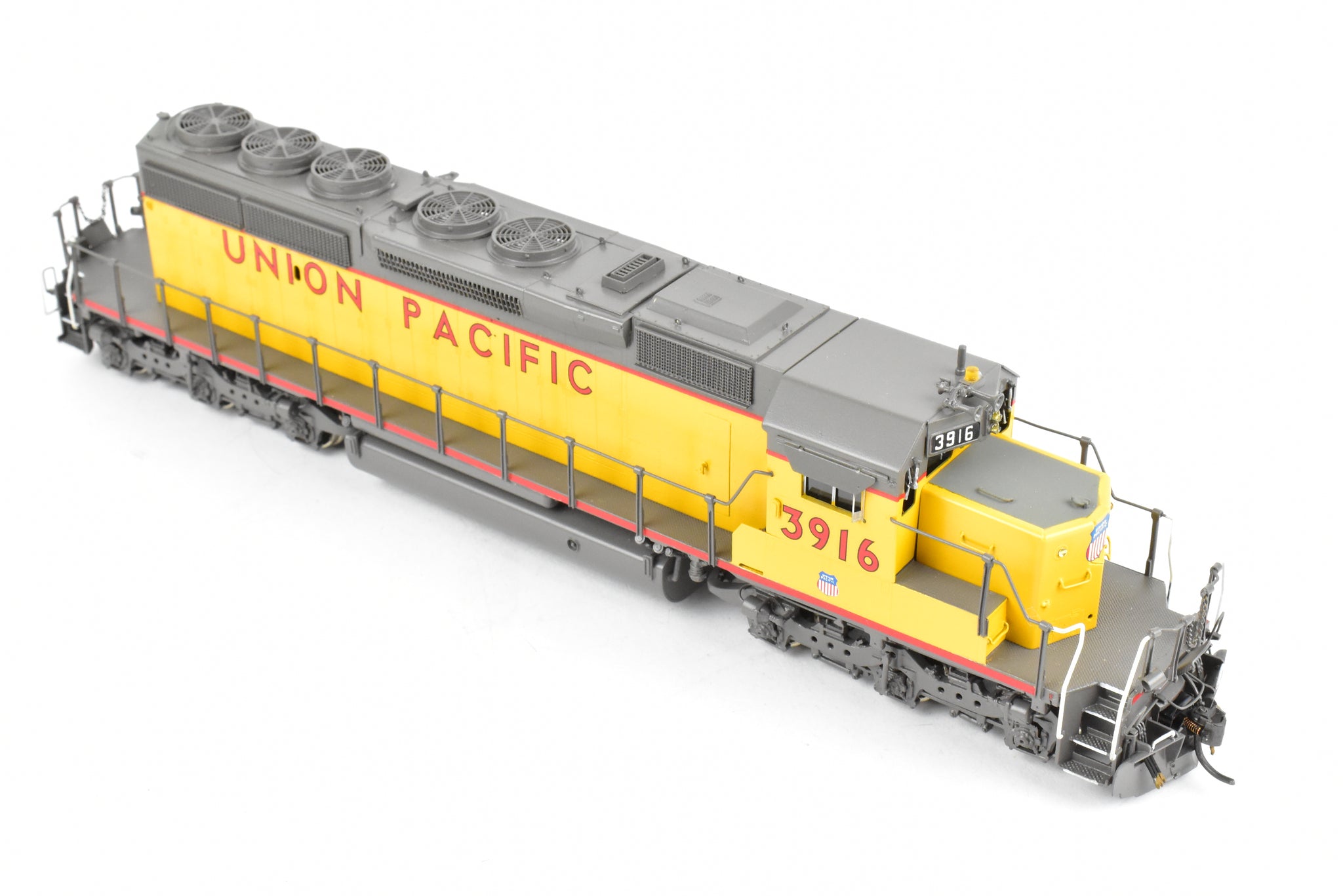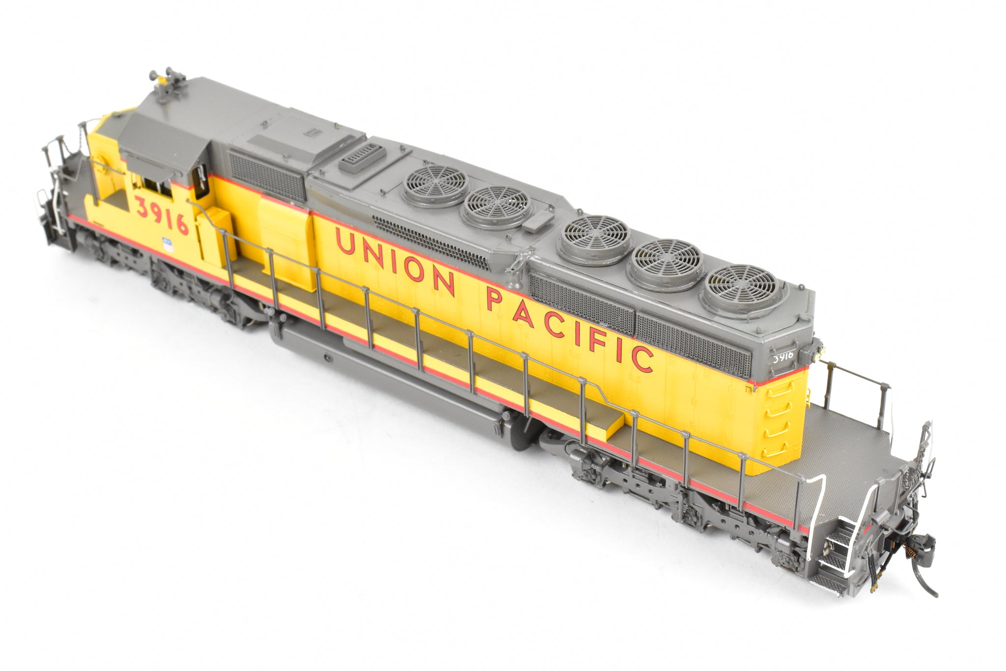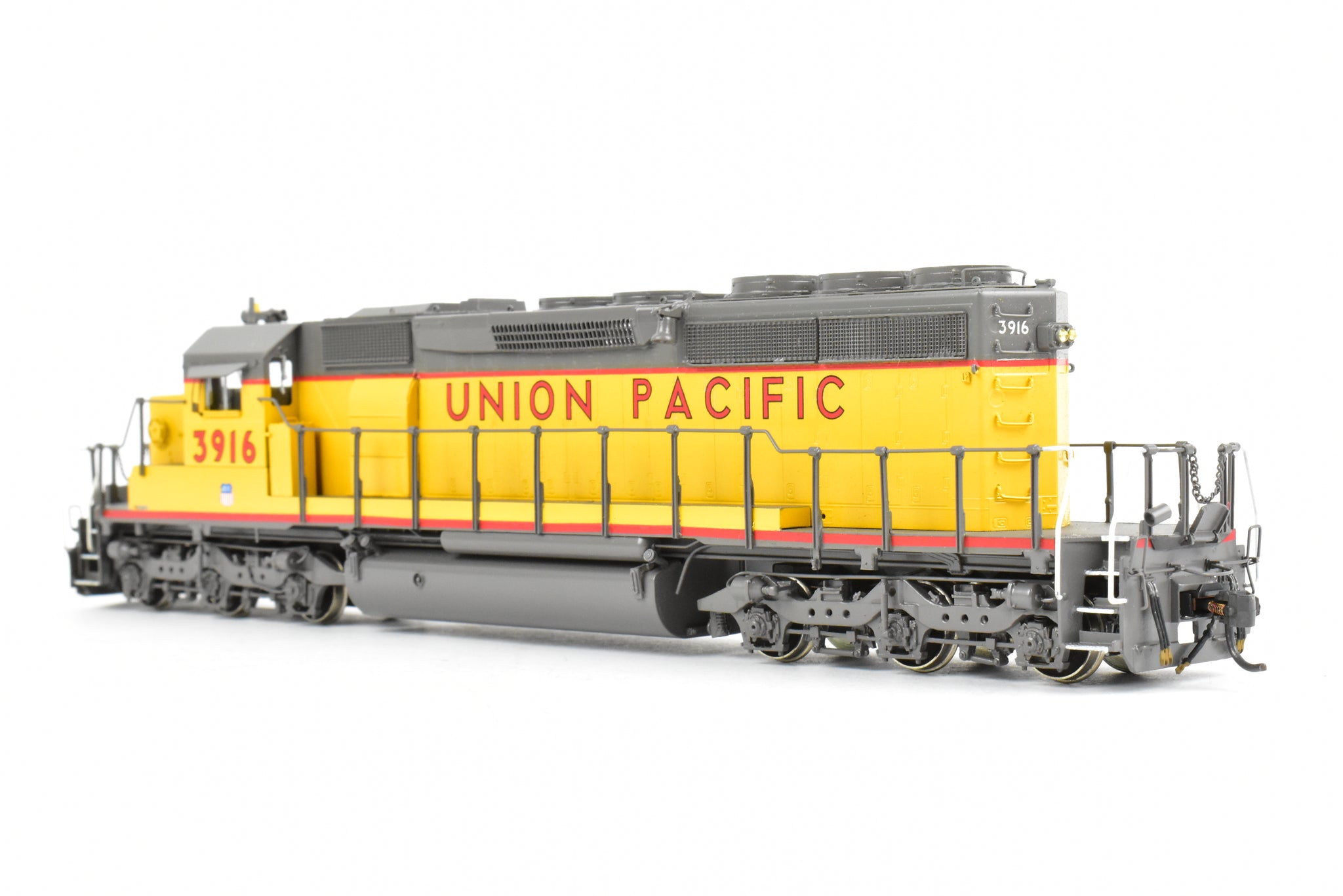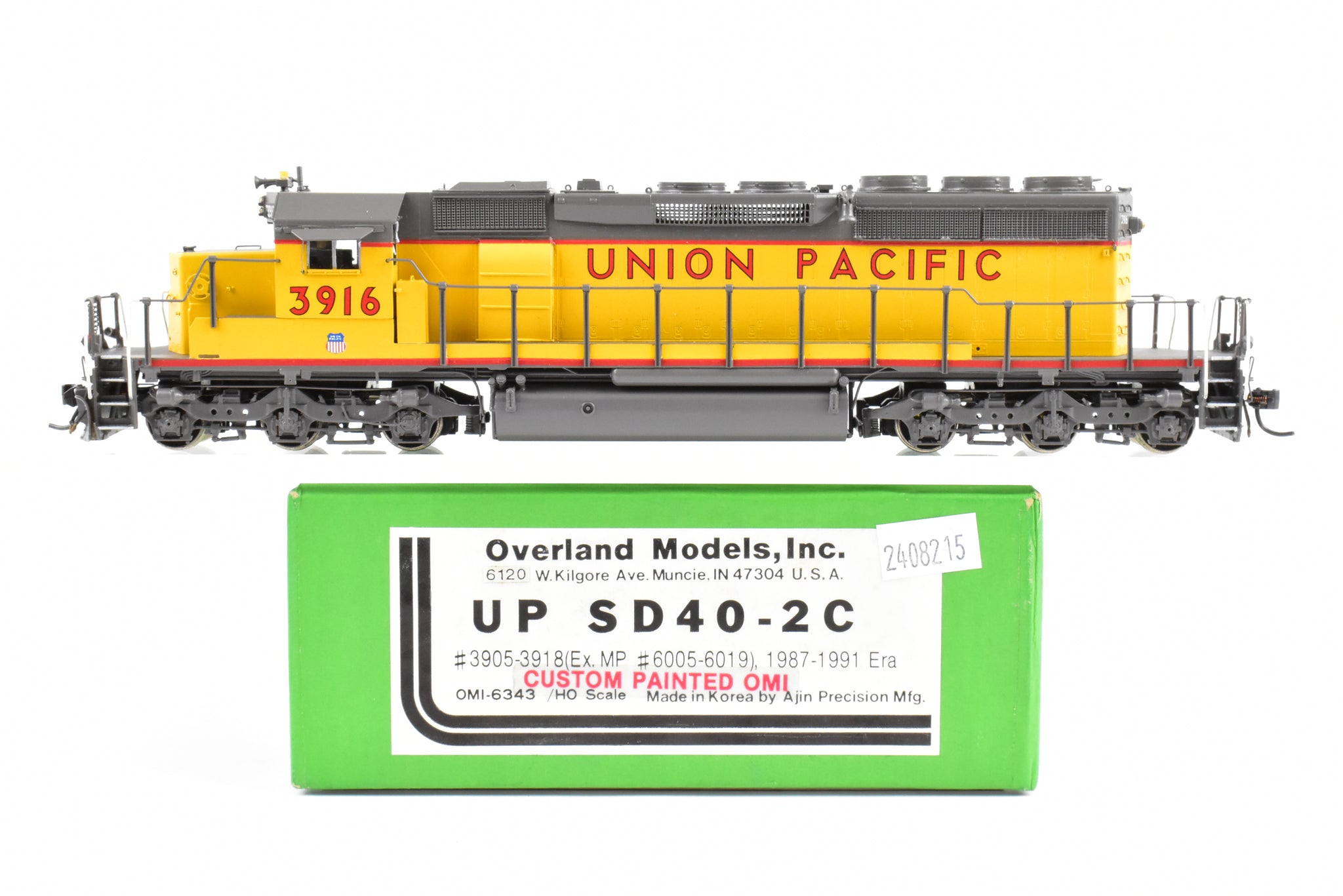 1992 run Overland Models, Inc. Imported model built by Ajin Precision Mfg. in Korea. Original box shows almost no shelf wear. Spare parts included. Represents UP road number 3916. This was one of 74 units built originally for the Missouri Pacific as their Nos. 6005 - 6019. These became UP Nos, 3905 - 3918. The "C" designation indicates modifications such as the addition of dynamic brakes and added ballast to improve the handling of the locomotive. It's a very rare and harder to find model as only 12 models of this version were imported and not all of them were painted by OMI's painters. Finished with glazing in the windows and lenses in the lights.