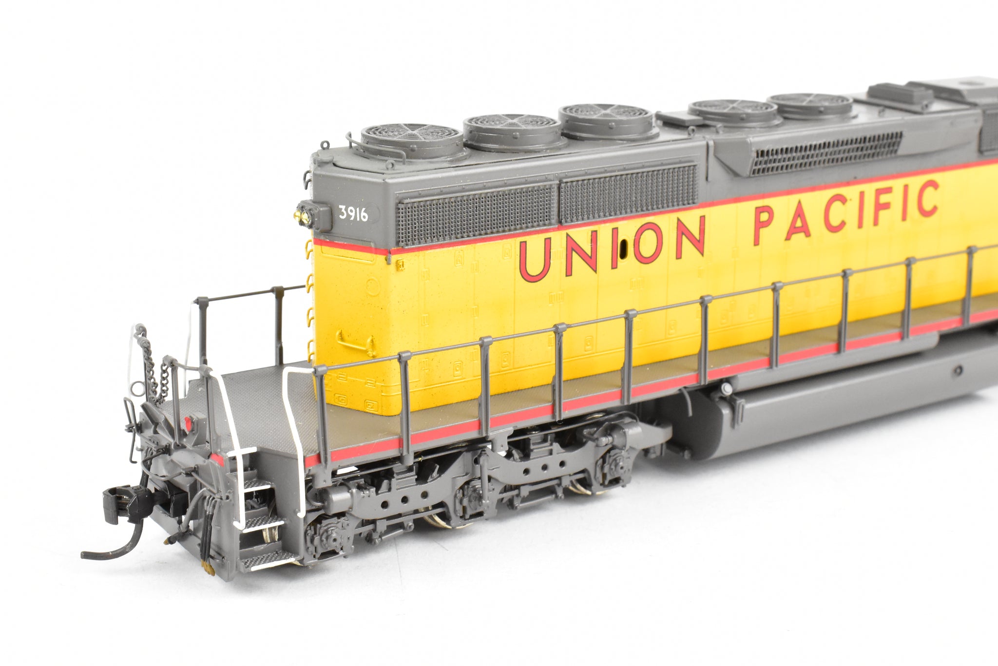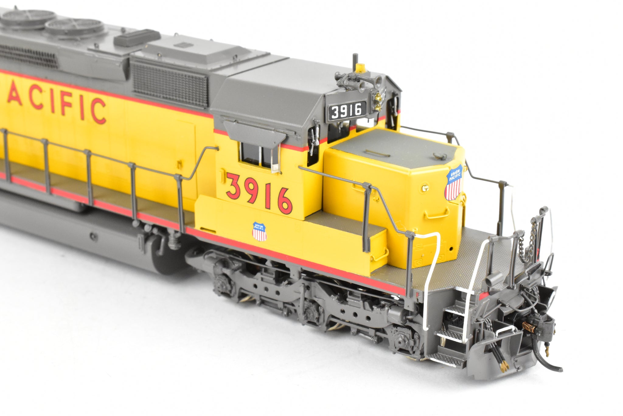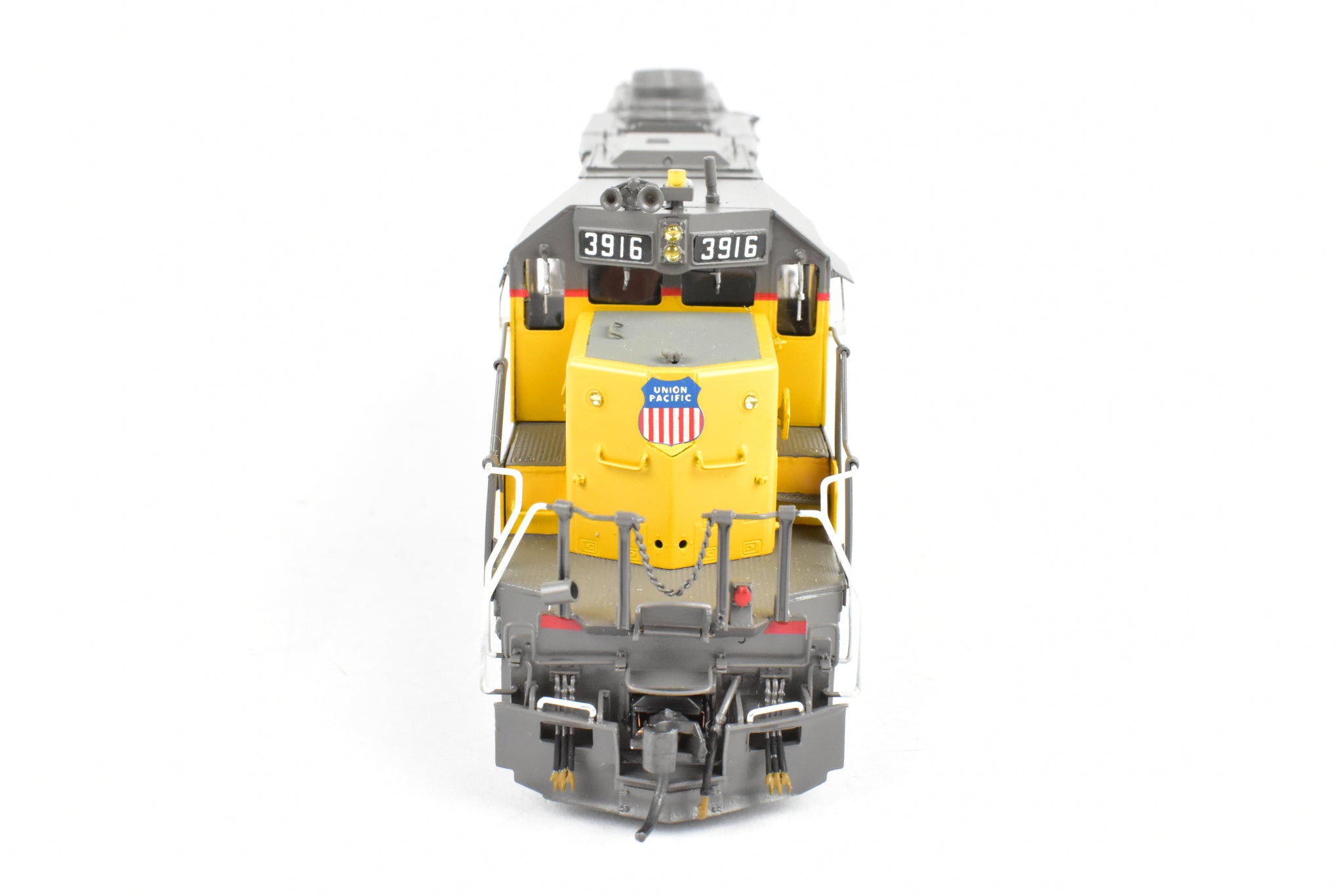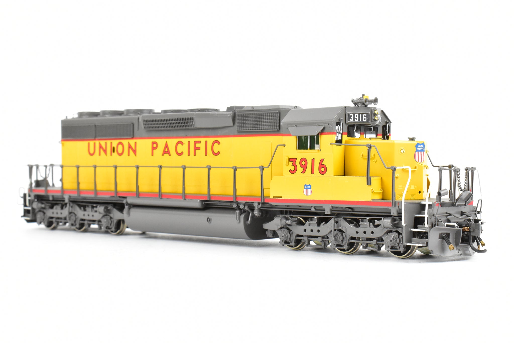 1992 run Overland Models, Inc. Imported model built by Ajin Precision Mfg. in Korea. Original box shows almost no shelf wear. Spare parts included. Represents UP road number 3916. This was one of 74 units built originally for the Missouri Pacific as their Nos. 6005 - 6019. These became UP Nos, 3905 - 3918. The "C" designation indicates modifications such as the addition of dynamic brakes and added ballast to improve the handling of the locomotive. It's a very rare and harder to find model as only 12 models of this version were imported and not all of them were painted by OMI's painters. Finished with glazing in the windows and lenses in the lights.