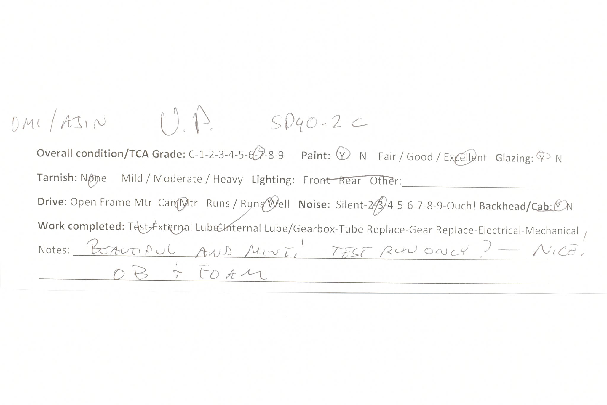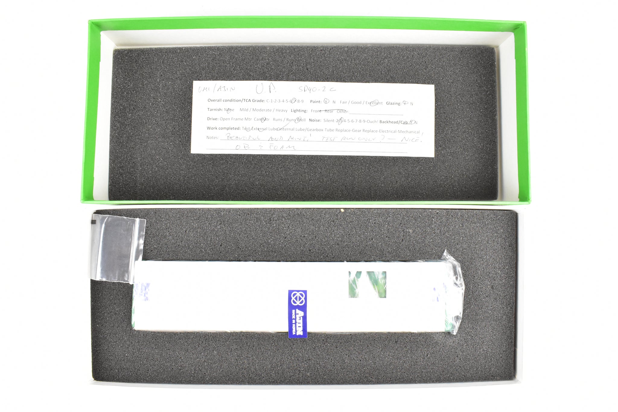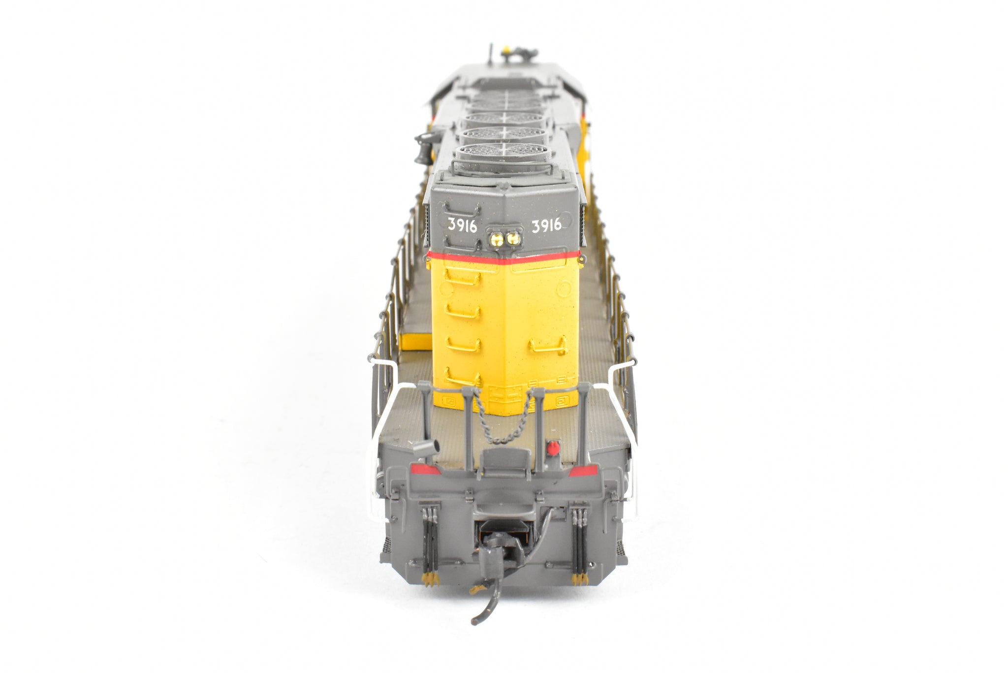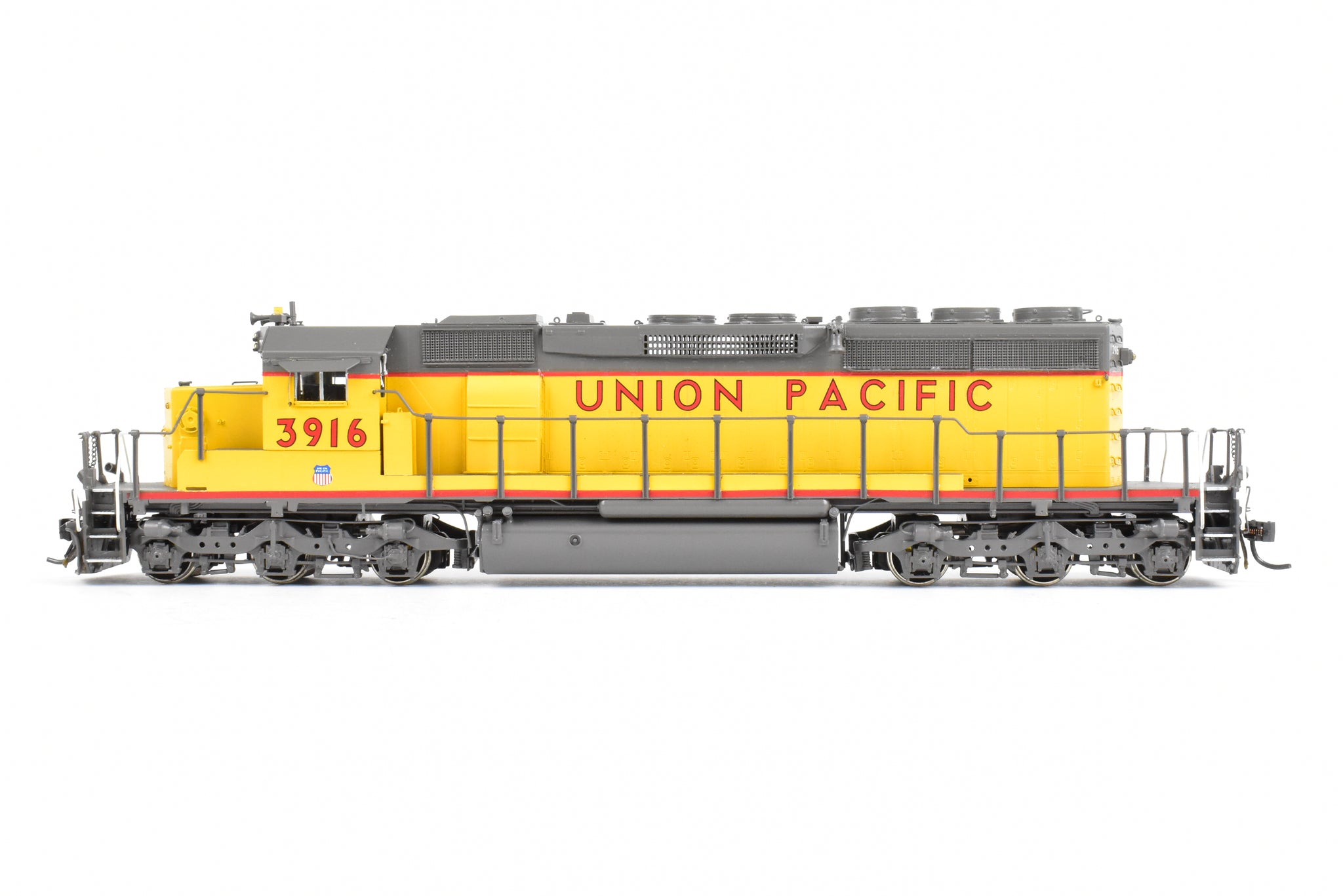 1992 run Overland Models, Inc. Imported model built by Ajin Precision Mfg. in Korea. Original box shows almost no shelf wear. Spare parts included. Represents UP road number 3916. This was one of 74 units built originally for the Missouri Pacific as their Nos. 6005 - 6019. These became UP Nos, 3905 - 3918. The "C" designation indicates modifications such as the addition of dynamic brakes and added ballast to improve the handling of the locomotive. It's a very rare and harder to find model as only 12 models of this version were imported and not all of them were painted by OMI's painters. Finished with glazing in the windows and lenses in the lights.